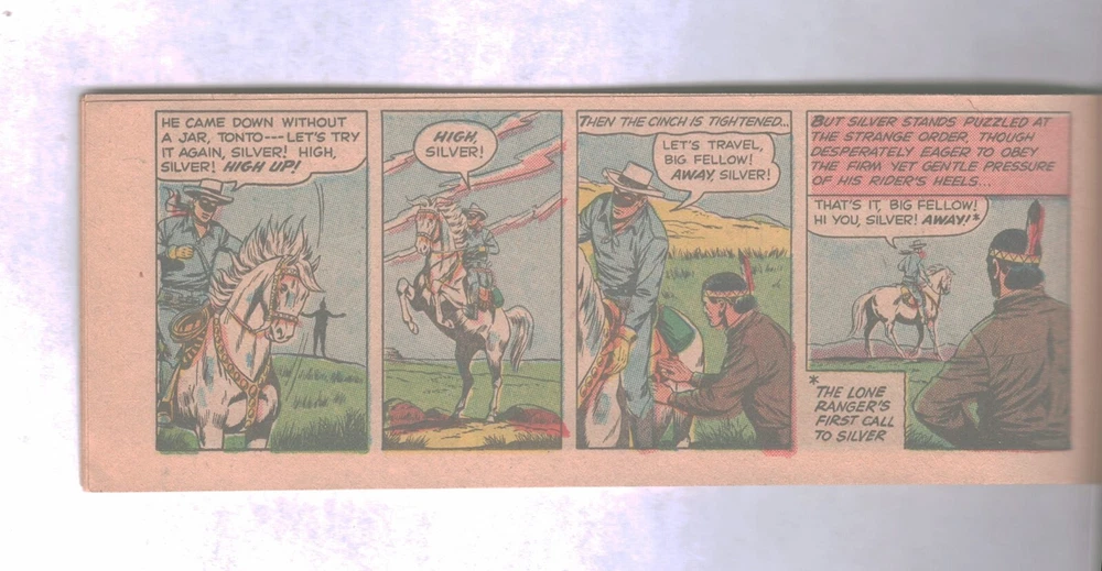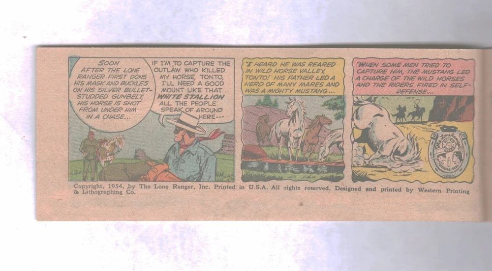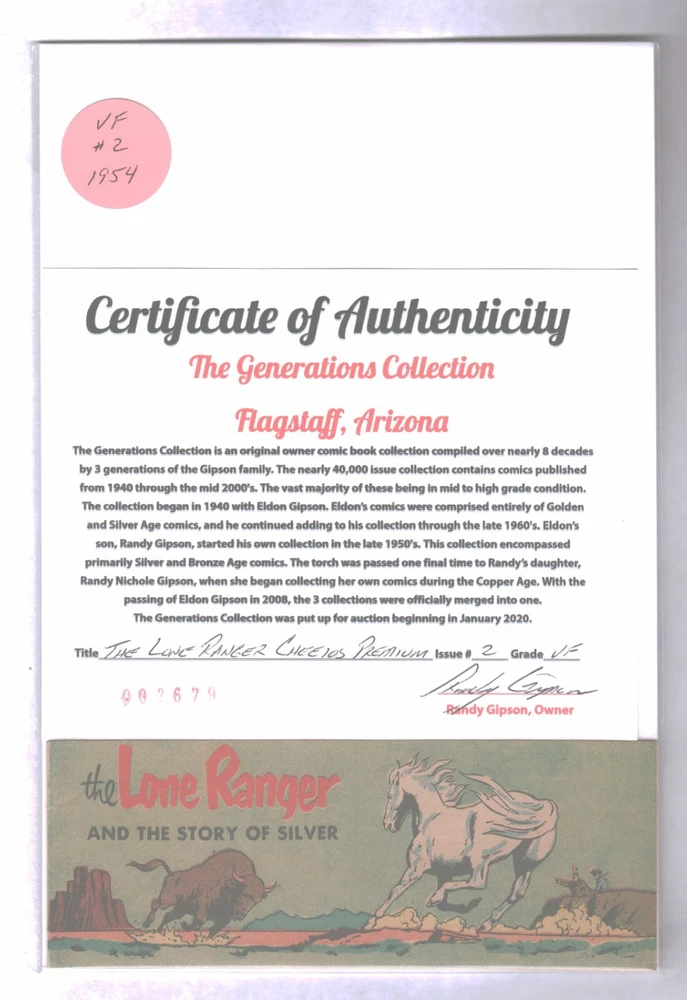 U. S. Bidders ONLY for this item. No International Shipping. THE LONE RANGER CHEERIOS PREMIUM #2 "The Story of Silver" Graded Very Fine 1954 Western Publishing Company - Golden Age Featuring The Lone Ranger, Tonto and Silver Pocket size - 16 pages Not distributed to stores Only available as a mail-in offer from Cheerios cereal Overstreet Comic Book Price Guide Value in THIS condition $69.00 * * * * * * * THE GENERATIONS COLLECTION FLAGSTAFF, ARIZONA The Generations Collection is an original owner comic book collection compiled over 8 decades by 3 generations of the Gipson family. This nearly 40,000 issue collection contains comics from 1940 to present day. Note: Not all of the comics that we sell are from the Generations Collection. Generations Collection comics can be identified by an ORANGE grading sticker on the upper left corner of the comic storage bag. All Golden, Silver and select Bronze Age comics from the Generations Collection come with a signed and serialized Certificate of Authenticity. All packages are insured for up to $100.00 at no additional charge. If you desire additional coverage, contact the seller before making payment. All comics and magazines come individually bagged and boarded. Shipped in padded envelopes & sandwiched between 4 pieces of cardboard. MAXIMUM U.S.A. SHIPPING IS $8.95 NO MATTER HOW MANY COMICS YOU BUY! (Excludes CGC & PGX Graded Comics) I will combine shipping costs for winners of multiple auctions. Combined shipping costs apply to auctions won during the SAME calendar week. U. S. Bidders ONLY for this item. No International Shipping. Track Page Views With Auctiva's Counter
