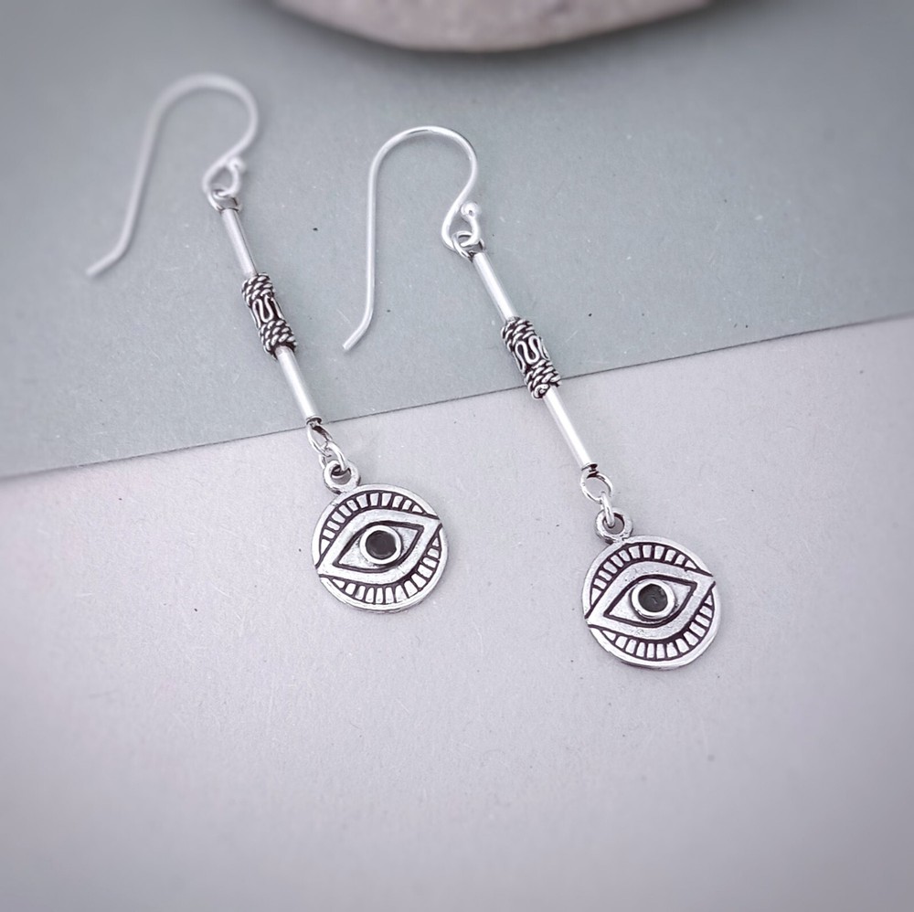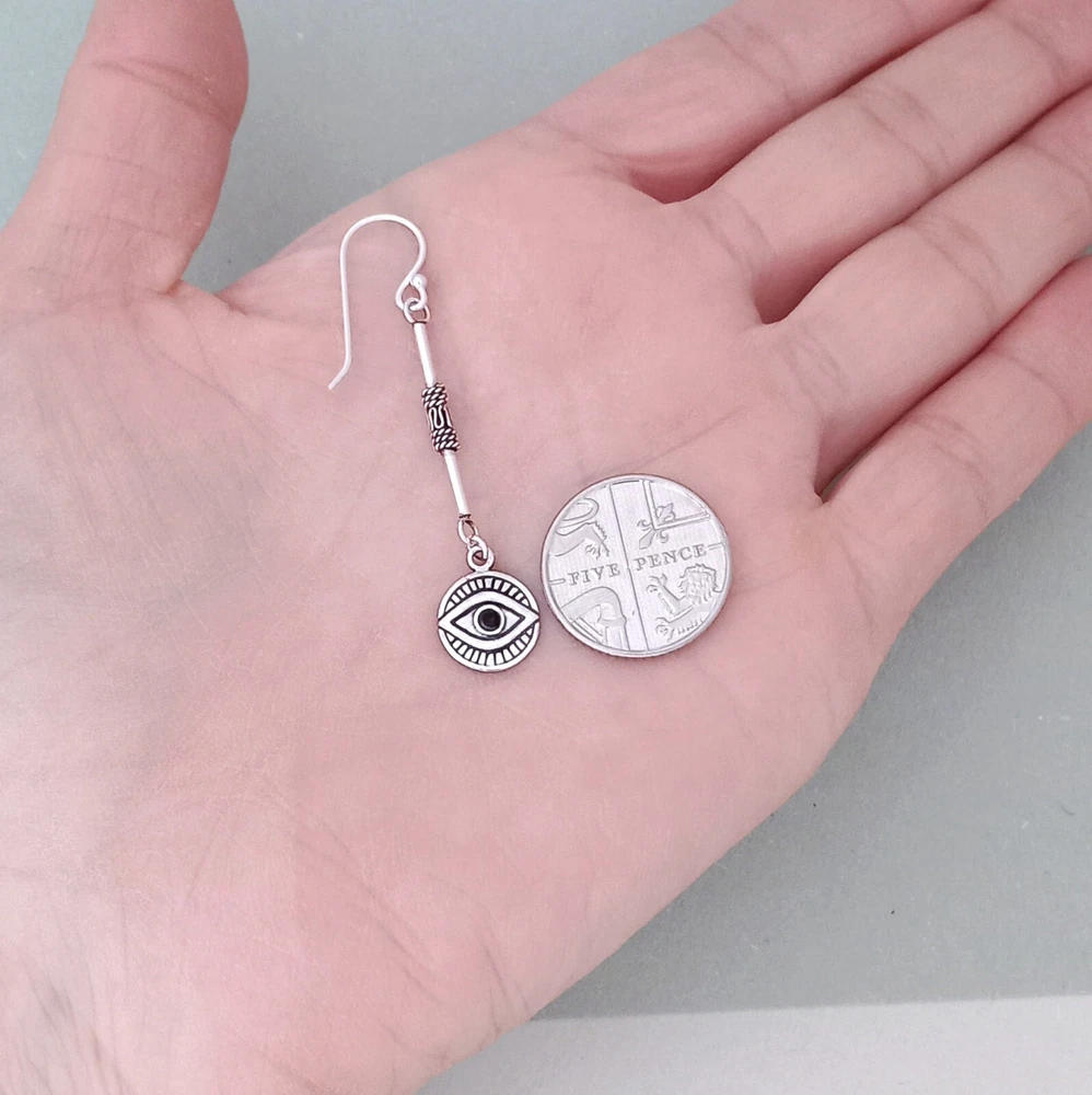 Protective Evil Eye long dangle earrings in sterling silver. Nickel FREE. Round Evil Eye long dangle earrings is sterling silver. Cute oxidised eye symbol charm hanging from an ornate bar, evoking ethnic patterns and a typically Boho style. A very popular symbol to ward off negative vibes and protect the wearer. Meaningful jewellery gift for her. Buy Now! Dimensions: Drop length including hooks: 5 cm Diameter: 1 cm Total weight approx: 2.45 grams. Delivery Information All items dispatched from the UK. Item will be carefully packaged in eco-packaging to safeguard it during delivery and our branded cotton pouch ready as a gift. Standard Tracked 48 Shipping with Royal Mail or Yodel included FREE. Tracking number details will be sent after dispatch (which is usually within 1 working day of purchase. Weekends/festivities excluded). Faster shipping options also available for the UK. Worldwide shipping available with Royal Mail Tracked & Signed. Returns accepted within 14 days of receipt. At customers’ expense.