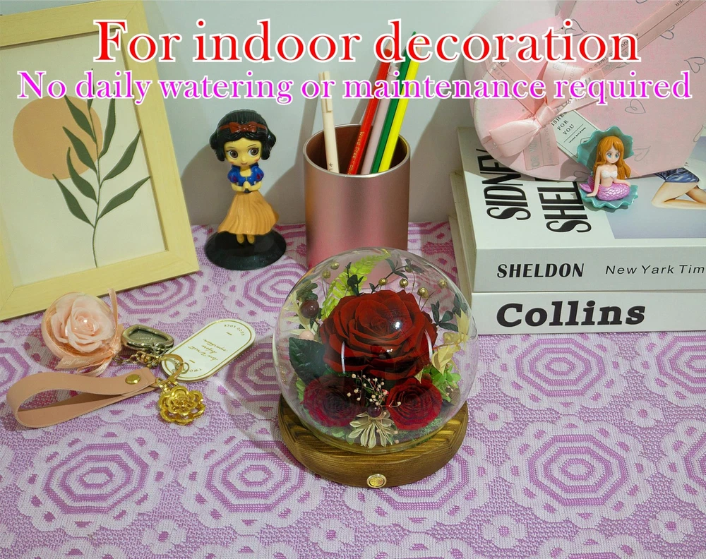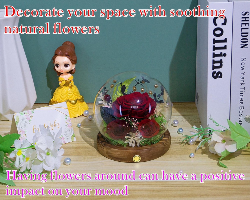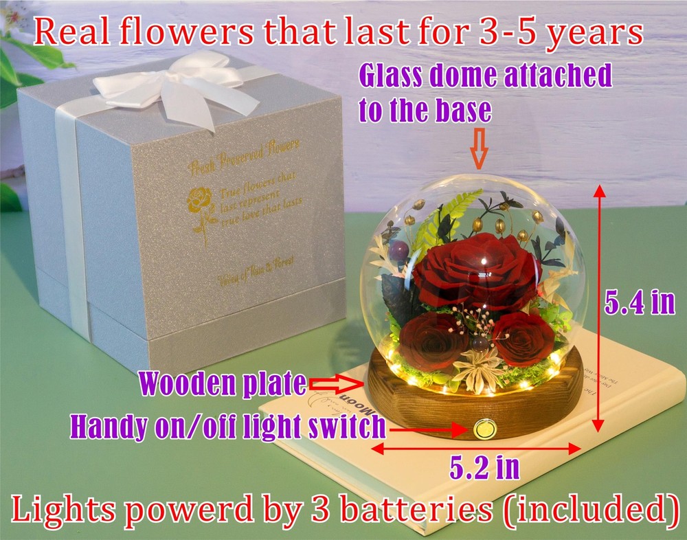 Red roses are a timeless choice to convey deep feelings of passion, love, and affection. They are particularly popular and iconic for Valentine's Day and anniversaries, a classic choice for expressing romantic love and are often given as a token of deep affection and devotion. In addition to romantic occasions, red roses can also be given on Mother's Day to express love and gratitude to mothers. ♥100% real flowers that last for 3-5 years♥: They, including all small flowers, are natural flowers cut at their most beautiful moment and preserved by maintaining their original suppleness, shape, brightness. They can last for 3 to 5 years, allowing you to have fresh flowers without daily watering or maintenance and enjoy their blooming beauty every day. ♥A "sweet" gift to make her feel loved♥: If you're searching for a meaningful gift for someone special in your life, consider the beauty & symbolism of carnations & roses. They've long been associated with love & affection, making them a "sweet" choice for anyone you hold dear. Seeing your loved one light up with happiness is a priceless feeling, and these flowers have the ability to evoke those emotions. Plus, their long life span can serve as a lasting reminder of your love & appreciation. ♥Comes with all you need for a gift♥: They come packaged in a nice-looking gift box, containing everything you need to make your gift special. The box includes three batteries to power the lights, so your recipient can enjoy the lighted effect of the flowers during the night. It also comes with a greeting card that allows you to write down what is deep down inside your heart, and best wishes for the recipient. With this special gift, you can show your loved one just how much they mean to you. ♥Natural decoration that evokes positive feelings♥: Having natural flowers in your space not only enhances its appearance but can also have a positive impact on your mood and creativity. The presence of natural elements can make you feel more connected to nature and uplift your spirits. So, incorporating flowers in your surroundings can be a wonderful way to improve both the aesthetics and ambiance of your space. ♥Why Choose Us♥: Every flower is made by hand and heart and examined carefully to ensure you get quality flowers, and to make sure you get what you expect we display the flowers with real photos. You are more than welcome to send us feedback and suggestions through which we can serve you better in the future. ♥Please note♥:1. Due to the delicateness of natural flowers, opening the glass dome is not recommended as it can lead to unintended damage to the flowers. 2. Since these are real flowers crafted by hand and not mass-produced by machine, there may be slight variations in certain cases. 3. loose and incorrect battery insert will result in lights not turning on. If that's the case, simply remove the batteries and reinsert them correctly. 4. We've recently made new improvements to our products for you. For more details, simply go to the bottom of this page.