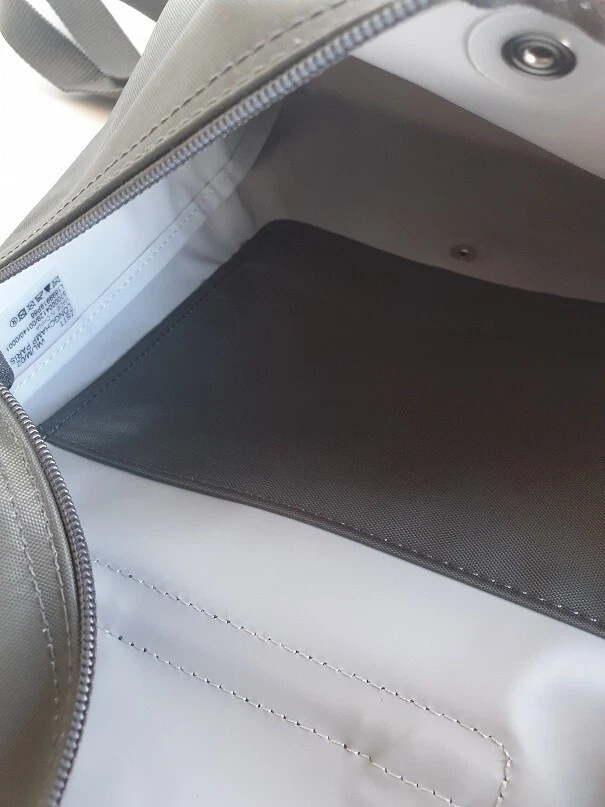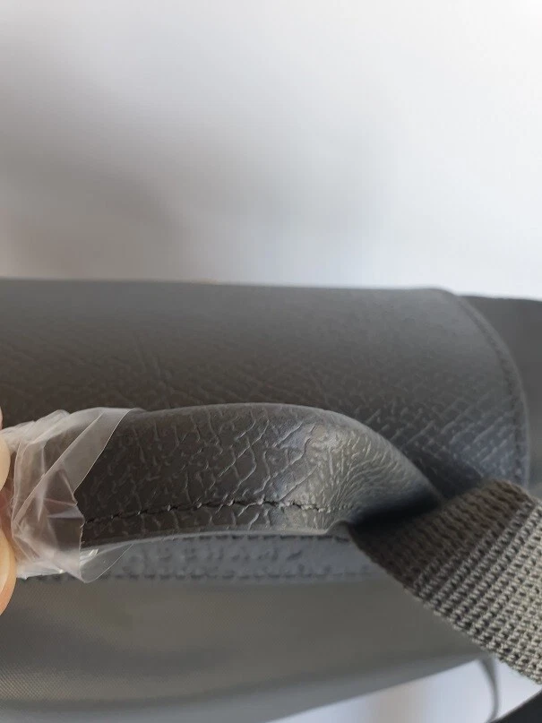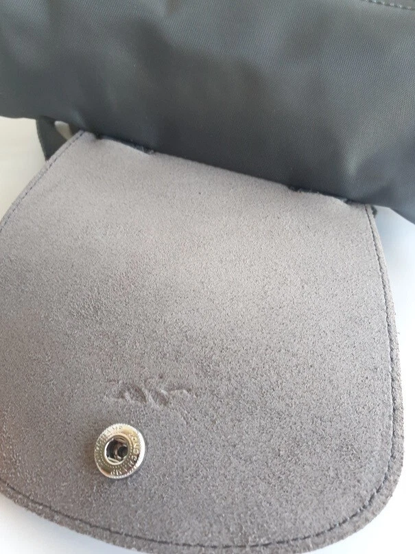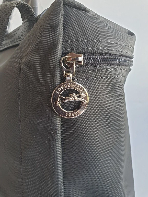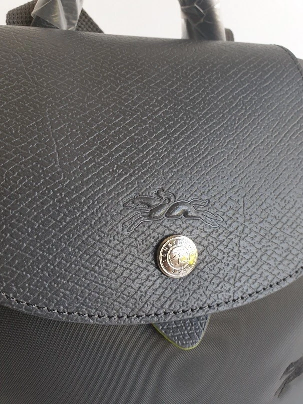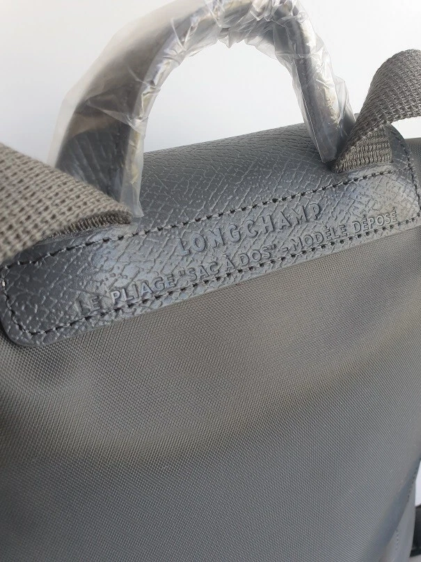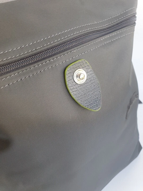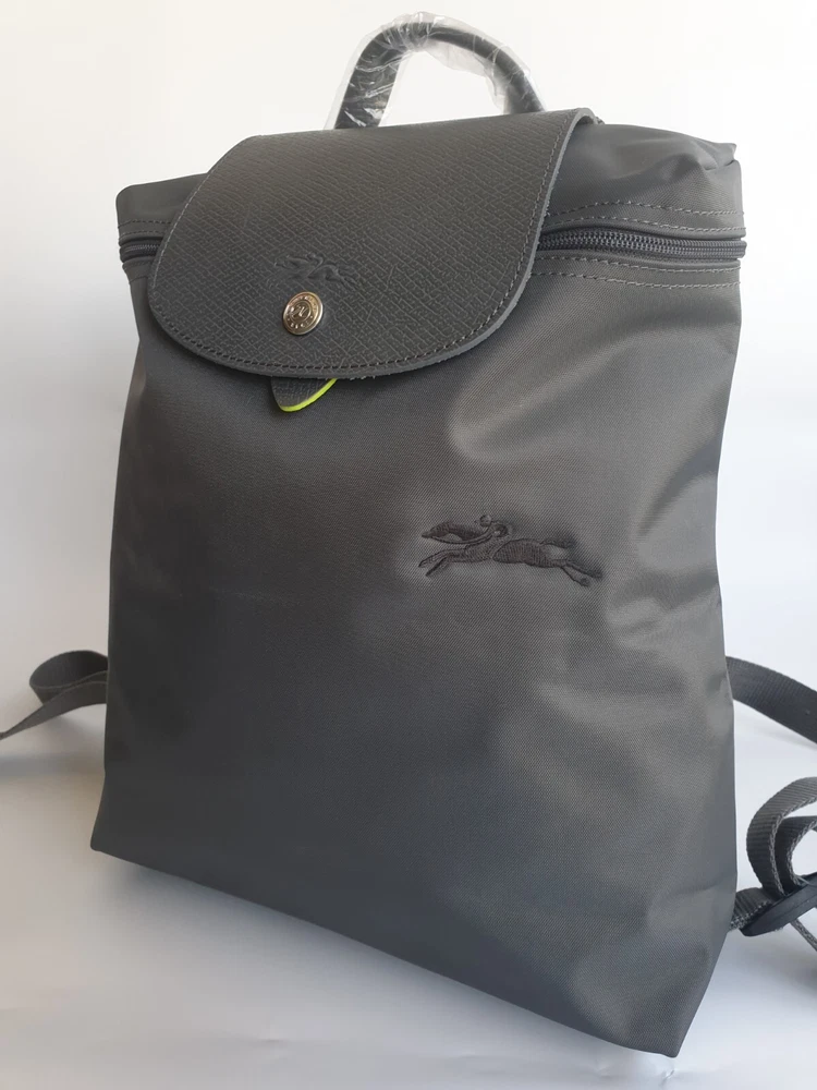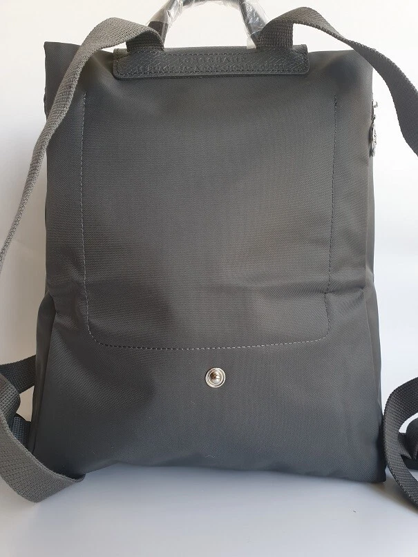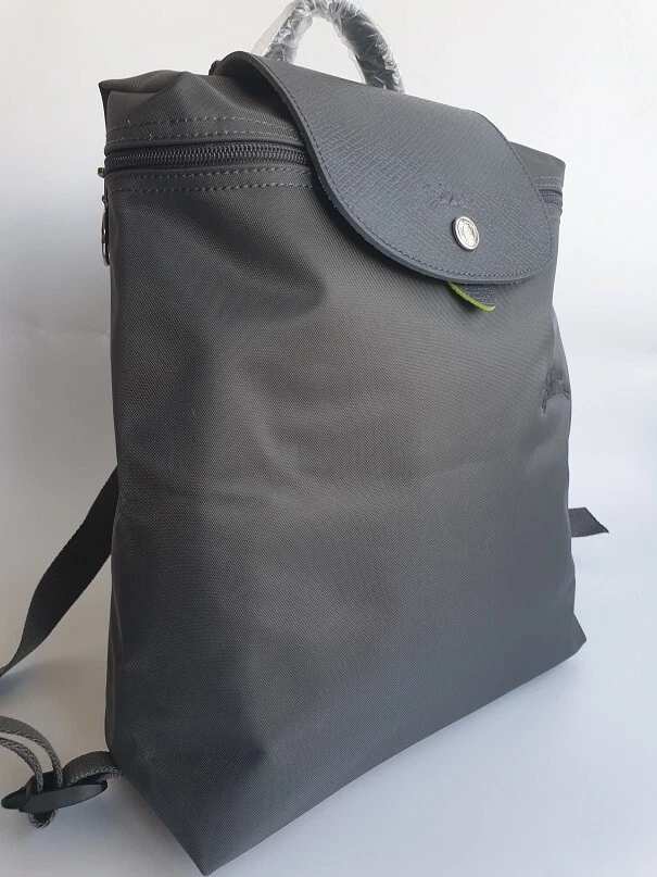 New Unused Longchamp Graphite Green Le Pliage Folding Backpack. Features: * Approximate dimensions: 10.25"W x 11"H x 4"D , Handle 2" drop * Two adjustable shoulder straps * Zipper and snap closure * Interior patch pocket * Silvertone hardware * Trim: leather * Imported
