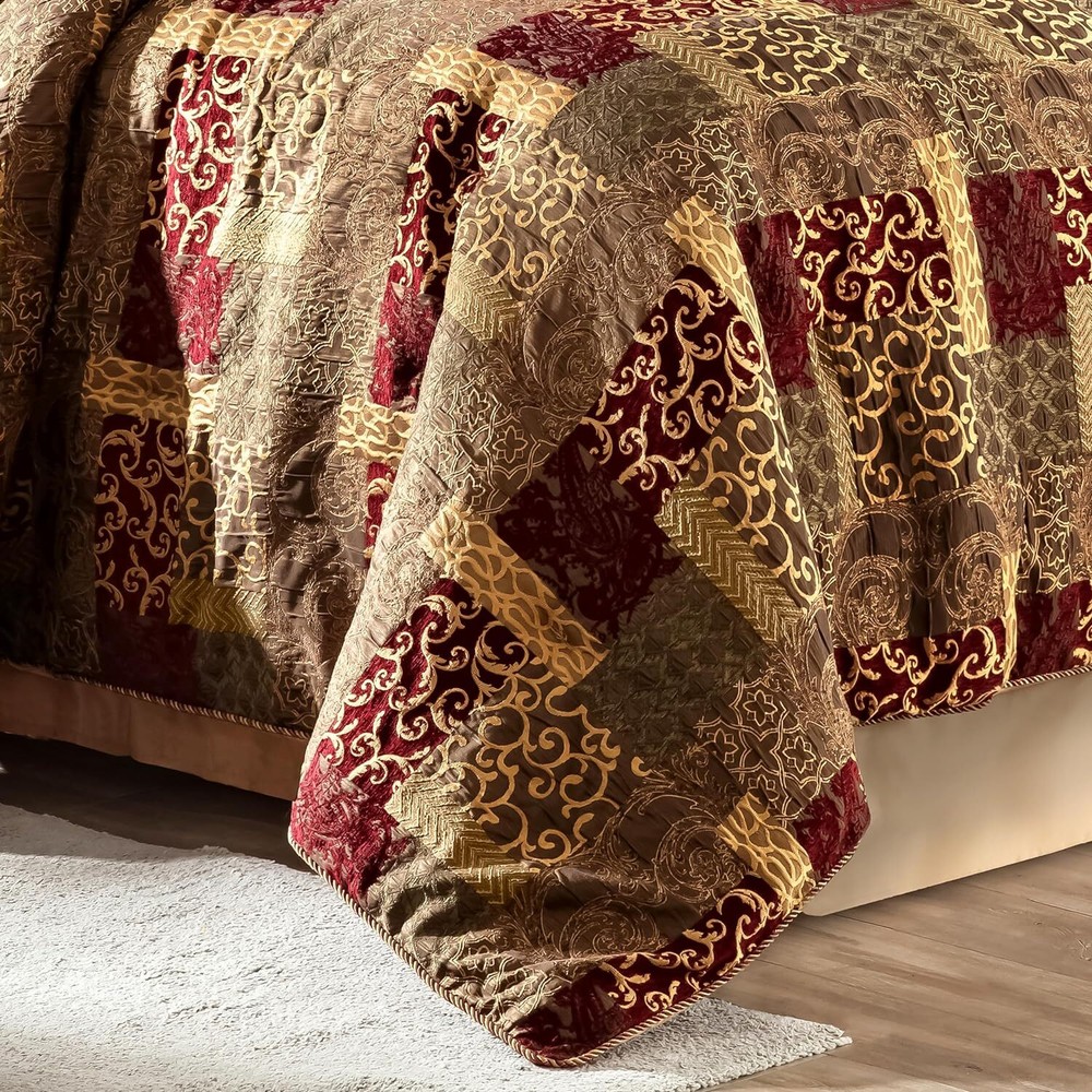 Loom and Mill 9-Piece Jacquard Comforter Set, Luxury Traditional Patchwork Comforter Queen Sets, Ultra Soft Bedding with Euro Shams, Bedskirt, Filled Decorative Pillow for Home Bedroom (Loong, Queen) Item Description About this item Synthetic Fiber DRY CLEAN ONLY: Made of high quality chenille fabric and advanced synthetic fiber, our luxury textured Queen Comforter Set is soft, skin-friendly, breathable and comfortable. With down alternative fill, suitable for all year round. GORGEOUS COMFORTER SETS: This Luxurious Patchwork Christmas Jacquard Comforter Set features an excellent combination of paisley, floral, damask and diamond patterns, the impressive traditional design imbues this beautiful ornate bedding set full of elegance, creating a unique look to the bedroom. 9-PIECE SET: 1 Queen Comforter(92”x96”), 2 Standard Shams(20”x26”), 1 Bed Skirt(60”x80” with 18” drop), 2 Euro Shams(26”x26"), 2 Decorative Pillows with PP filling(18”x18"), 1 High Pick Embroidered Pillow(13”x13”) TOP WORKMANSHIP: Combined with the weaving process and hand-made crafts, you can feel the great quality from every neat and tight stitching. The superb rolling rope edging and 300d high-density yarn count make this Queen Comforter Bedding Set more refined and durable. Loom and Mill Comforter Bed in a Bag set is made with strict quality control standards, and we are so confident you will love our products. If you have any questions, please feel free to contact us, we are willing to assist you. › See more product details Made of traditional chenille damask fabric, this 9-piece comforter set contains 8 different patterns, rich in color. We used two-color rolling rope for hemming sewing, make this bedding set more beautiful and durable. The decorative pillow is carefully engineered with beads and tassels, which look smart and delicate. This luxury bedding set comes with 3 different styles of decorative pillows, 1 logo pillow, 1 fake fur pillow and 1 square pillow with tassels, all of them are filled with fluffy PP. The bed skirt has a decorative stripe running vertically and a 18" drop, good drapability. 2 Standard Shams (20 "x 26") in traditional patchwork style. 2 Euro Shams (26 "x 26") in four-leaf clover pattern. Payment We accept payment only through PAYPAL Shipping We ship products worldwide through standard express courier service, it will reach within 7 to 10 days to abroad buyers, we ship the product after recieved clear payment and give full information about shipment to the buyer Return We accept product return within 7 to 21 days from delivery date but product should be in original position and not in damaged condition,the return shipping charges will be buyer responsibility