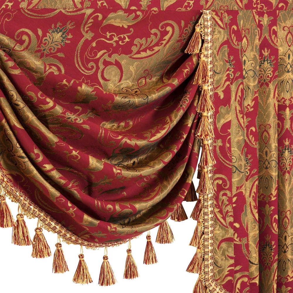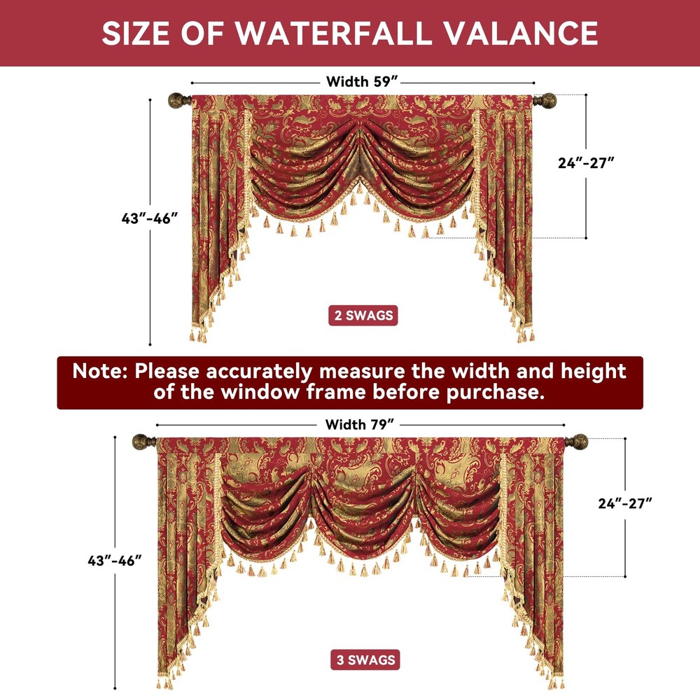 Loom and Mill Luxury Waterfall Valance for Living Room, Classic Damask Jacquard Swag Valances with Tassels, Red Swag Curtains for Bedroom Windows Banquet Christmas Decor, Rod Pocket(W79Inch,1 Panel) LUXURY ELEGANT DESIGN: Decorate your home window with this stunning and opulent swag valance curtain. Features classic damask pattern with exquisite and flexible tassels, our window valances are good in drapability and will create infinite warm and elegant ambiance for your room. JACQUARD WATERFALL VALANCE: 1 Panel Packaged. 79” width, swag 24”~27” long, casecade 43”~46”long. 3” Rod Pocket fits any standard/ decorative curtain rods up to 1.5” in diameter, easy to install. Please accurately measure the width and height of the window frame before purchase. PREMIUM MATERIAL: Made of high quality fabric, this swag curtain is thick, soft and durable for long time use, can well block out part of the light, and protect furniture from direct sunlight while helping to enhance privacy. Wrinkle-resistant, no fade, not easy to get dust compared with velvet fabric. EXCELLENT WORKMANSHIP: Combined with the weaving process and hand-made crafts, you can feel the excellent quality from every neat and tight stitching. This waterfall swag valance is perfect for various occasions, such as living room/ bedroom/ dining room/ kitchen/ study/ bathroom.... CARE & GUARANTEED: Hand wash or Spot Clean, iron low before hanging. PLEASE NOTE that the actual color may vary slightly due to different lighting conditions or display settings. Visit the “Loom and Mill” brand store for more matching products. Loom and Mill Luxury Valance of Window Curtain(Red,79x18in) Shipping We offer FREE shipping on all orders! We ship within Three business days of payment, usually sooner. We use a selection of shipping services such as UPS, FedEx, USPS etc. We only ship to the lower 48 states, no APO/FPO addresses or PO Boxes allowed. Local pickups and combined shipping options are not provided at this time. Return You can return a product for up to 30 days from the date you purchased it. Any product you return must be in the same condition you received it and in the original packaging. Please keep the receipt. Payment We accept payment by any of the following methods: PayPal Please pay as soon as possible after winning an auction, as that will allow us to post your item to you sooner! Feedback Customer satisfaction is very important to us. If you have any problem with your order, please contact us and we will do our best to make you satisfied. Contact Us If you have any queries, please contact us via ebay. We usually respond within 24 hours on weekdays. Please visit our eBay store to check out other items for sale! Thank you for shopping at our store.