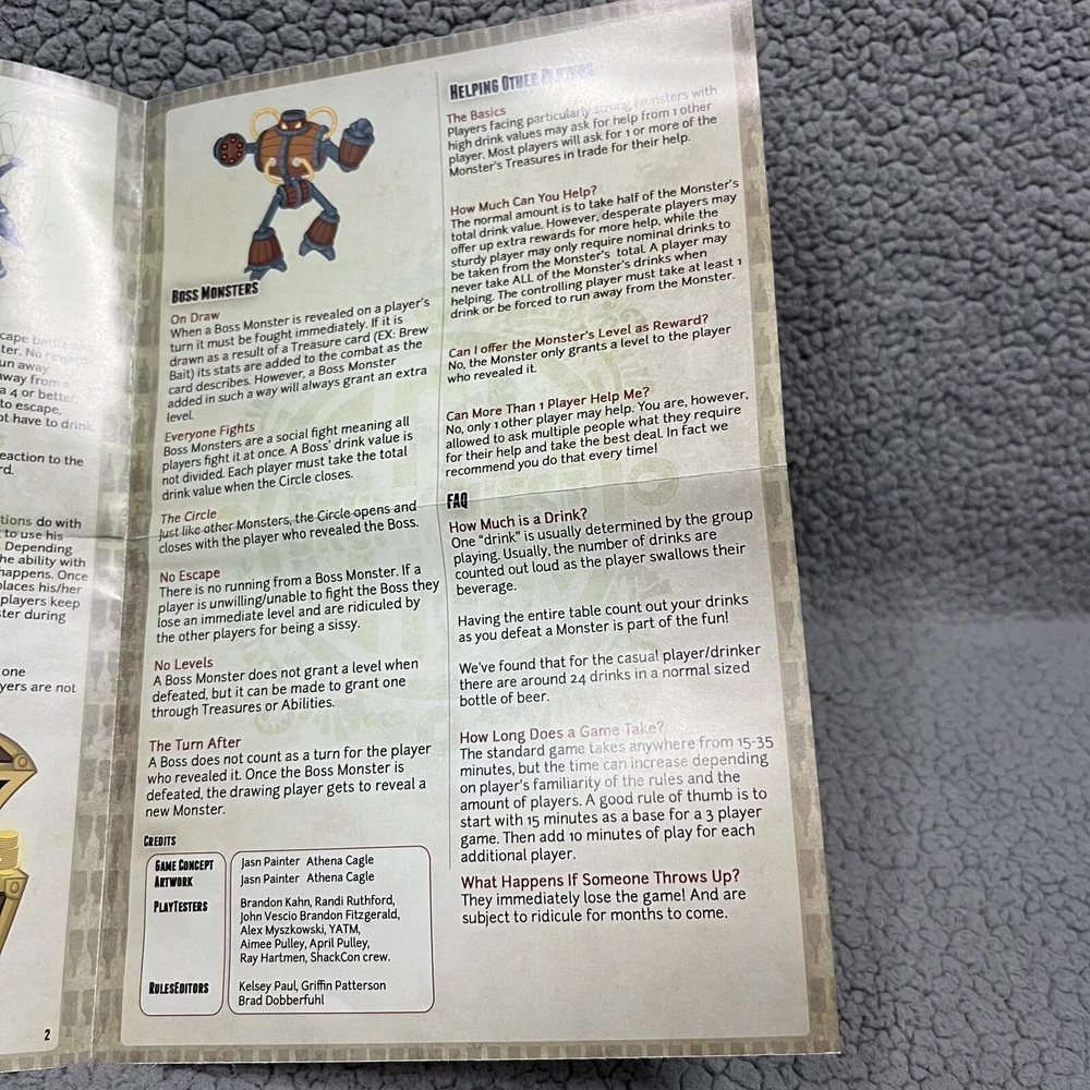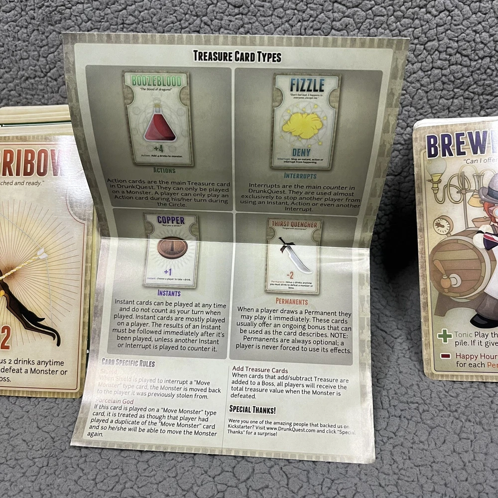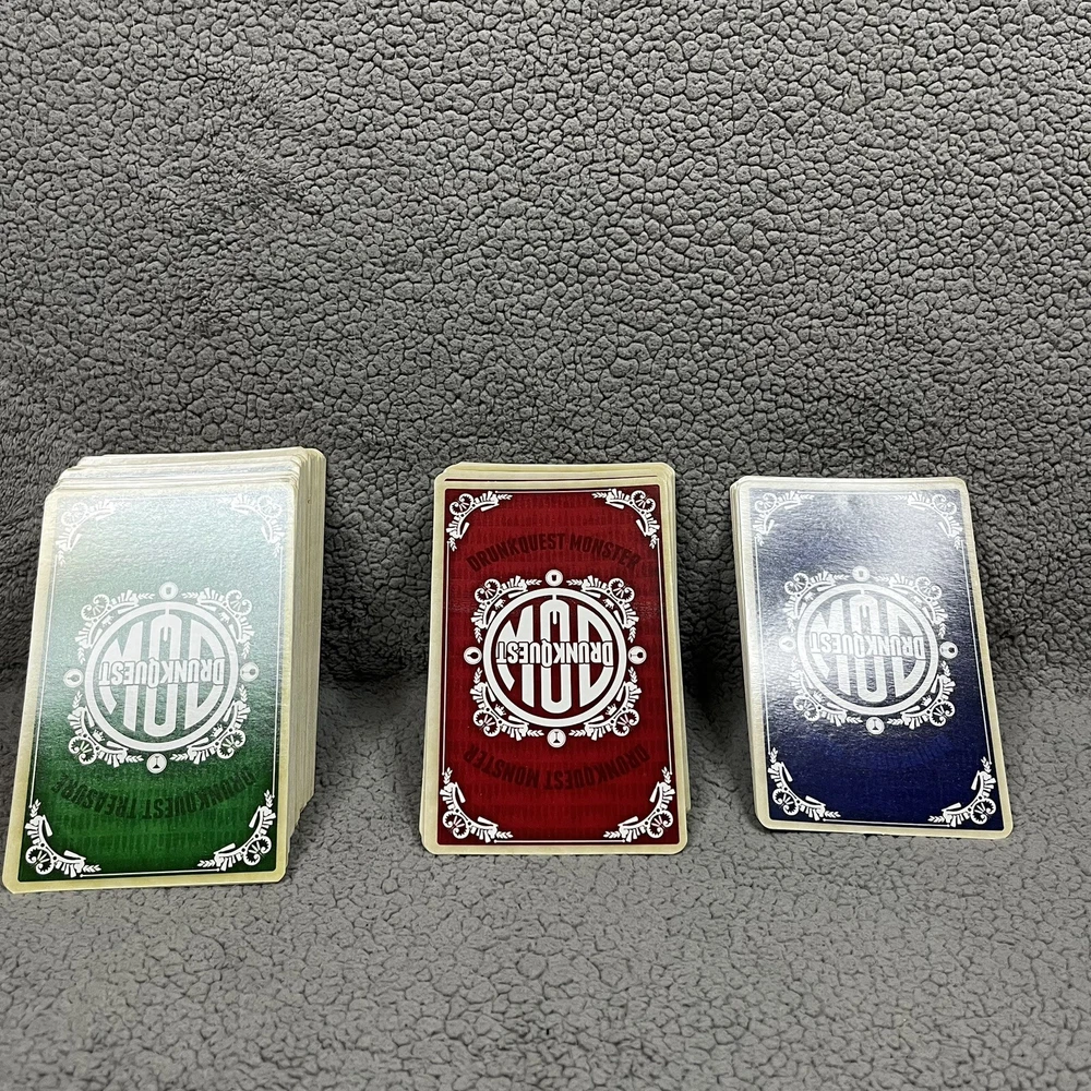 The "Drunk Quest Drunkquest" game by Loot Corps is a boxed party game designed for a minimum of 3 players, recommended for adults 21 years and older. Released in 2013, this fantasy role-playing game combines elements of a traditional board game with card and RPG mechanics. The game is geared towards both boys and girls, offering a fun and unique experience for those looking for a light-hearted and humorous gaming session. The complete set is described as rare, making it a desirable addition to any game collection. It contains 118 green cards 66 red cards and 16 blue cards. Please see attached pictures and contact me with any questions thank you 😊