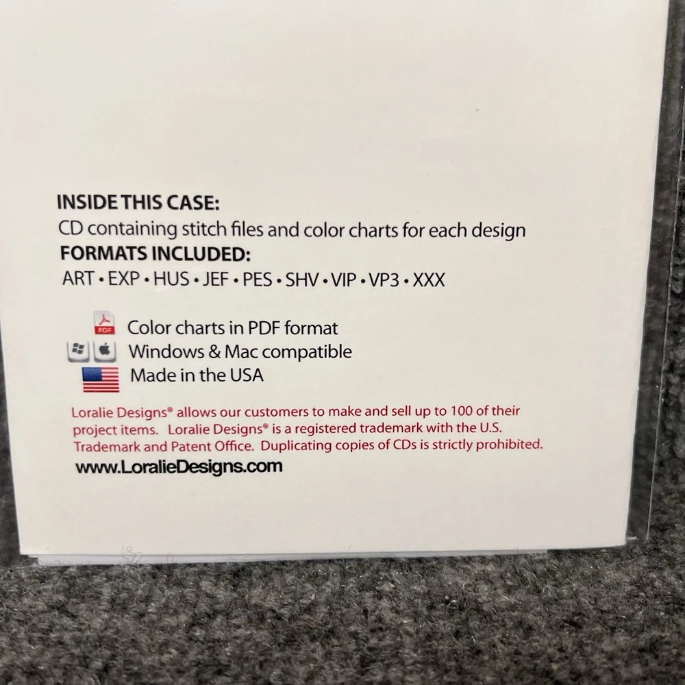 Brand new INSIDE THIS CASE: CD containing stitch files and color charts for each design FORMATS INCLUDED: ART • EXP • HUS • JEF • PES • SHV • VIP • VP3 • XXX