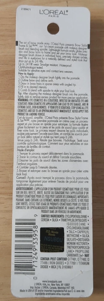Volume:0.08ozCountry/Region of Manufacture:United Statesgtin13:071249339596Shade:blondeMPN:Does Not ApplyType:Eyebrow PomadePeriod After Opening (PAO):12MFeatures:Blendable, Long LastingBrand:L'OréalUPC:071249339596Custom Bundle:YesSize:Full SizeFormulation:CreamProduct Line:L'Oreal Brow Stylist