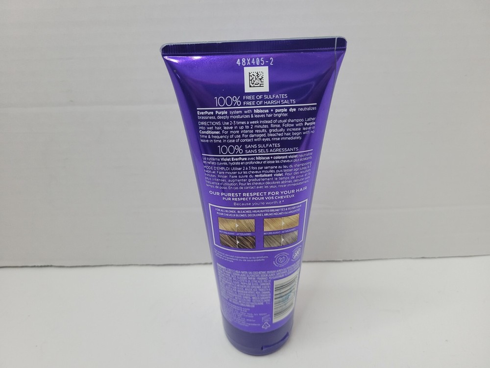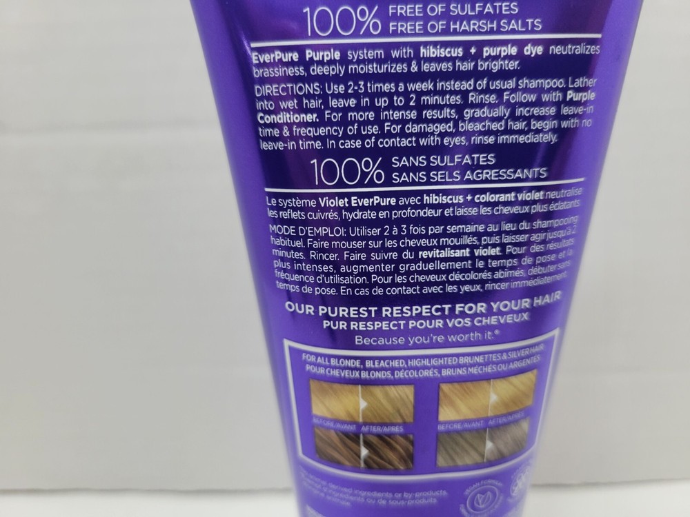 L'Oreal Paris EverPure Sulfate Free Purple Shampoo for Yellow/Orange Tones (Hibiscus) 6.8 oz. New. No box. Sealed! Disclaimer: I will not ship perfumes, colognes or cosmetic related items overseas or internationally. So please do not ask. Your money will be refunded after the purchase has been cancelled. I only ship Monday through Thursday. I try to ship next day once payment has cleared. Friday-Sunday purchases will be mailed out the following Monday. I do not accept or give refunds for cosmetic, perfume or cologne related items. All of my item's come from a pet and smoke free environment! Most if not all of my items come from local estate sales. I always try my best to only get items that I know are in clean to great condition! I do not knowingly purchase fake or counterfeit items, ever! If I need to, I will get the item verified and make sure that it is authentic! If you have any questions or concerns please feel to email anytime. I only do this part time as I have a full time job! Thank you for checking out my items.