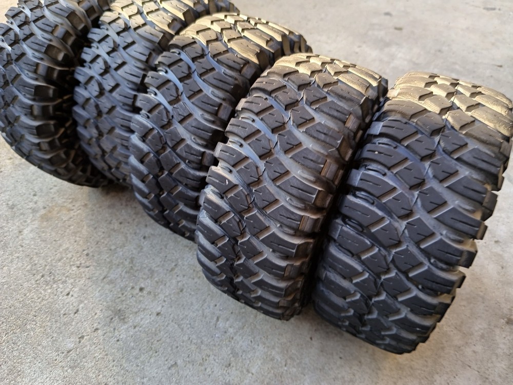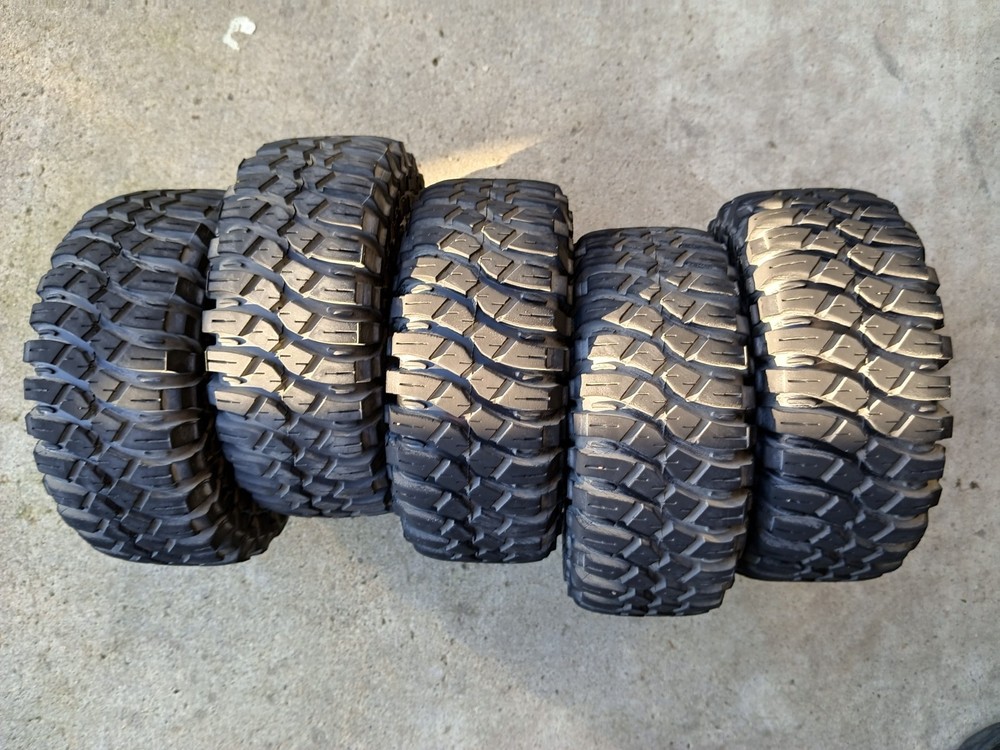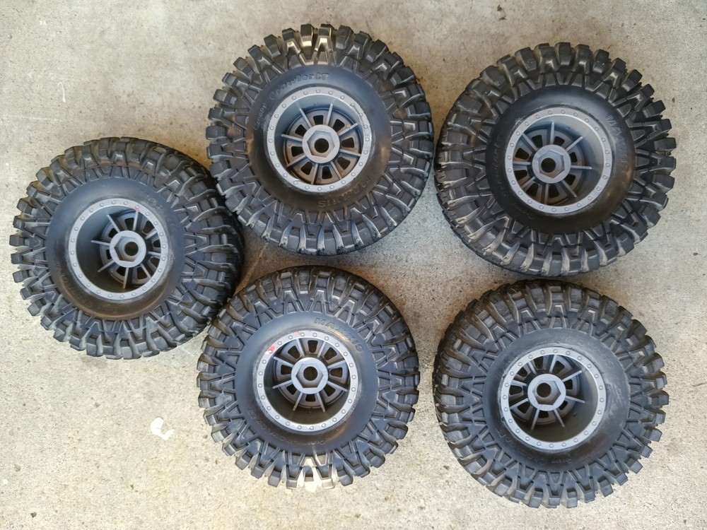 Losi Super Rock Rey 1/6 Maxxis Creepy Crawler LT Tires & Wheels Red Low Use QTY5 Used tires and wheels all 4 plus spare tire. Only used few times on dirt. No rips or cuts. No weather cracking. All hexes are in great shape.Some scratches and scuffs on the red imitation bead lock ring.