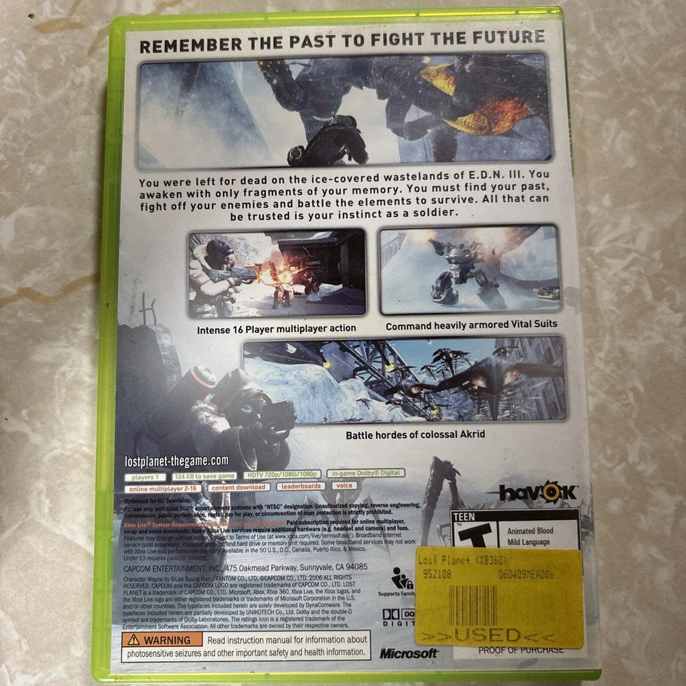 Embark on a thrilling adventure with "Lost Planet: Extreme Condition" for the Microsoft Xbox 360. Published by Capcom, this intense shooter game delivers a unique experience as part of the acclaimed Lost Planet series. Rated T for Teen, it caters to a wide audience, offering a blend of single-player and multiplayer excitement. Released in 2007, the game comes complete with its original manual, ensuring you have all the guidance needed to navigate its challenges. The NTSC-U/C region code confirms its compatibility with systems in the US and Canada. Whether you're a collector or a gamer seeking action-packed gameplay, this edition is a prime pick for your library.