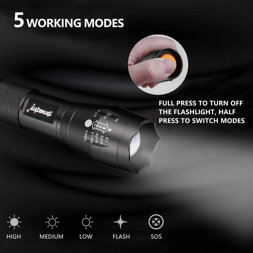 Lot 1-10 Pack Super Bright LED Flashlight Small Flashlights Zoom Working Torch ‼️‼️【Note】 Batteries not included, please feel free to contact us if any need. Features: 1. [SUPER BRIGHT WITH 5 MODES] : The super bright flashlight LED uses advanced LED beads, emits bright light up to 2000 lumens and reaches nearly 656ft, it can easily light up an entire room! Adjustable/zoomable focus with 5 modes: High- Medium- Low- Strobe- SOS (for Emergency). 2. [WATERPROOF]: The small LED flashlight can be used in any weather. The aluminum alloy body has no rust issue. The flashlight high lumens super bright waterproof can be daily used, like troubleshooting, biking, hiking, camping, walking dog, or for emergency, survival, etc... 3. [ADJUSTABLE FOCUS]: Our handheld flashlights tactical torch utilize the latest durable LED chip, provides super bright light beam. Easy-controlled head-pulling zoom and easy mode-switch by light taps of button. Adjustable focus for use in different situations it ideal for use around the house 4. [PREMIUM QUALITY & LONG-LASTING]: Our flashlight super bright is made of high quality aluminum alloy, this super bright LED Flashlight is solid and sturdy, the edge designed is sharp and strong, can easily break the windows in case there's a car accident. Specification: Type of flashlight: Super Bright LED Flashlight Small LED Type: LED Output Power (max): 10W Power by: 1x 3.7v Li-ion Rechargeable Battery (Not included) Size: 4.80 x 1.06 x0.95 inches Material: Aluminum Weight: 2.5 ounce Function: Zoomable Light Mode: High/Medium/Low/Strobe/SOS Warm Tips: 1. Before use, please remove the the plastic packaging film of the battery. 2. Please take out the battery if you won't use for a long time to avoid battery leakage. 3. Please do not submerged handheld super bright zoomable LED flashlight underwater as it doesn't 100% waterproof. 4. Please select a lower setting when the LED flashlight super bright torch zoomable is hot as it is typical for high powered led flashlight and will not cause damage to the handheld flashlight. 5. Don't directly illuminate the eyes. Note:Please find us in first time when you find the parcel Broken/Scratch/Function Error/Miss Parts/Unwork/has not arrived etc, we always have more details and solutions, even duty for your order. Package includes: Package 1: 10x Super Bright LED Flashlight Small (not included battery) Package 2: 5x Super Bright LED Flashlight Small (not included battery) Package 3: 3x Super Bright LED Flashlight Small (not included battery) Package 4: 2x Super Bright LED Flashlight Small (not included battery) Package 5: 1x Super Bright LED Flashlight Small (not included battery) On Dec 11, 2024 at 17:07:21 PST, seller added the following information: