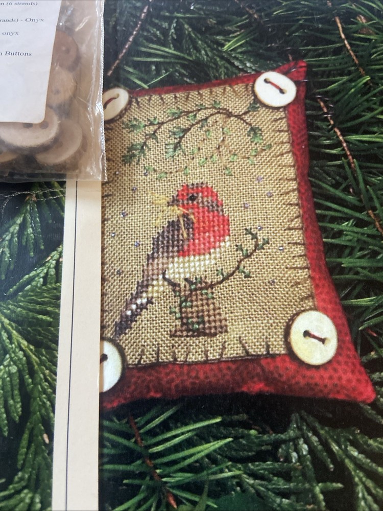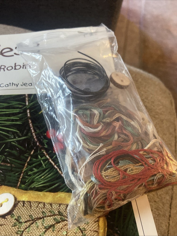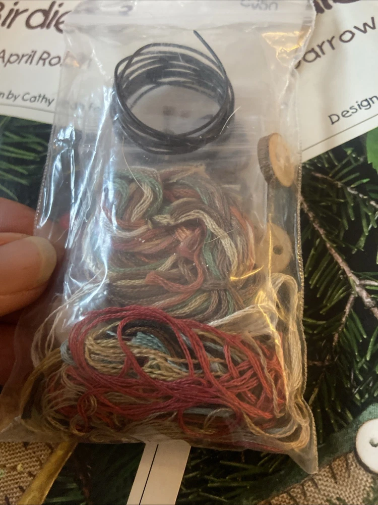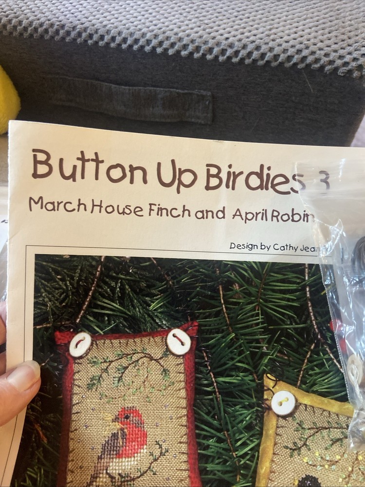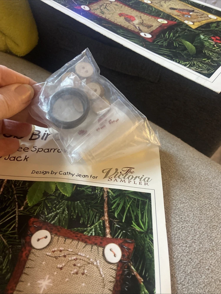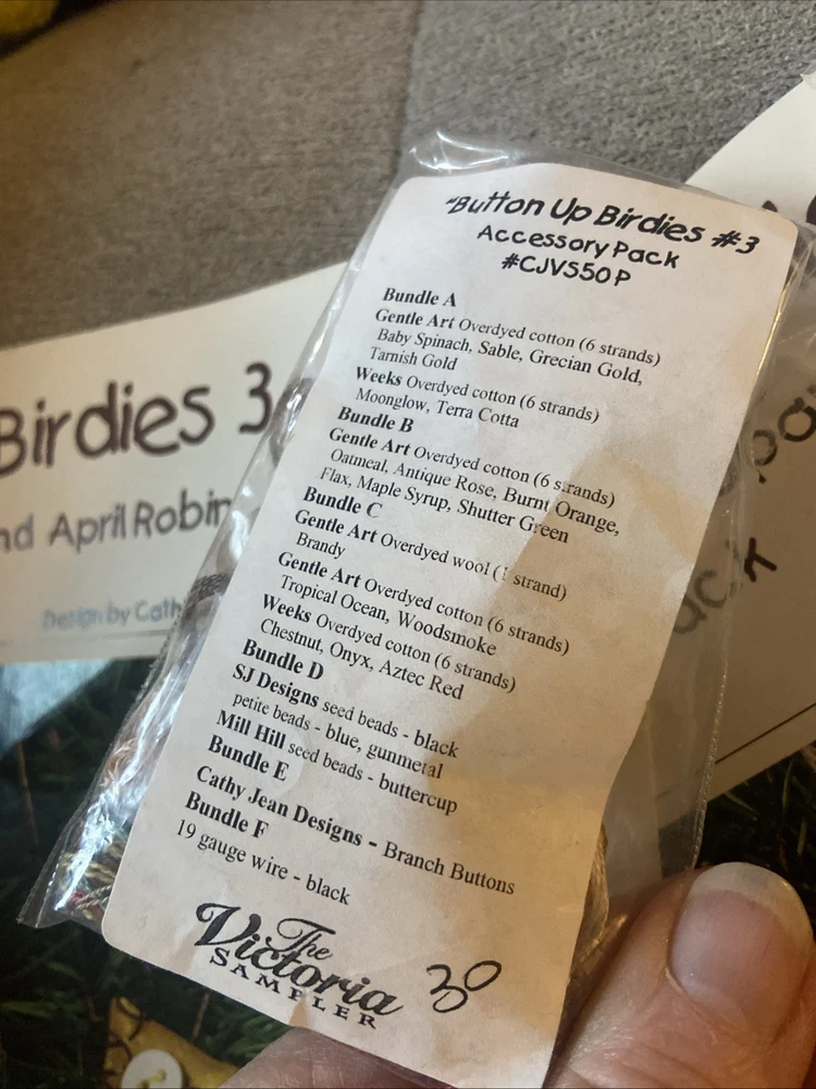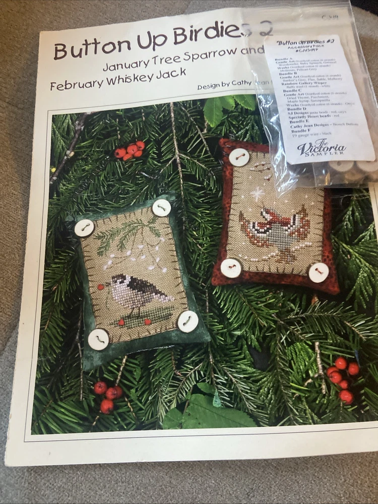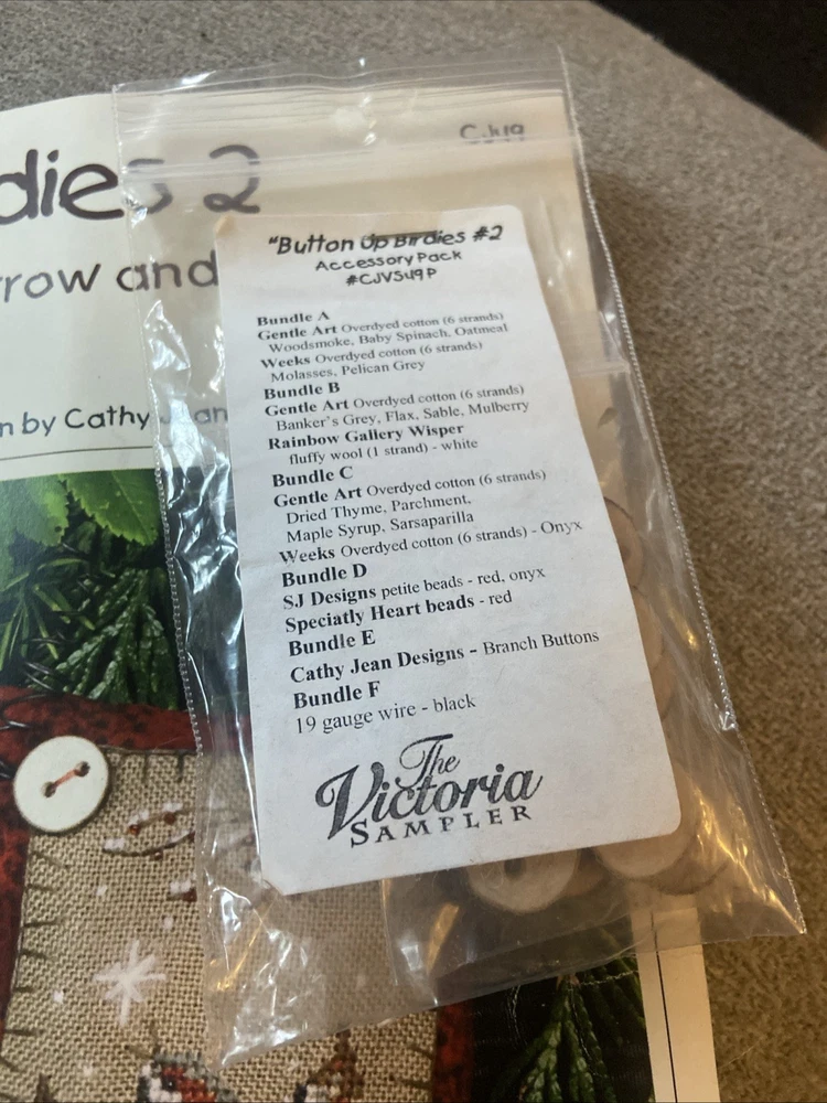 Two kits that are sealed with the pattern and the accessories for the button up birdies by Kathy Jean for the Victoria sampler. You will receive pattern number two and three with the accessory packs attached but I do believe one of this accessory packs might be missing something I’m not 100% sure unless all of the thread is in the first packplease see the photos of the two accessory packs and decide for yourself. These kids are sold as is in new condition and accessory packs are stapled to the patterns, but I’m not sure why there’s not thread in one of them.