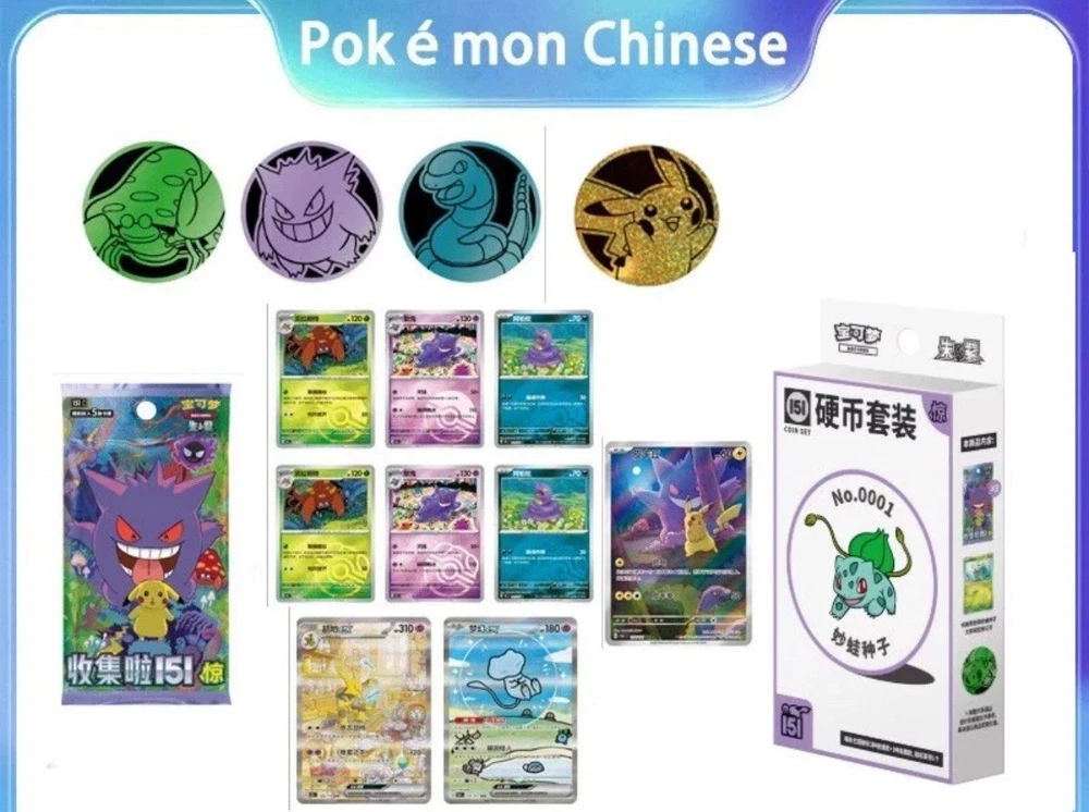 Nintendo Official Pokemon Chinese Products: Pokemon TCG S-Chinese Box 151 Surprise Booster Coin Collection Set 3 packs of “collect 151 SURPRISE ”slim pack 1 reverse holo card 1 coin randomly All cards will be sold randomly AND Pokemon TCG S-Chinese Collect 151 Hope Booster Coin Collection Set 3 packs of “collect 151 hope”slim pack 1 reverse holo card 1 coin randomly All cards will be sold randomly 👉Kind reminder: All styles will be randomly dispatched, and specific styles cannot be specified.👈 100% Nintendo authentic pokemon products ! Please note this is Chinese Version ! Chinese Pokemon Card has blue back like English version. 100% authentic nintendo products, made in Japan, released in China Mainland.