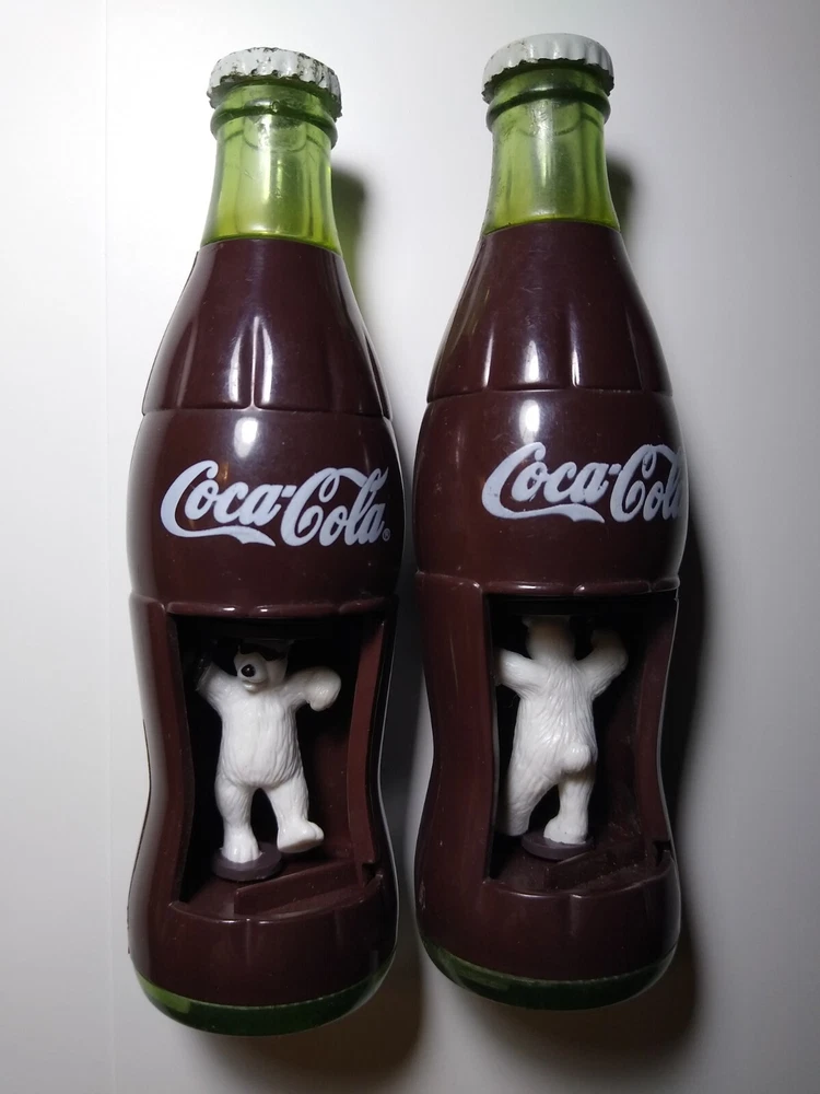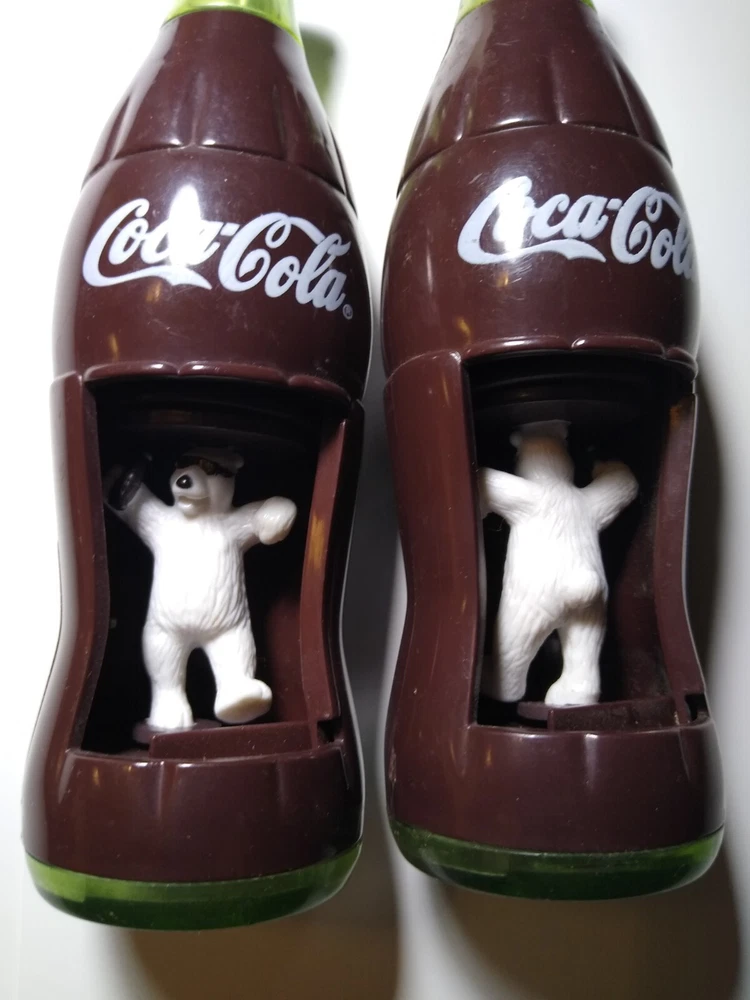 Lot of (2) vintage Burger King toys featuring the beloved Coca-Cola brand with spinning polar bear. Created in the year 2000 and are original pieces. The toys were manufactured in China and are multi-colored. They would make great additions to any collection of restaurant and fast food advertising memorabilia. LOT OF 2. Both are used condition and working. Scuffs to the top and plastic areas.