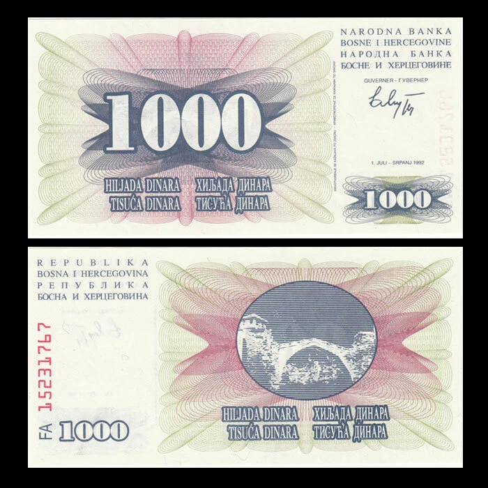 Lot 5 PCS, Bosnia & Herzegovina 1000 Dinara, 1992, P-15, UNC About US ------------------------------------ We are the biggest seller of real banknotes and coins in China started in 2008. We don't make copies.None copies in our store. About Notes & Coins ------------------------------------ The actual note may have a different serial number,signaturs and prefixs.Please use the image as a reference only. The notes and coins we sell are 100% real and UNC We can combine shipping for some items. We can provide Serial Number for lots notes. 100% Satisfaction Guranteed shipping ------------------------------------ we ship the item via USPS to USA ( 10-15 days for shipping), Via china-post to world( 10-30 days for shipping). Some remote area maybe take a little longer, Please be patient. we will ship out in 48 Hours after the payment is cleared. Feedback ------------------------------------ If there is a problem, contact us in advance, please don't leave negative/neutral feedback without communication. We'd appreciate the opportunity to work with you to ensure a successful transaction. Please feel free to E-mail us with any questions,We will respond in 24 hours .