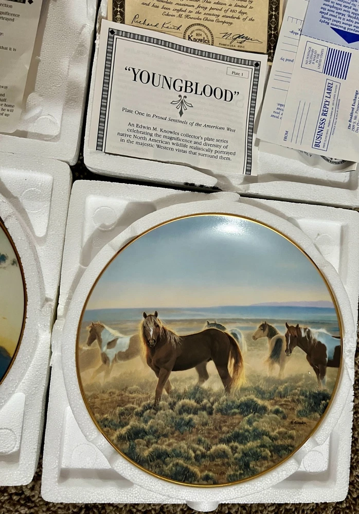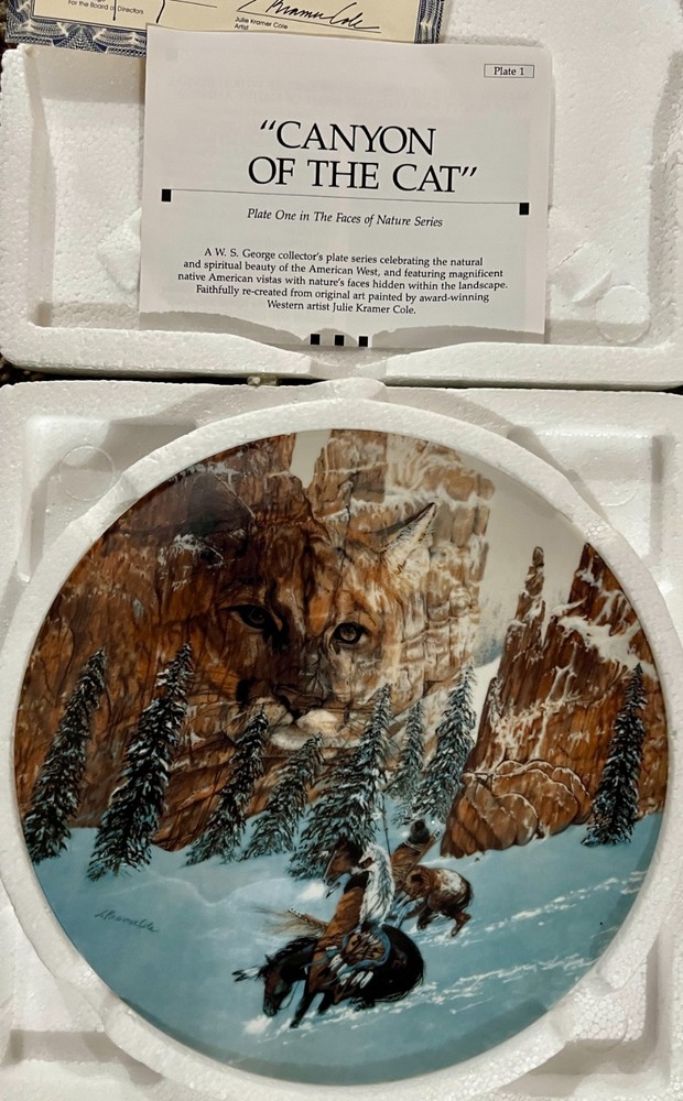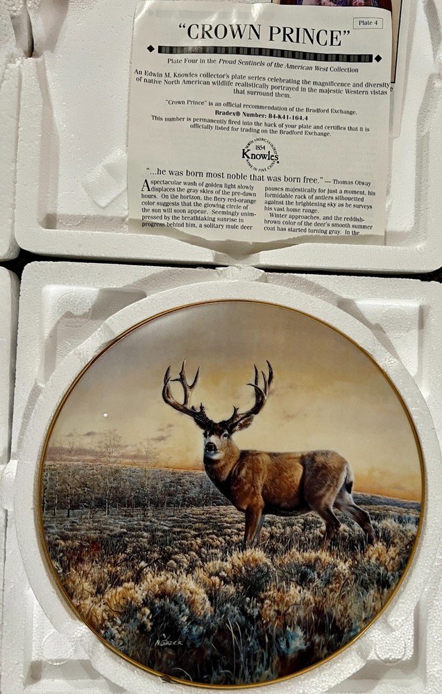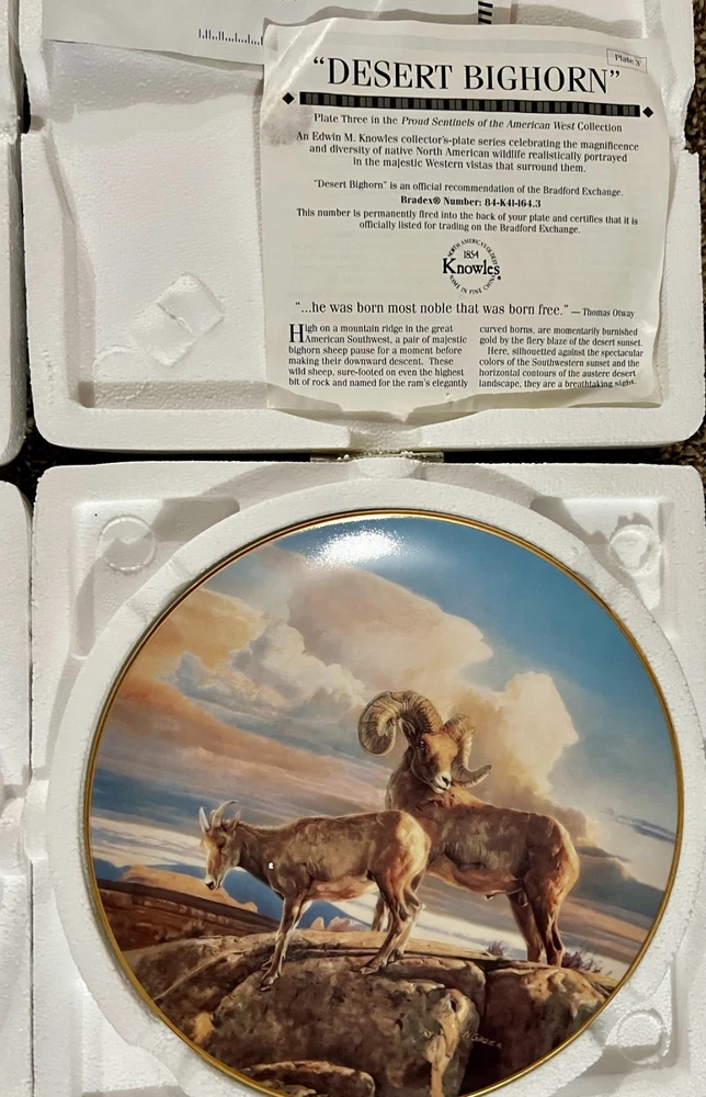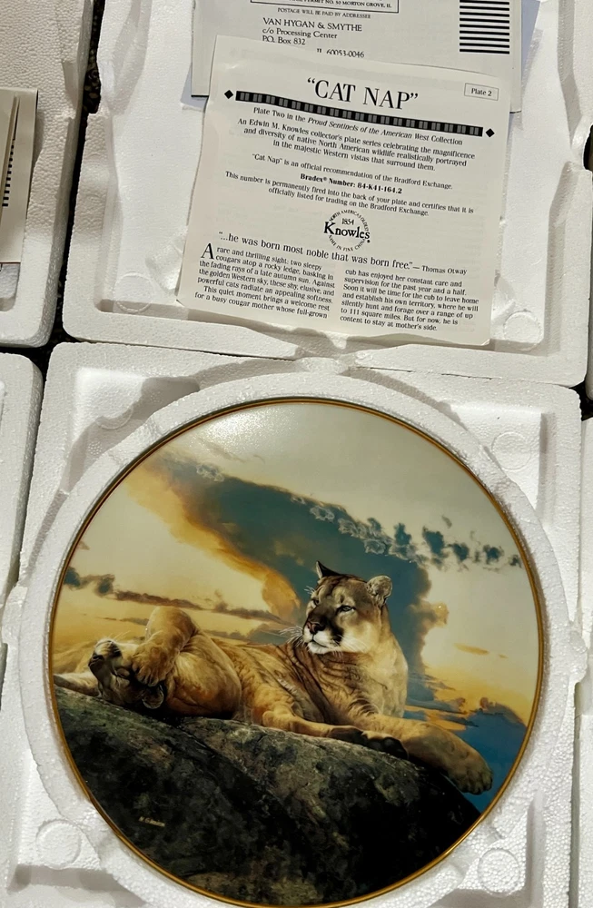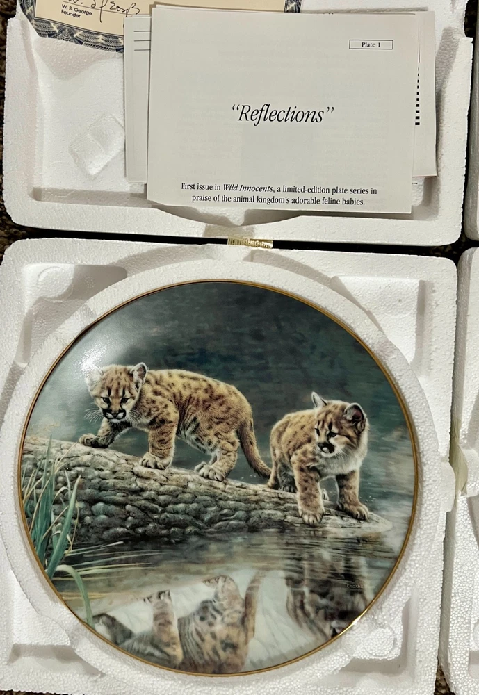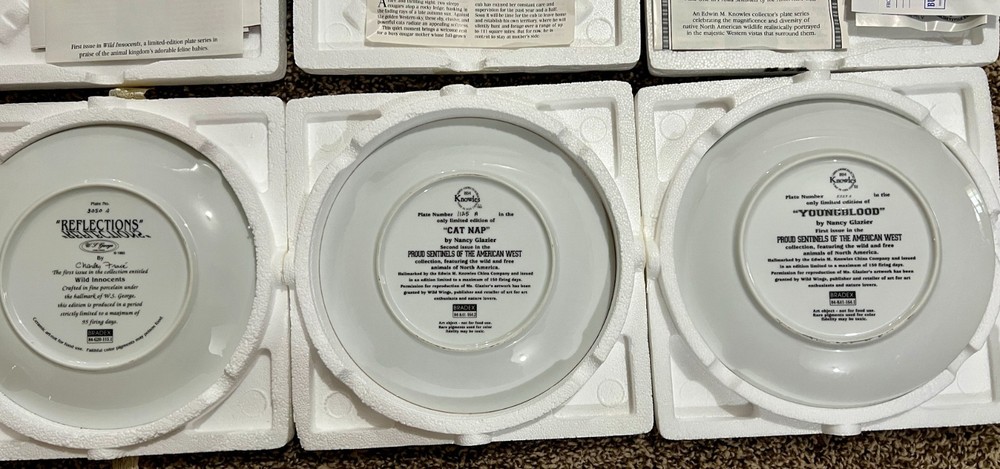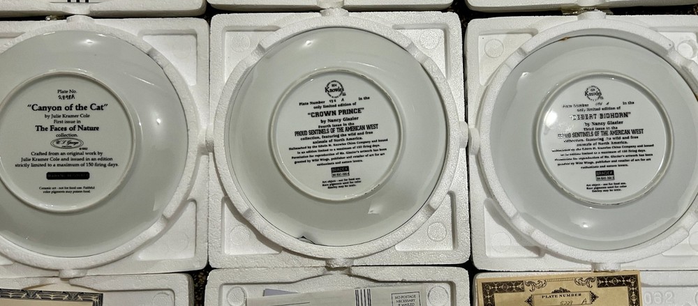 Beautiful lot of 6 Bradford Exchange wildlife collector plates by Nancy Glazier, Charles Fracé & Julie Kramer Cole. Includes “Reflections,” “Cat Nap,” “Youngblood,” “Canyon of the Cat,” “Crown Prince,” and “Desert Bighorn.” All limited edition with COAs, excellent to mint condition. Gorgeous art featuring deer, cougars & bighorn sheep. Fast USPS shipping! Lot of 6 Bradford Exchange Wildlife Collector Plates – Nancy Glazier, Charles Fracé, Julie Kramer Cole – Mint w/ COAs Description: This beautiful collection of six Bradford Exchange wildlife collector plates features the stunning artwork of Nancy Glazier , Charles Fracé , and Julie Kramer Cole — three of the most respected names in contemporary wildlife art. Each plate is limited edition , individually numbered , and crafted on fine porcelain by W.S. George or Edwin M. Knowles . These plates have been well cared for , display beautifully, and include their Certificates of Authenticity (COAs). Ideal for wildlife and Western art collectors or as a thoughtful gift set. Included Plates: “Reflections” – Charles Fracé , from Wild Innocents (W.S. George, 84-G20-115.1) #3950A “Cat Nap” – Nancy Glazier , from Proud Sentinels of the American West (Edwin M. Knowles, 84-K41-164.2) #1125A “Youngblood” – Nancy Glazier , from Proud Sentinels of the American West (84-K41-164.1) #5119A “Canyon of the Cat” – Julie Kramer Cole , from The Faces of Nature (W.S. George, 84-G07-187.1) #2898A “Crown Prince” – Nancy Glazier , from Proud Sentinels of the American West (84-K41-164.4) #485A “Desert Bighorn” – Nancy Glazier , from Proud Sentinels of the American West (84-K41-164.3) #1194A Condition: All plates are in excellent to mint condition with vibrant color and glossy finish. No chips, cracks, or repairs. Each includes its original Certificate of Authenticity . All have original paperwork and packaging/boxes. Some boxes may show light shelf wear.