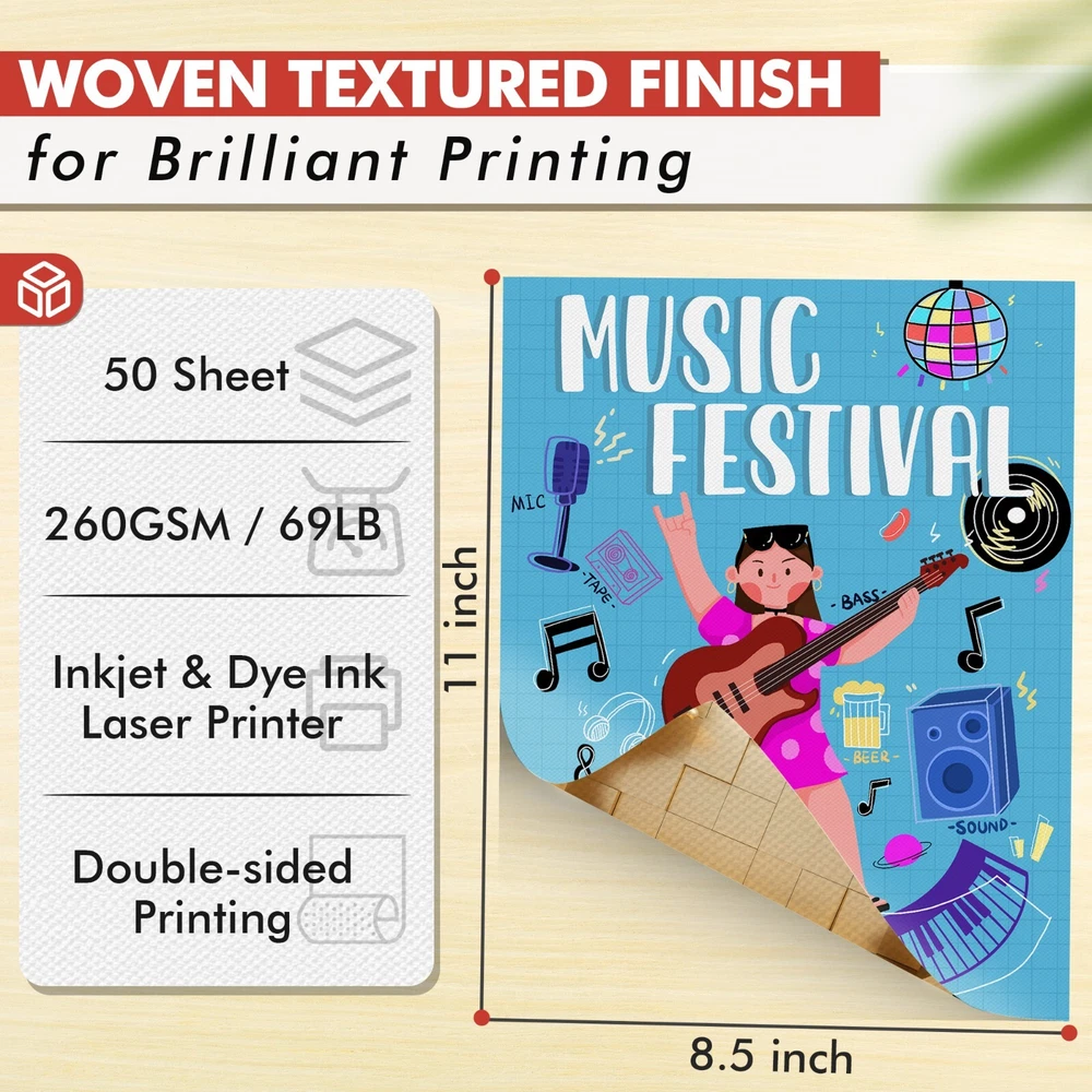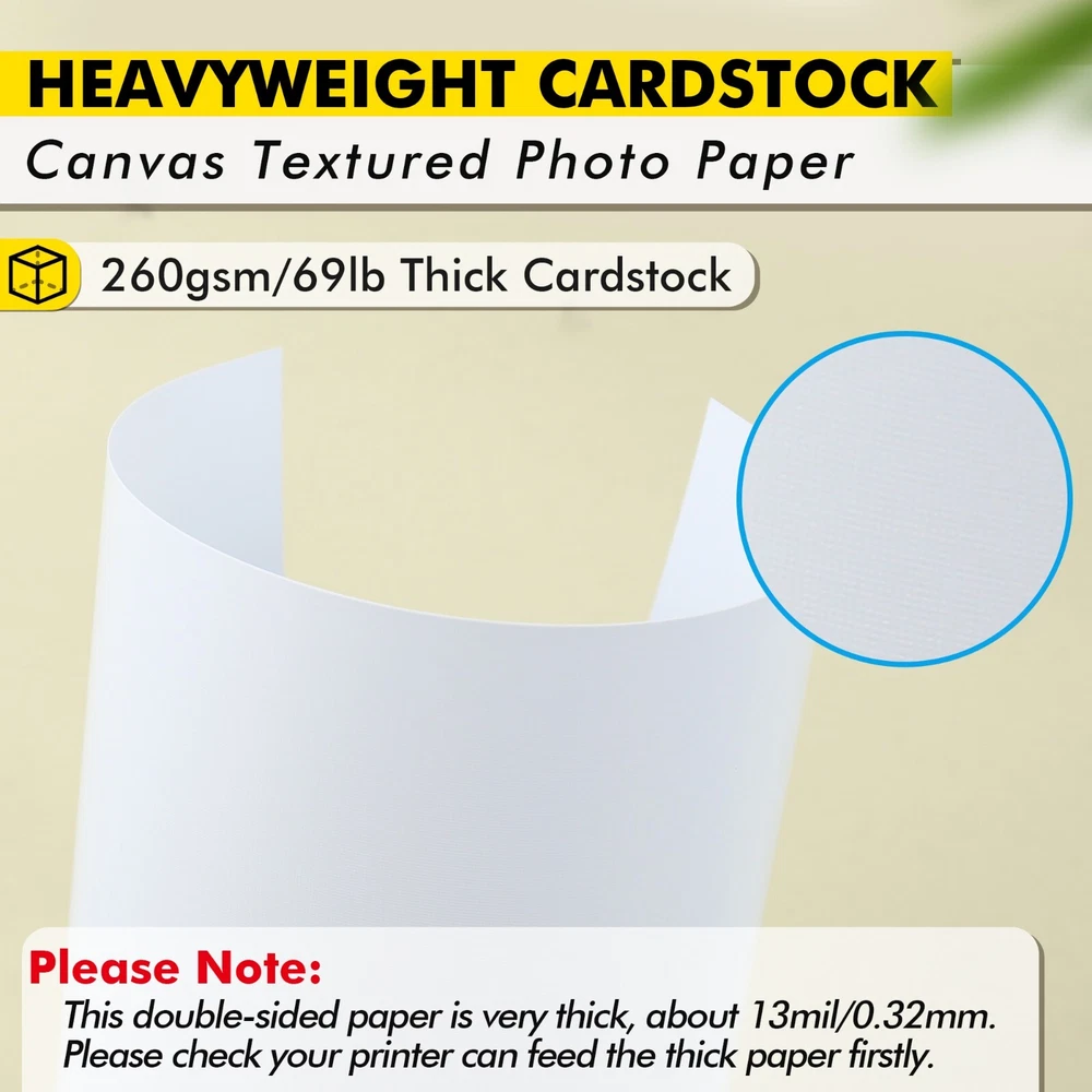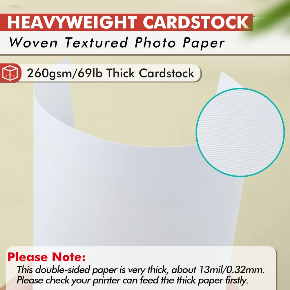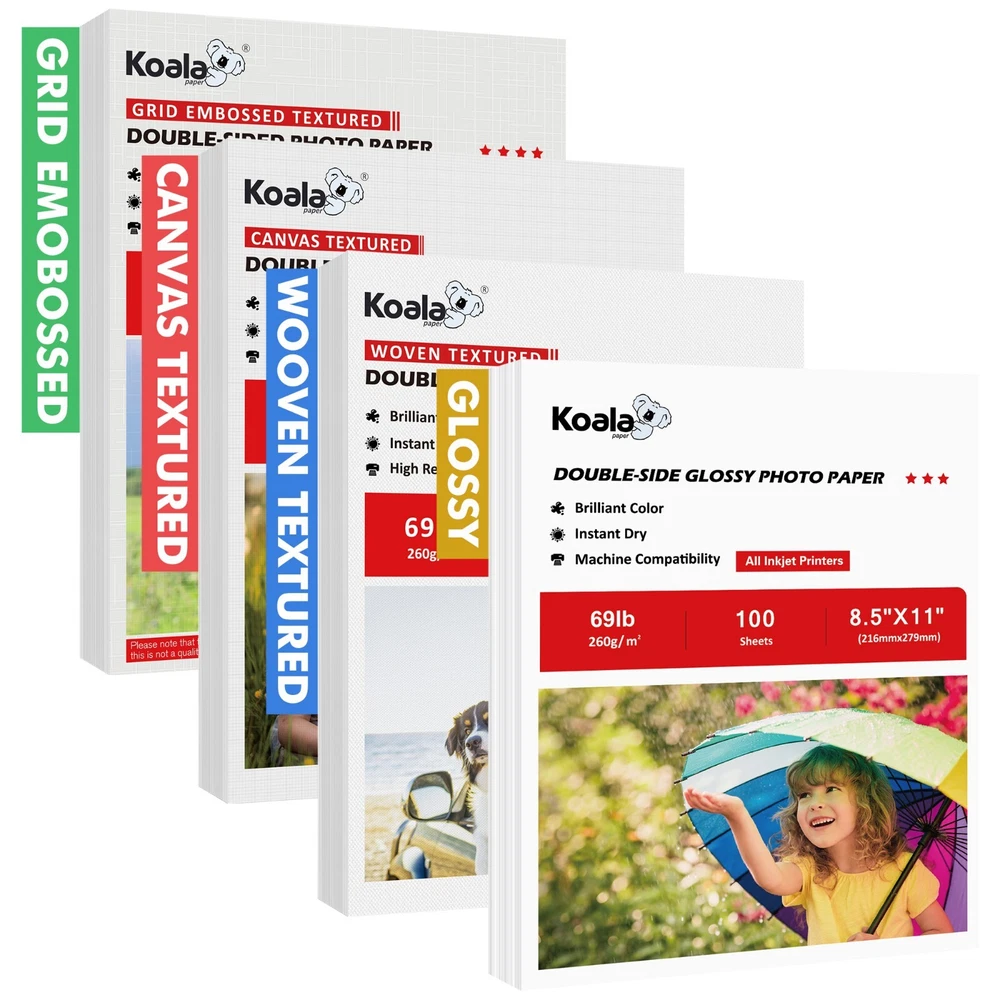 View more great items KOALA DOUBLE SIDED PHOTO PAPER: Achieve a professional, artistic look with the new released special textured koala photo paper that adds depth and a tactile element to your photos and prints, making them stand out. 69LB PHOTO PAPER: we offer glossy, canvas textured, wooven textured, and grid emobossed textured photo papers for this 69lb photo paper series. Enjoy vibrant, sharp prints on both sides of the paper. Koala double sided photo paper is perfect for creating stunning photo albums, cards, book covers, brochures, and art projects that require double-sided printing. Premium Thickness and Durability: With a 260gsm (69 lb) thickness, these koala double sided printable photo paper offers substantial weight and durability, ideal for high-quality, long-lasting prints. Inkjet and Laser Printer Compatibility: Designed for versatility, this paper works seamlessly with most inkjet printers using dye ink and select laser printers that can handle heavyweight cardstock paper. Standard Letter Size: 8.5x11 inch sheet size and different Sheets quantity availble for your choices, conveniently sized for everyday printing, these 8.5x11 inch double-sided printable photo paper fit standard paper trays, making them perfect for a variety of creative projects. Satisfaction Guaranteed: Enjoy peace of mind with a 30-day money-back guarantee and 24/7 customer support. Don't hesitate, click "add to cart" and elevate your printing projects!