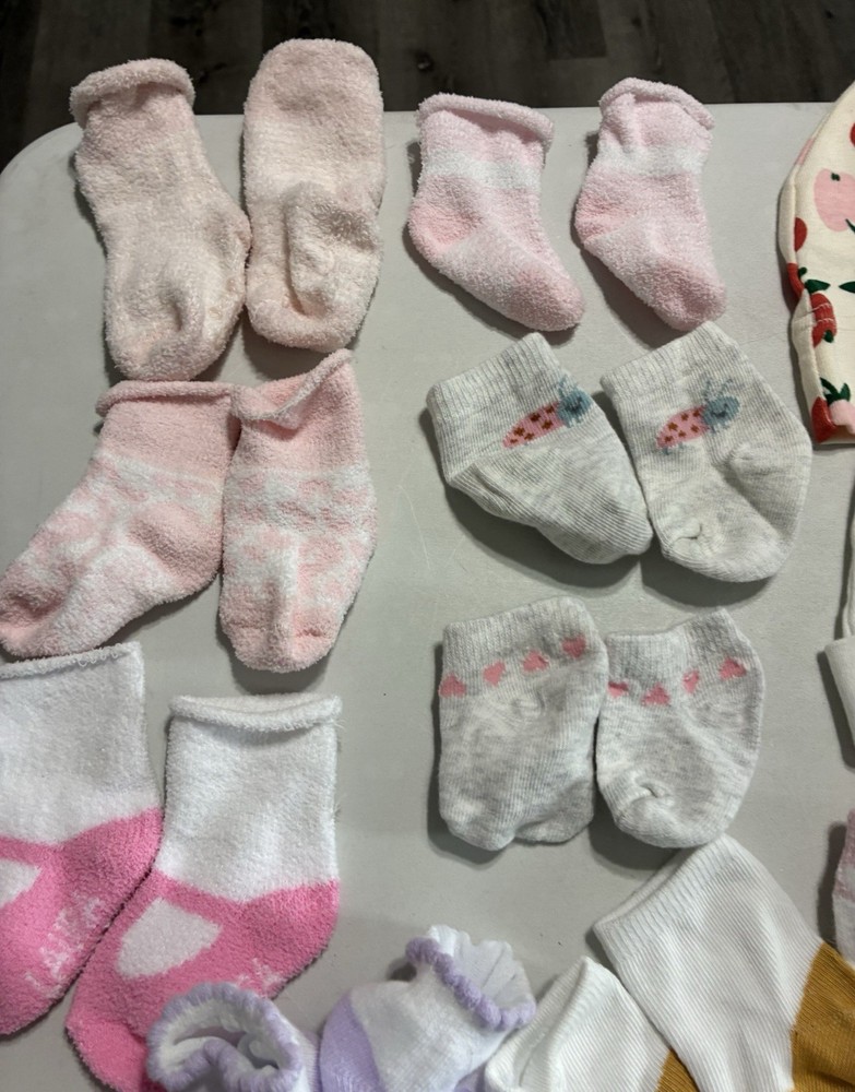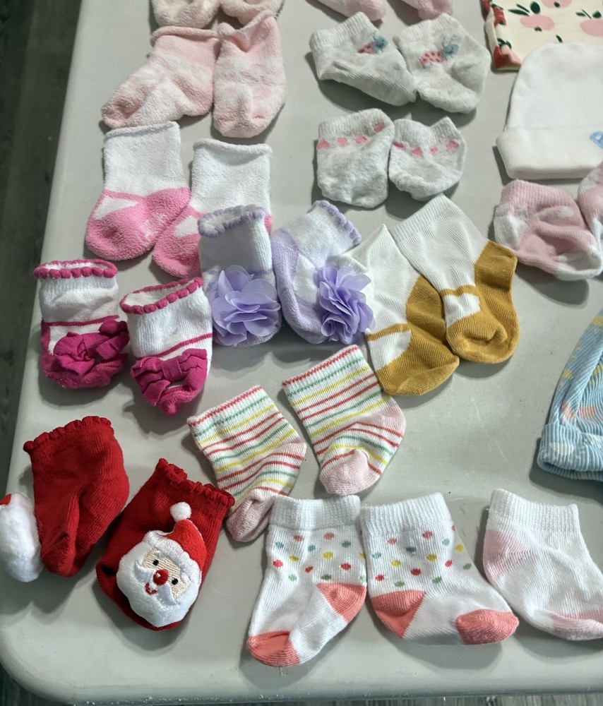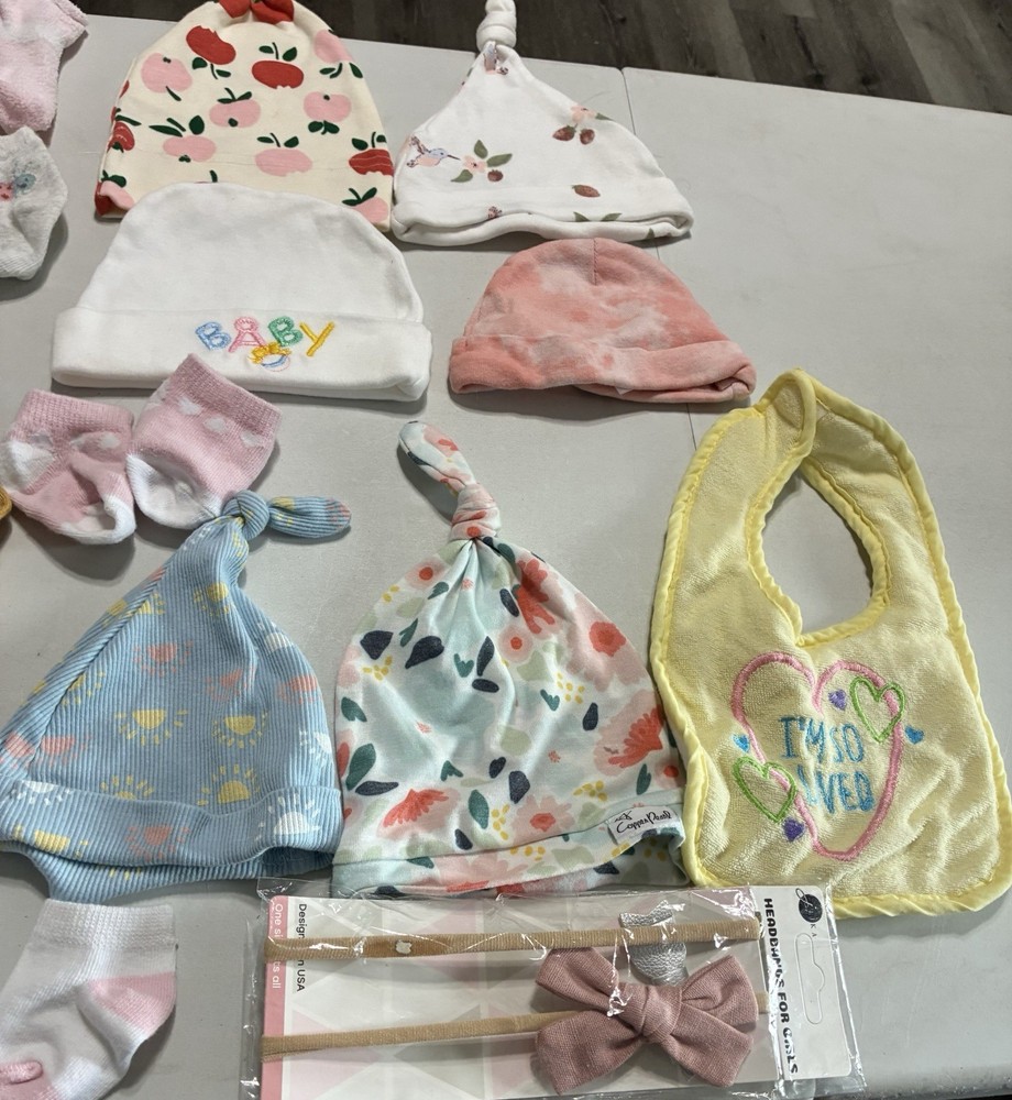 The product is a lot of 10 infant girls newborn items, including bibs, socks, and hats in pink colors and various patterns. This assortment of baby accessories is perfect for keeping your little one clean and comfortable during feeding times. The cute designs and soft materials make these items both practical and adorable for any newborn baby girl.