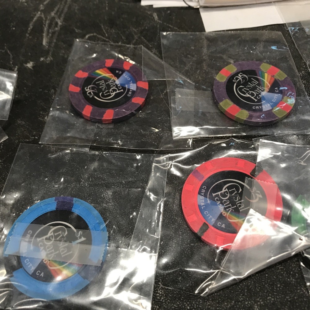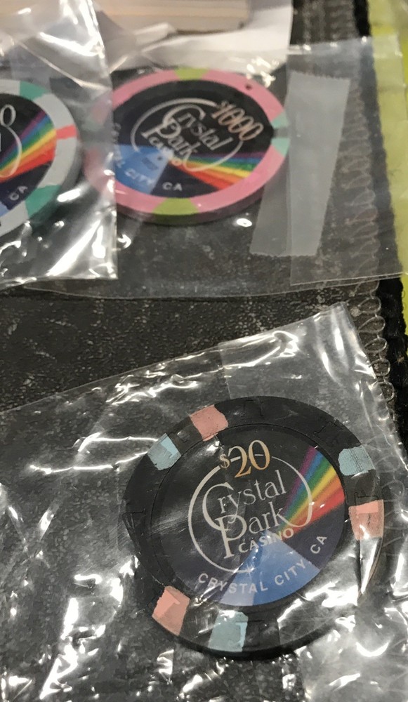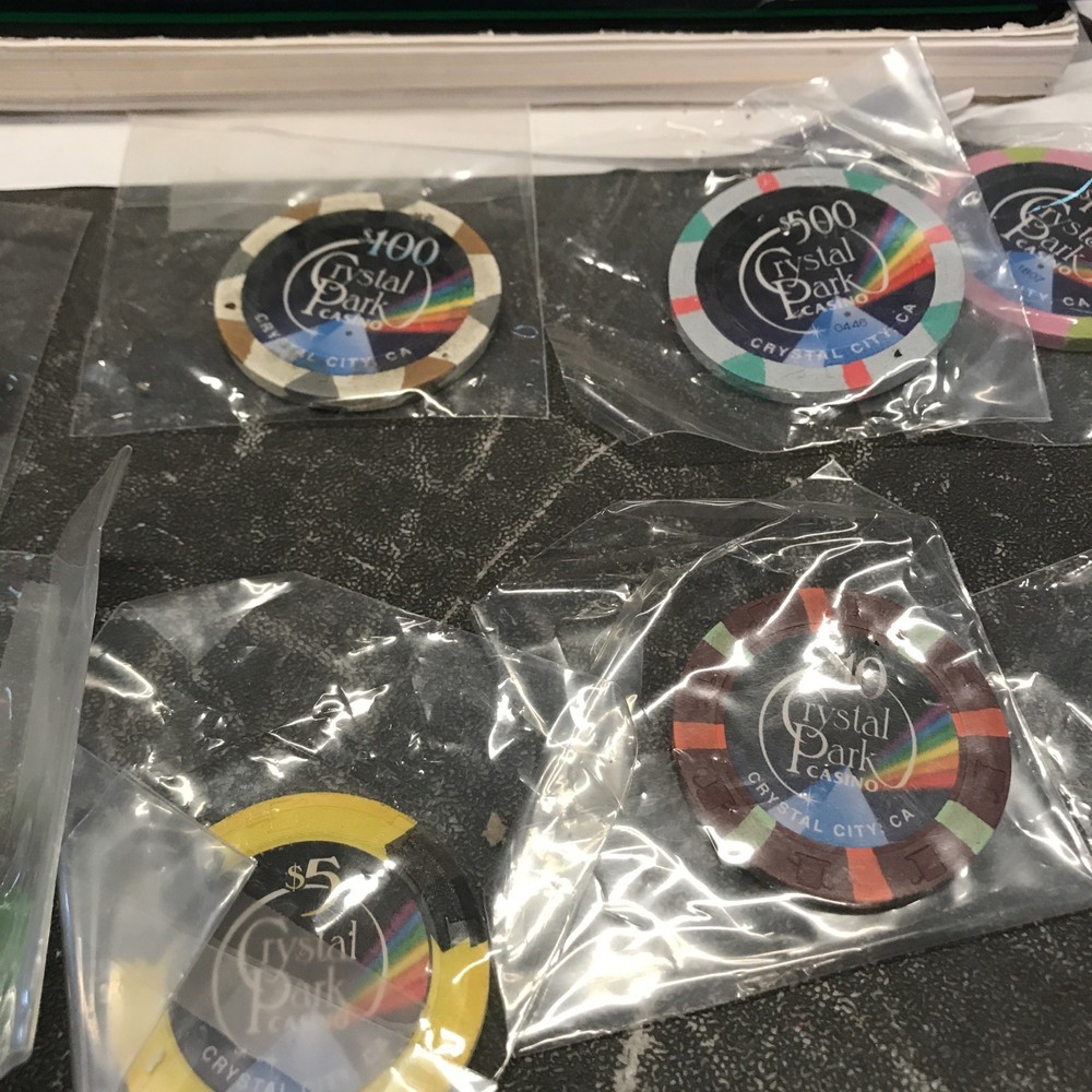 This product is a lot of 11 individual casino chips from the Crystal Park Casino in Crystal City, California. The chips range in values from $1 to $1000.00, providing a diverse selection for collectors or enthusiasts of casino memorabilia. Each chip holds a unique piece of history and can be a valuable addition to any casino chip collection.