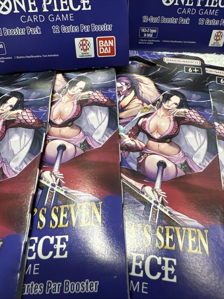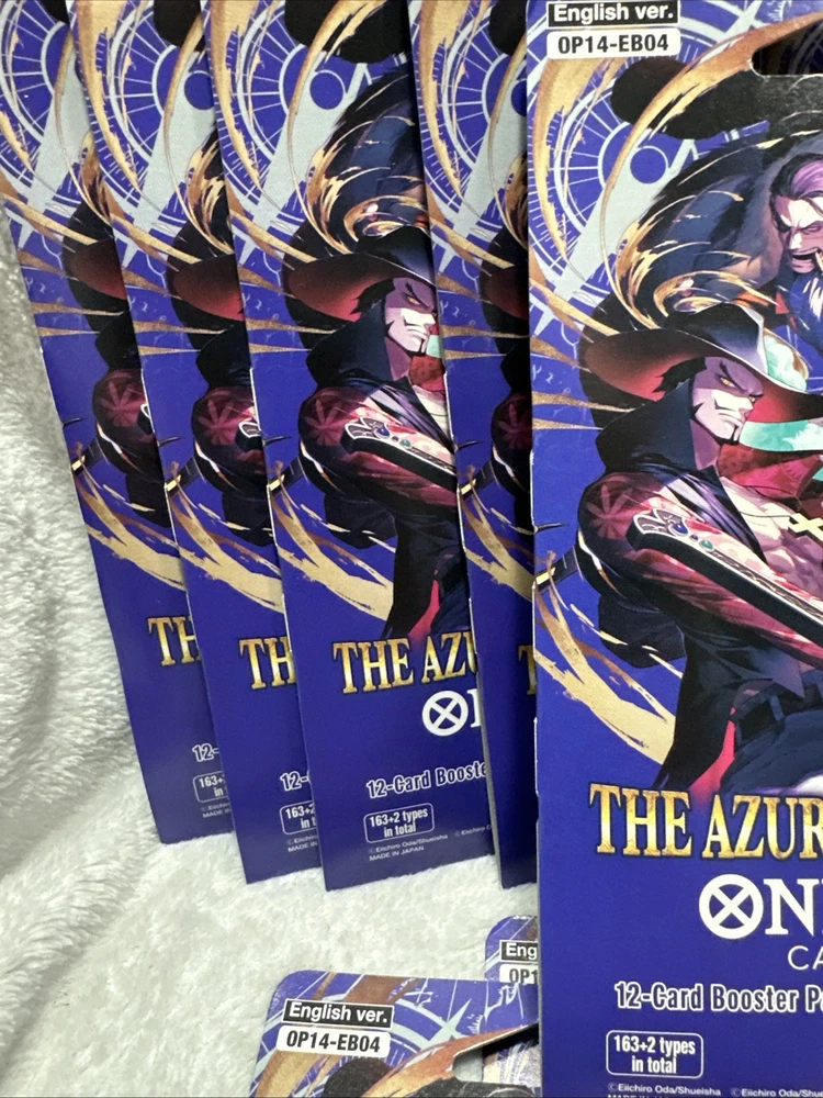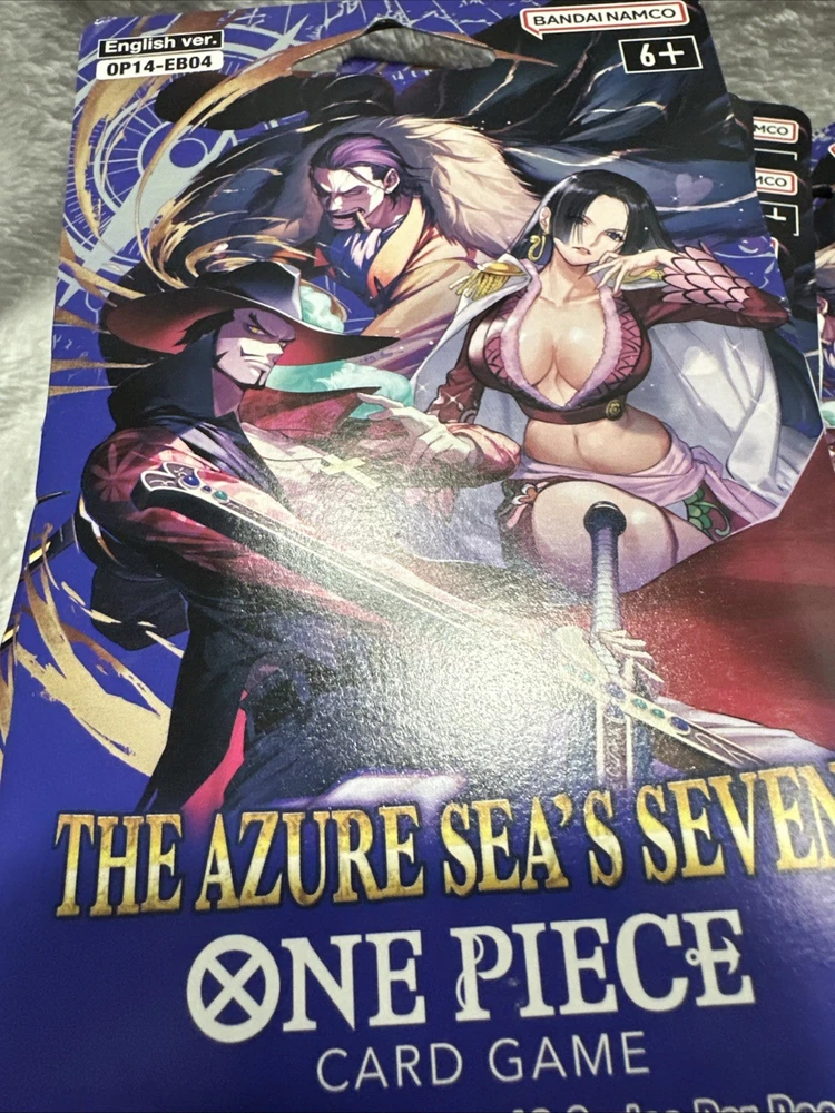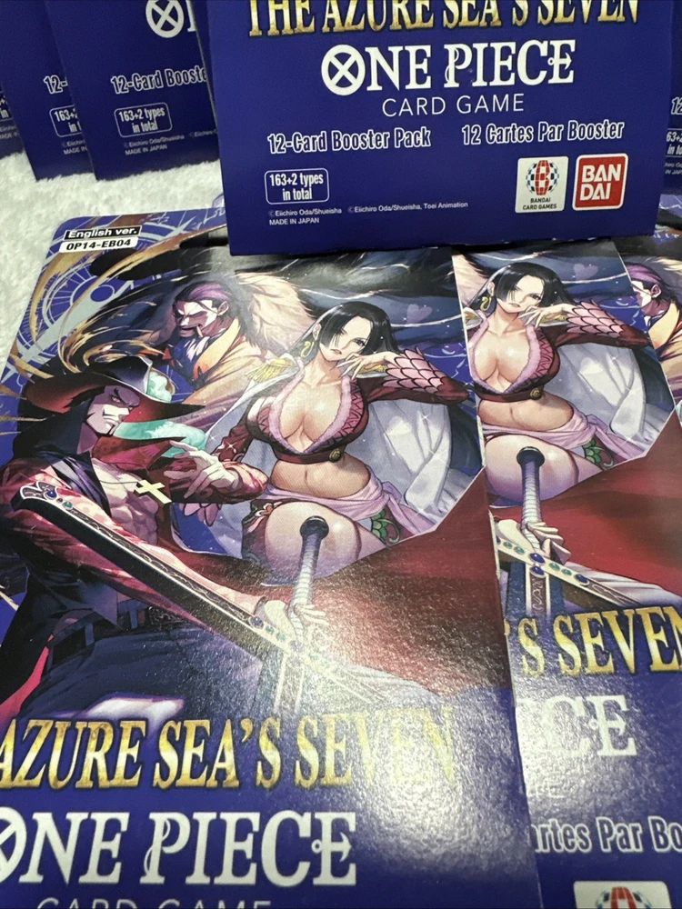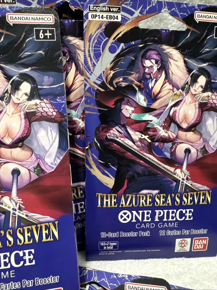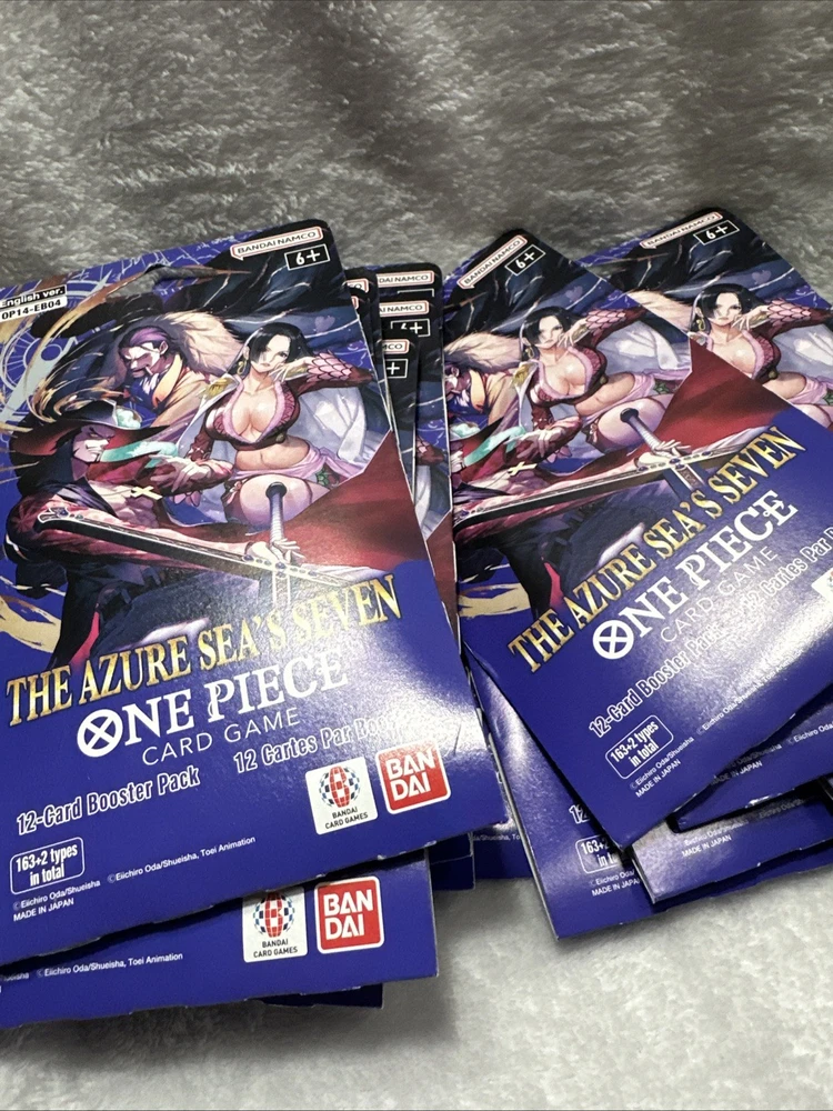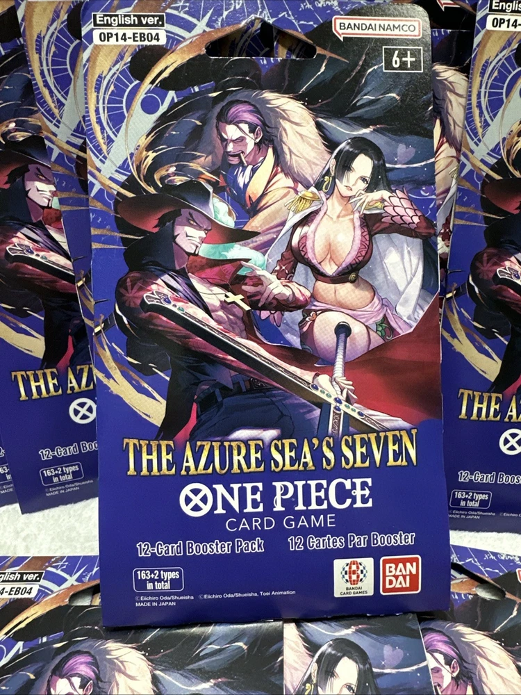 The OP14 - EB04 One Piece TCG Sleeved Booster is a collectible card game product manufactured by Bandai. This lot of 14 booster packs features cards from the set "The Azure Sea’s Seven," with each pack containing standard-sized card stock cards in English language. Perfect for fans of the One Piece CCG, these booster packs are a great way to enhance your collection with cards from the latest set released in 2025. Each pack offers a chance to collect unique and exciting cards to add to your deck or display.