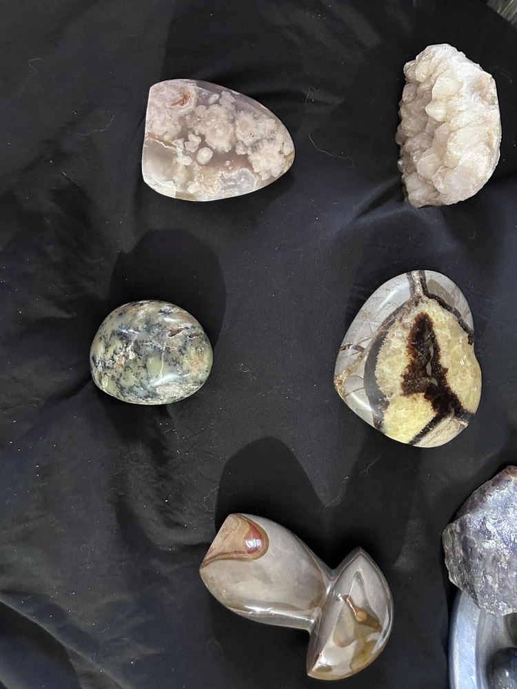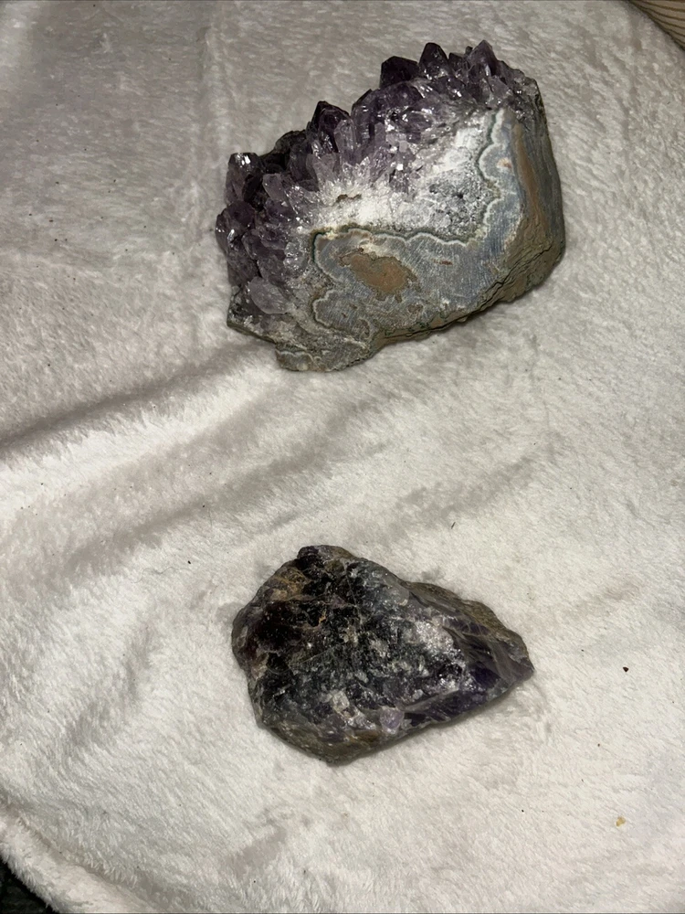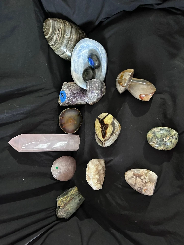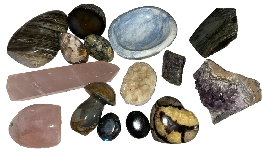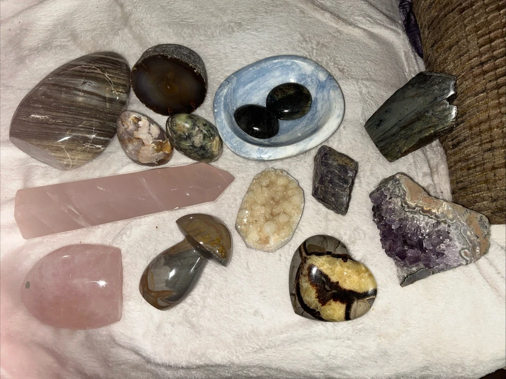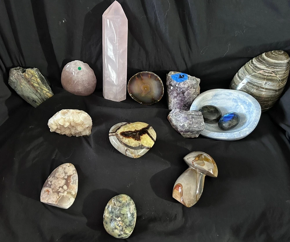 I dont know one family that doesnt have at least one person that loves ROCKS! Gods best natural creation !! one of the most natural gifts from God Above and thats the beauty and energy that we get from rocks ! Theres 15 pcs in this soul moving lot!’ Beautiful !! 1) large pc of jasper ! Curvy stripes ! Obicular Jasper! 7” by 5.5” 2 1/4” 2) 1- tall rose quartz tower 9” by 2 1/4” 6 sides 2- rose quartz one side polished 4 1/4” by 3 1/4” by 1” 3) everyone seems to love the bluelace agate bowl 5.5” x 6” x 2” !! Luv rm! 4) 1-amethyst crystal from Brazil 5” x 3 1/2” x 3” self standing pc. 2- 3.5” x 2.5” x 1.5” chard like pc natural unpolished 5) labradorite one self standing chunk 1 polished side 4.5” x 3 1/ x 1 1/4” 2 plam stones labradorite 2” x 1 3/4” x 3/4” ovals polished completely very pretty to the eye!! 6) Beautiful heart yellow gold crystal sedtarian heart natursl markings! Gorgeous both sides!! 3 1/2” x 3 3/4” x 1” 7) 2- special agates! 1) free standing then dendrite Opal agate! 3 1/2” x2 1/2” x 1 1/4” polished all sides 2) flowering agate has little pieces of a petrified flower petals some look like maybe they have squashed together, but on one side they are where you can tell kind of this flower petals. 3.5” x 2” x 1.5” small but beautiful!! 8) dusty crystal quartz 4 “ x 2 1/4” x 1 1/2” this had a pinkish shiney look on the sides unusual 9) smooth cut in half egg shaped agate polished center 3 1/2” x 3” x 3” 10) mushroom made from Jasper!! 4” tall by 4” diameter ! Should be a total if 15 pcs. Sold as is i do not accept returns on rocks they will be insured There are a couplefleabites on the top part of the rose quarts tower it canbe smoothed out just normal wear n tear! Any questions give me a hollar! Thank You