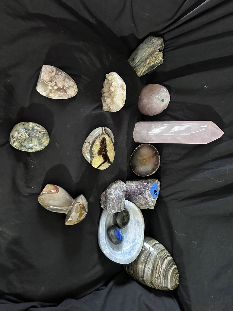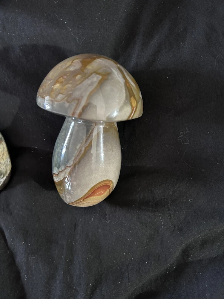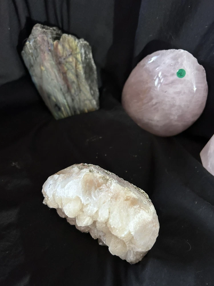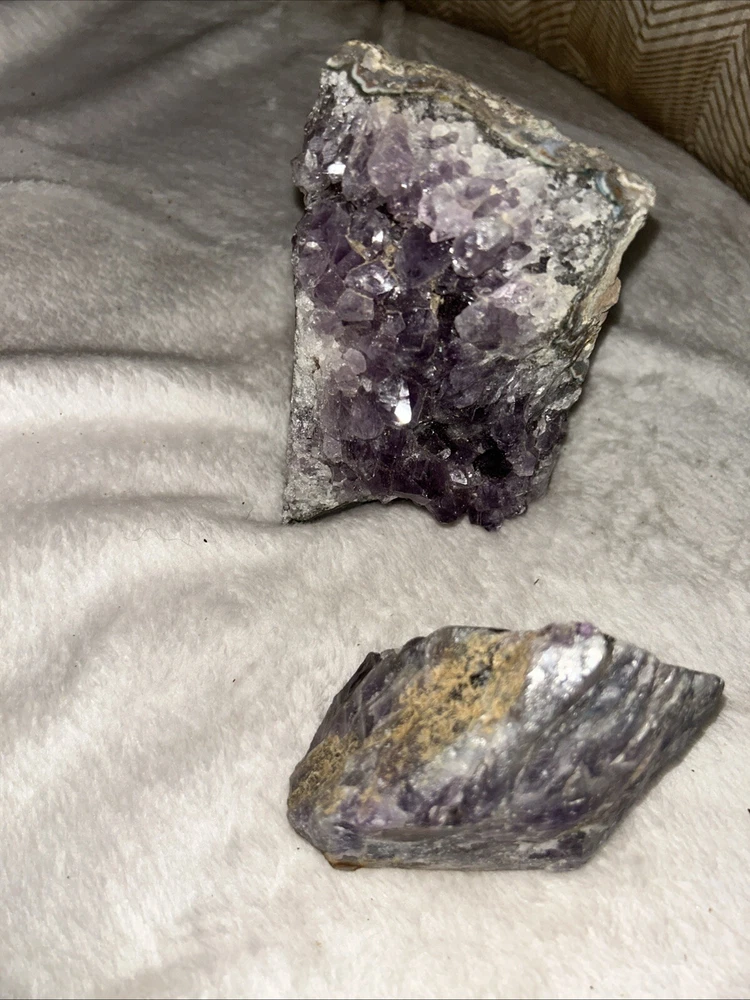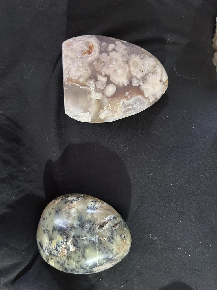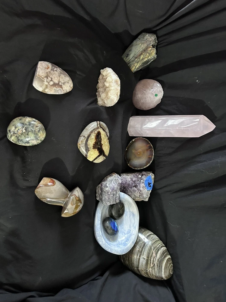I dont know one family that doesnt have at least one person that loves ROCKS! Gods best natural creation !! one of the most natural gifts from God Above and thats the beauty and energy that we get from rocks ! Theres 15 pcs in this soul moving lot!’ Beautiful !! 1) large pc of jasper ! Curvy stripes ! Obicular Jasper! 7” by 5.5” 2 1/4” 2) 1- tall rose quartz tower 9” by 2 1/4” 6 sides 2- rose quartz one side polished 4 1/4” by 3 1/4” by 1” 3) everyone seems to love the bluelace agate bowl 5.5” x 6” x 2” !! Luv rm! 4) 1-amethyst crystal from Brazil 5” x 3 1/2” x 3” self standing pc. 2- 3.5” x 2.5” x 1.5” chard like pc natural unpolished 5) labradorite one self standing chunk 1 polished side 4.5” x 3 1/ x 1 1/4” 2 plam stones labradorite 2” x 1 3/4” x 3/4” ovals polished completely very pretty to the eye!! 6) Beautiful heart yellow gold crystal sedtarian heart natursl markings! Gorgeous both sides!! 3 1/2” x 3 3/4” x 1” 7) 2- special agates! 1) free standing then dendrite Opal agate! 3 1/2” x2 1/2” x 1 1/4” polished all sides 2) flowering agate has little pieces of a petrified flower petals some look like maybe they have squashed together, but on one side they are where you can tell kind of this flower petals. 3.5” x 2” x 1.5” small but beautiful!! 8) dusty crystal quartz 4 “ x 2 1/4” x 1 1/2” this had a pinkish shiney look on the sides unusual 9) smooth cut in half egg shaped agate polished center 3 1/2” x 3” x 3” 10) mushroom made from Jasper!! 4” tall by 4” diameter ! Should be a total if 15 pcs. Sold as is i do not accept returns on rocks they will be insured There are a couplefleabites on the top part of the rose quarts tower it canbe smoothed out just normal wear n tear! Any questions give me a hollar! Thank You