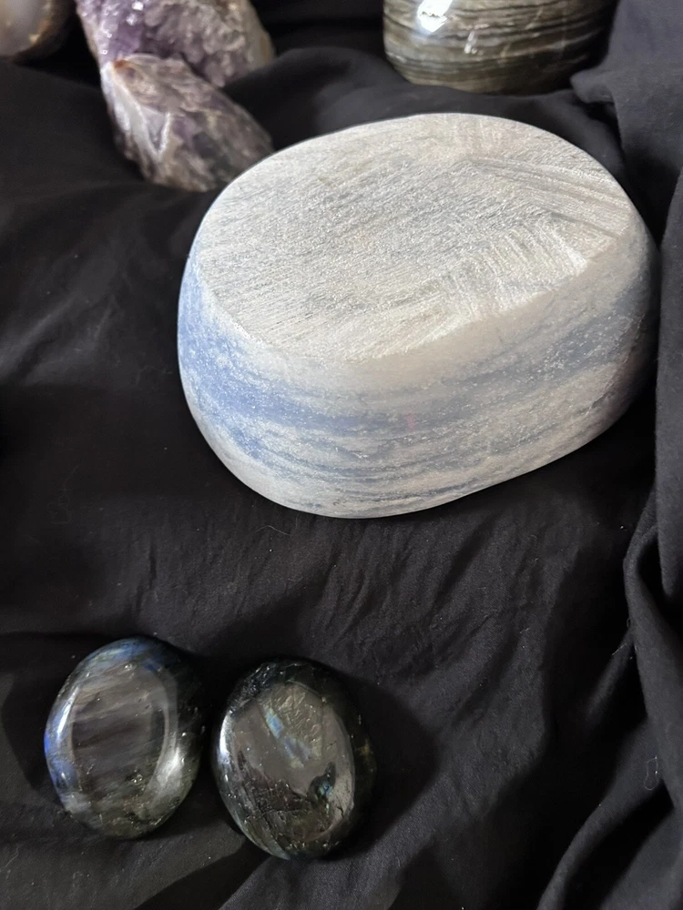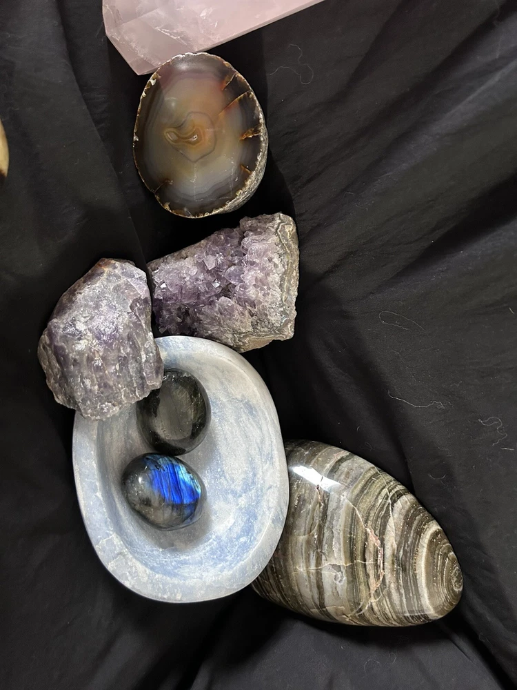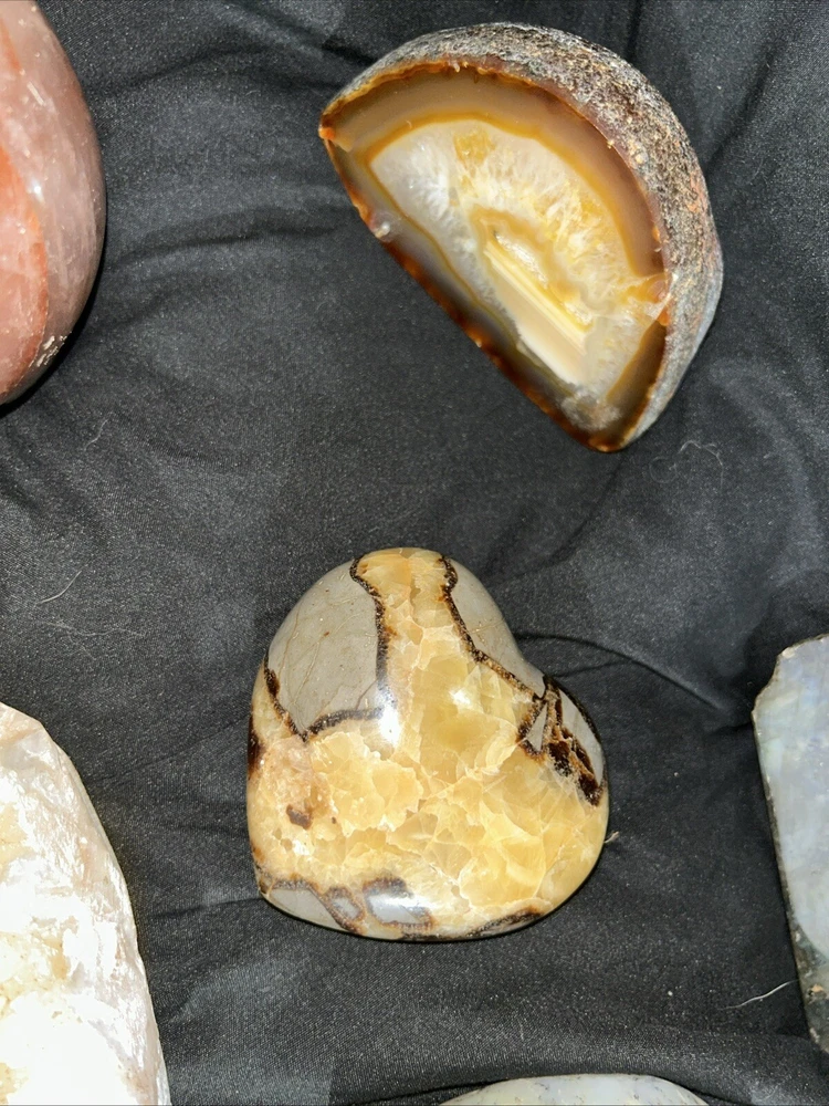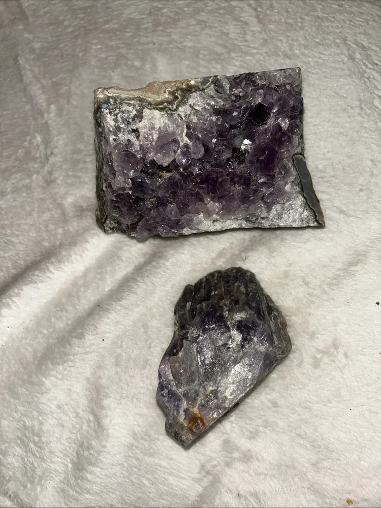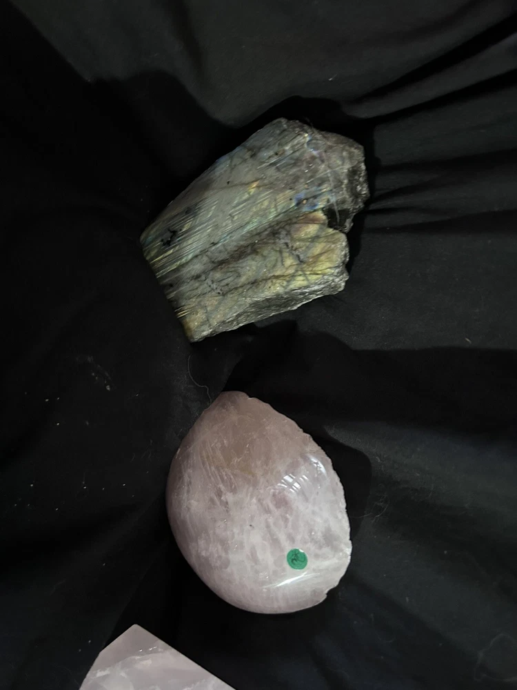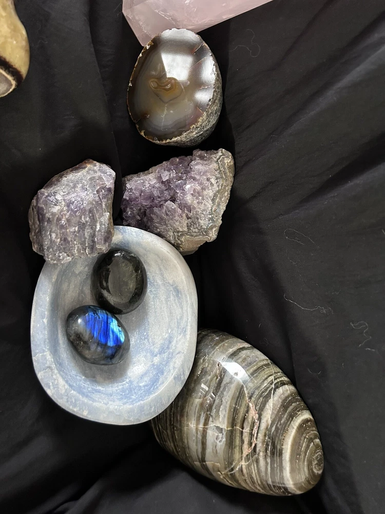 I dont know one family that doesnt have at least one person that loves ROCKS! Gods best natural creation !! one of the most natural gifts from God Above and thats the beauty and energy that we get from rocks ! Theres 15 pcs in this soul moving lot!’ Beautiful !! 1) large pc of jasper ! Curvy stripes ! Obicular Jasper! 7” by 5.5” 2 1/4” 2) 1- tall rose quartz tower 9” by 2 1/4” 6 sides 2- rose quartz one side polished 4 1/4” by 3 1/4” by 1” 3) everyone seems to love the bluelace agate bowl 5.5” x 6” x 2” !! Luv rm! 4) 1-amethyst crystal from Brazil 5” x 3 1/2” x 3” self standing pc. 2- 3.5” x 2.5” x 1.5” chard like pc natural unpolished 5) labradorite one self standing chunk 1 polished side 4.5” x 3 1/ x 1 1/4” 2 plam stones labradorite 2” x 1 3/4” x 3/4” ovals polished completely very pretty to the eye!! 6) Beautiful heart yellow gold crystal sedtarian heart natursl markings! Gorgeous both sides!! 3 1/2” x 3 3/4” x 1” 7) 2- special agates! 1) free standing then dendrite Opal agate! 3 1/2” x2 1/2” x 1 1/4” polished all sides 2) flowering agate has little pieces of a petrified flower petals some look like maybe they have squashed together, but on one side they are where you can tell kind of this flower petals. 3.5” x 2” x 1.5” small but beautiful!! 8) dusty crystal quartz 4 “ x 2 1/4” x 1 1/2” this had a pinkish shiney look on the sides unusual 9) smooth cut in half egg shaped agate polished center 3 1/2” x 3” x 3” 10) mushroom made from Jasper!! 4” tall by 4” diameter ! Should be a total if 15 pcs. Sold as is i do not accept returns on rocks they will be insured There are a couplefleabites on the top part of the rose quarts tower it canbe smoothed out just normal wear n tear! Any questions give me a hollar! Thank You