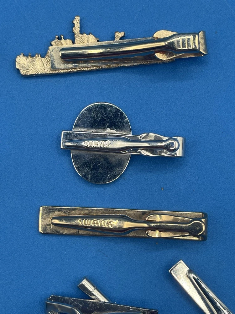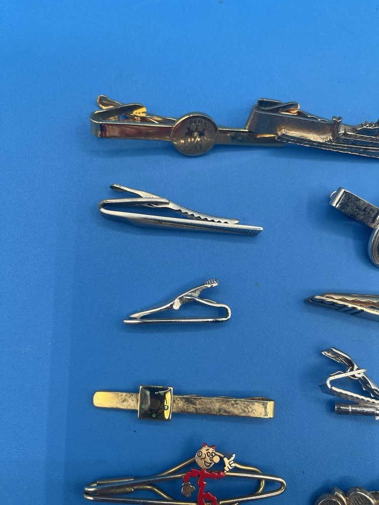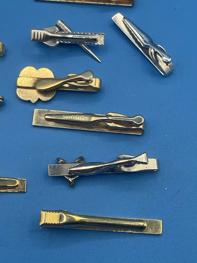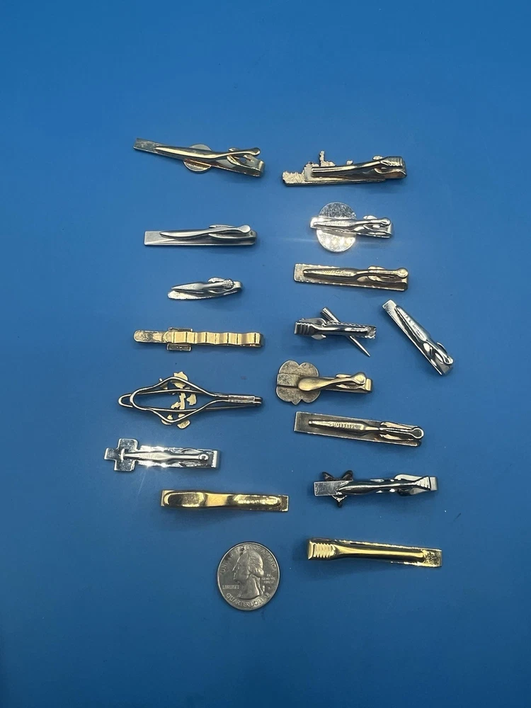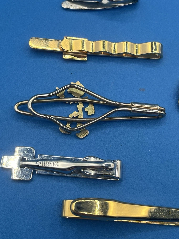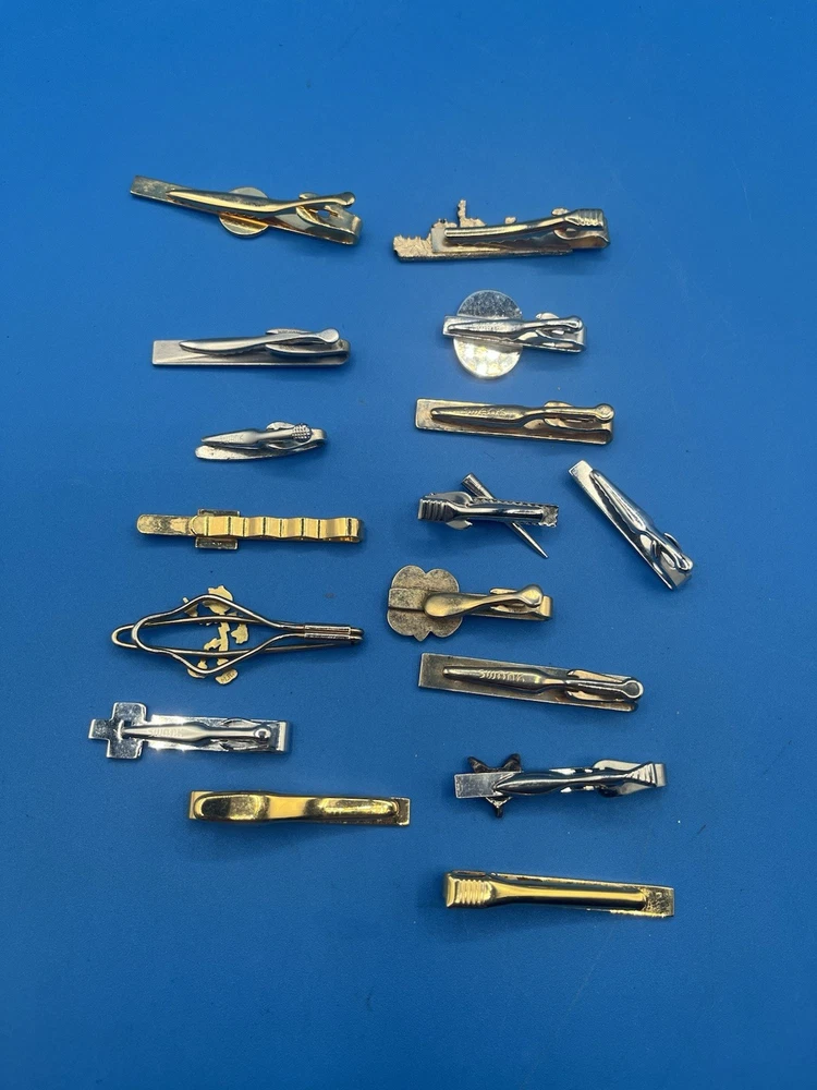 This lot of 16 vintage tie clasps and clips includes a variety of brands such as Swank, Hikok, Reddy, and Kilowatt. These stylish accessories are perfect for adding a touch of sophistication to any man's outfit. The tie bar/clip design ensures a secure and sleek hold for your favorite ties, making it a versatile addition to any wardrobe.