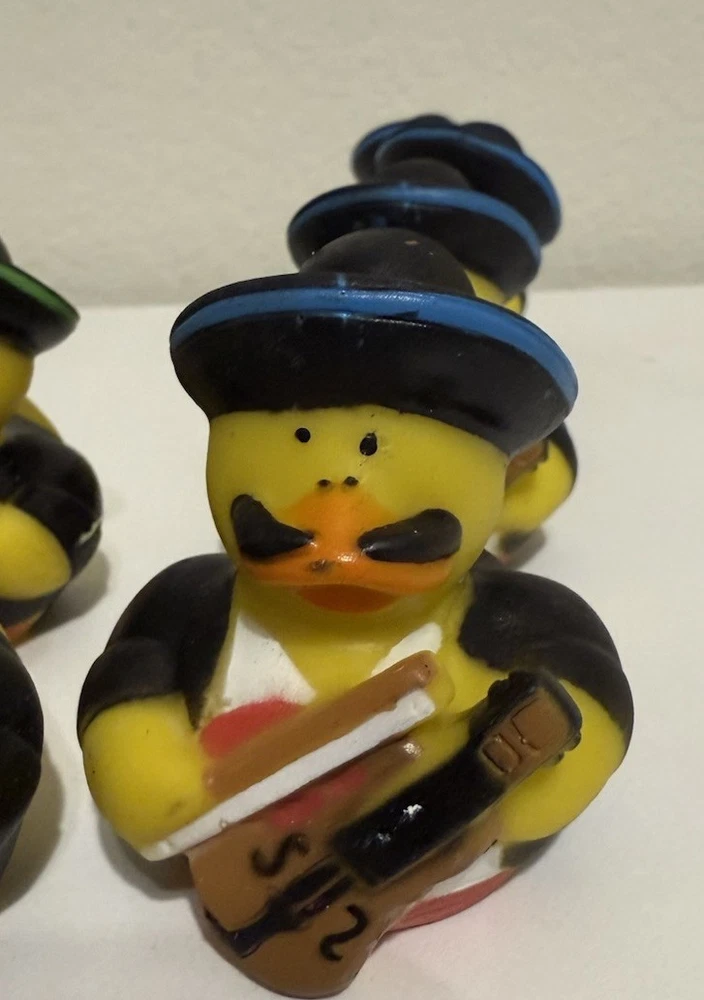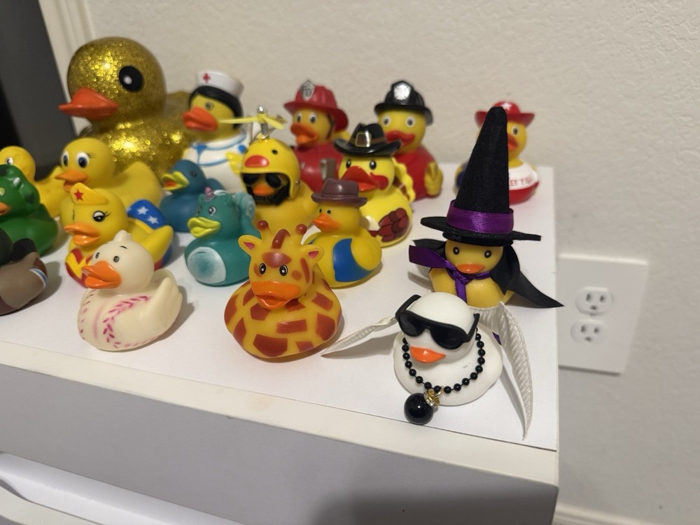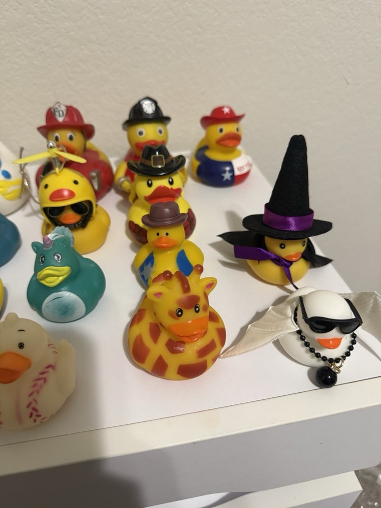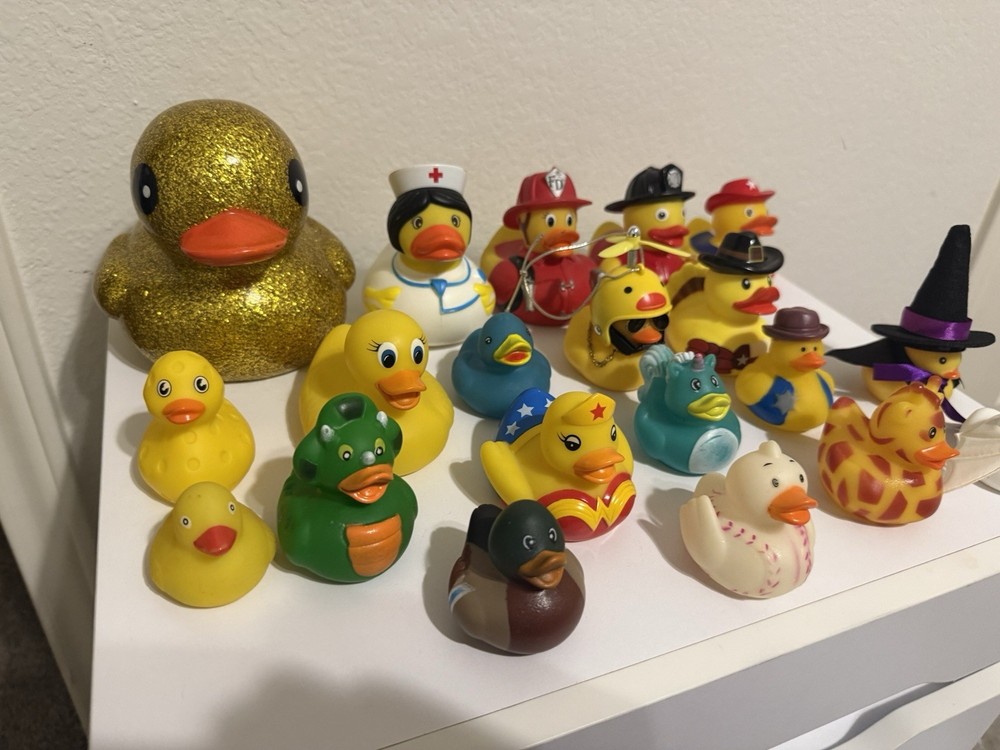 This lot of 20 rubber ducks in a variety designs These classic toys are part of the Rubber Ducks character family. Perfect for children or Adults who love collecting rubber ducks for their Jeep or playing with them in the bath, this set offers a fun and colorful addition to any toy collection. Witch, Ghost, Wonder Woman, mini duck, Cowboy, firefighter, nurse, Giraffe, baseball, Dinosaur, 2 mariachi Ducks and large Glitter Duck