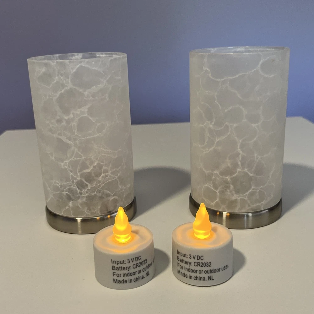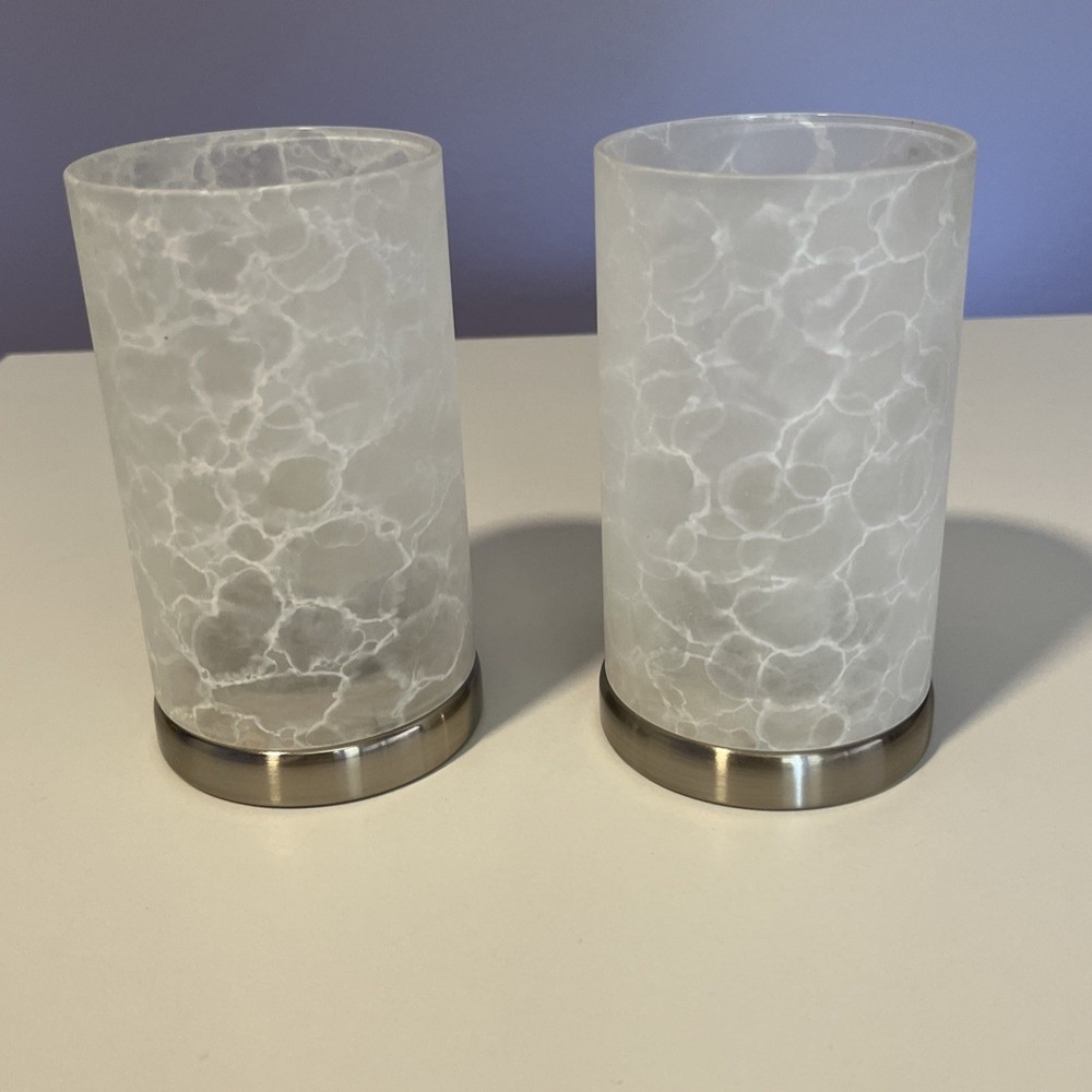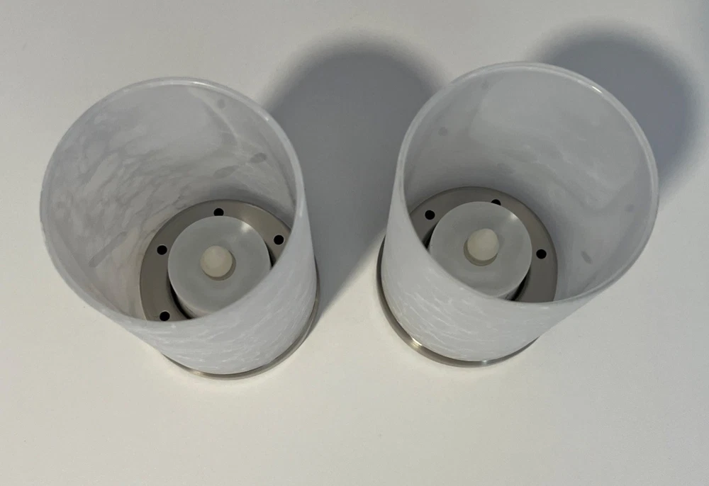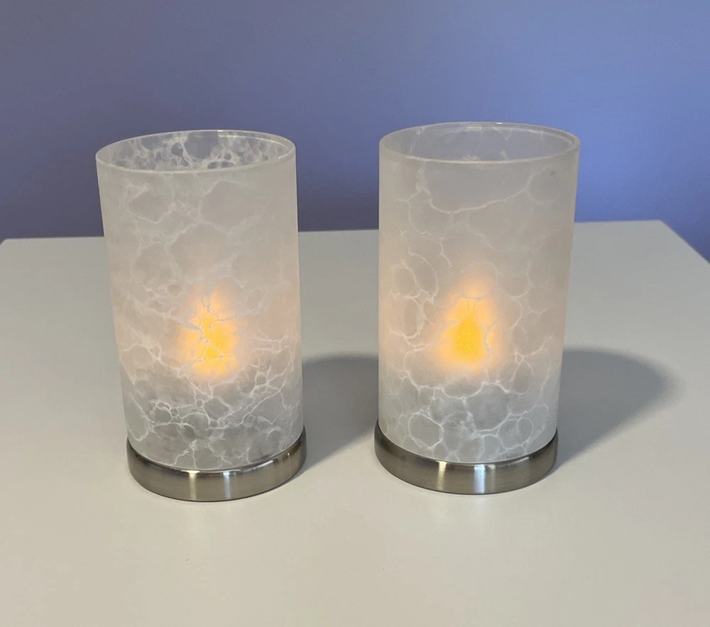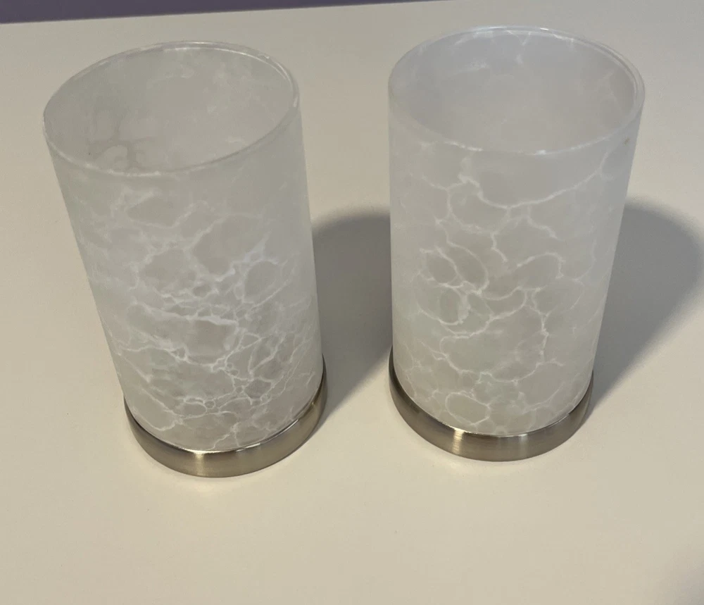Lot Of 2 Candle Holder Marbled Glass with White and Opaque "clear" color with Silver Base, Tealight candles with new batteries are Included - Stands approximately 5 1/4" Tall and is approximately 2 3/4" diameter at top. This is a pretty set that can be used safely in any room. They can be used together, such as on a dining table, or separately as needed. Tea lights included are removable. Please review all pictures carefully as they are part of the description. Questions are welcome.
