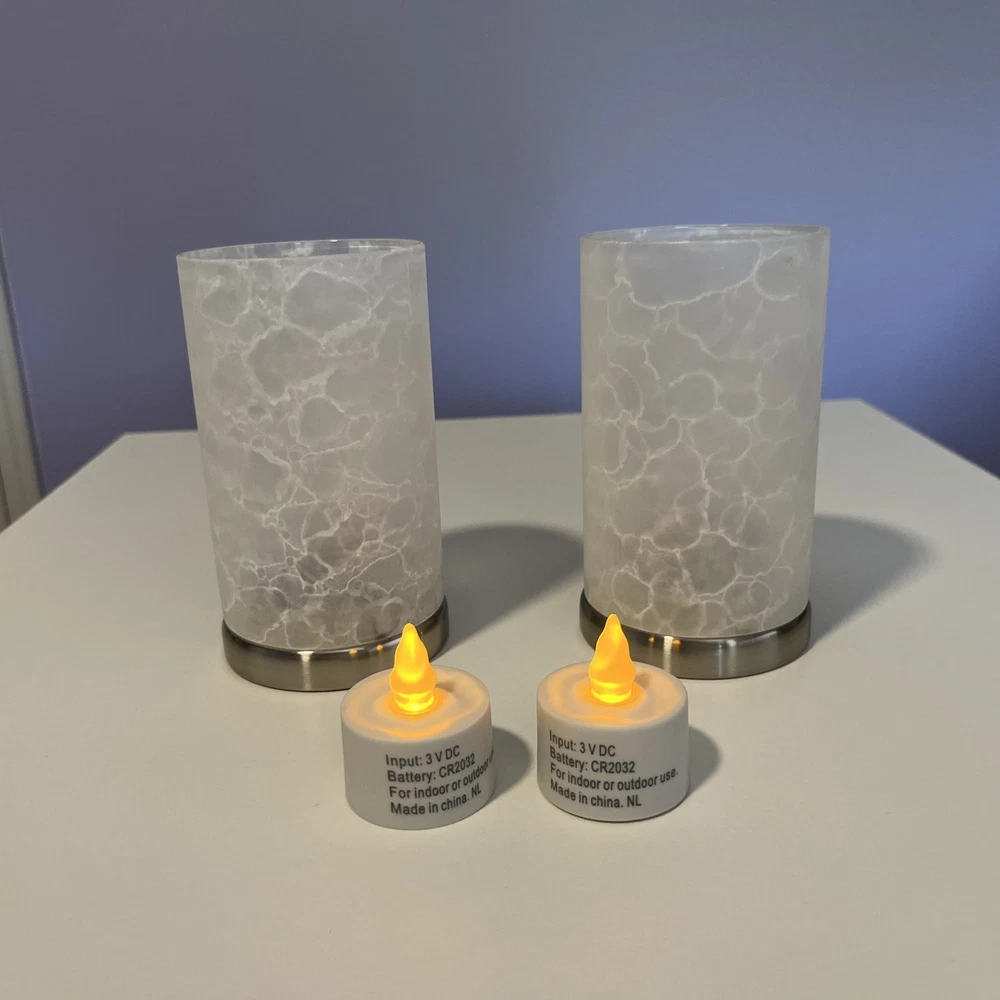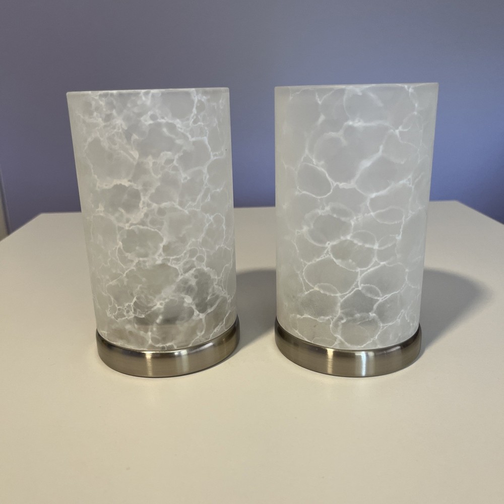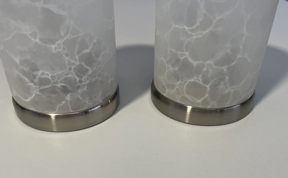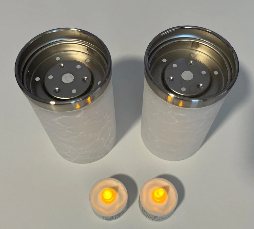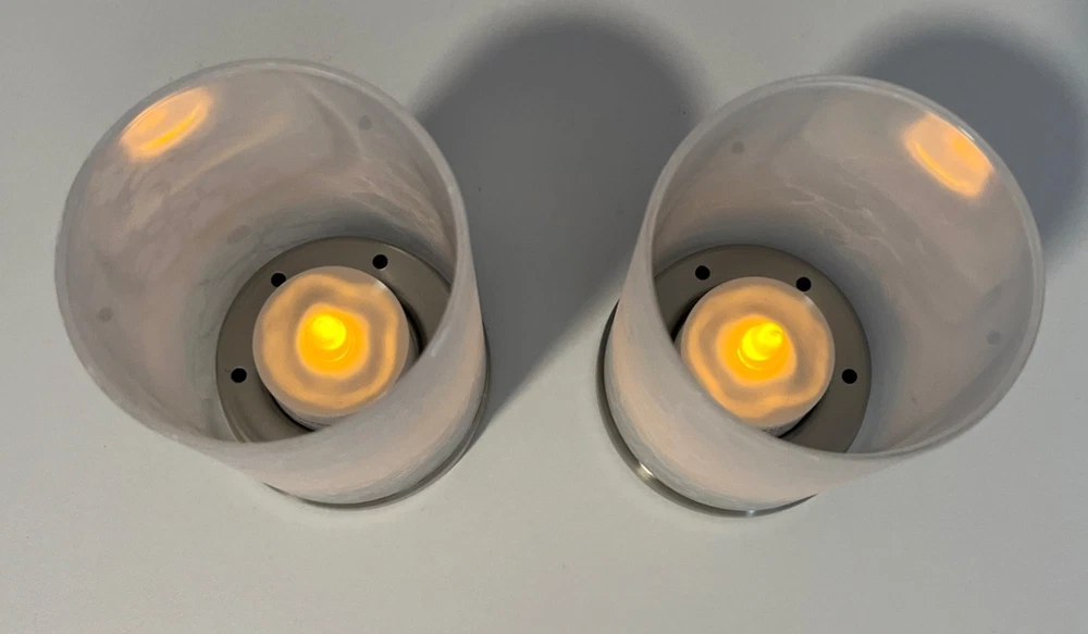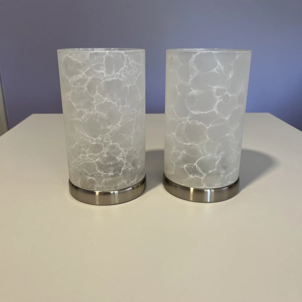 Lot Of 2 Candle Holder Marbled Glass with White and Opaque "clear" color with Silver Base, Tealight candles with new batteries are Included - Stands approximately 5 1/4" Tall and is approximately 2 3/4" diameter at top. This is a pretty set that can be used safely in any room. They can be used together, such as on a dining table, or separately as needed. Tea lights included are removable. Please review all pictures carefully as they are part of the description. Questions are welcome.