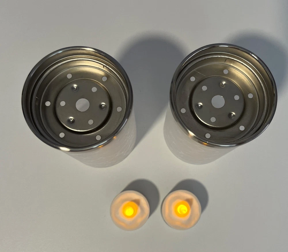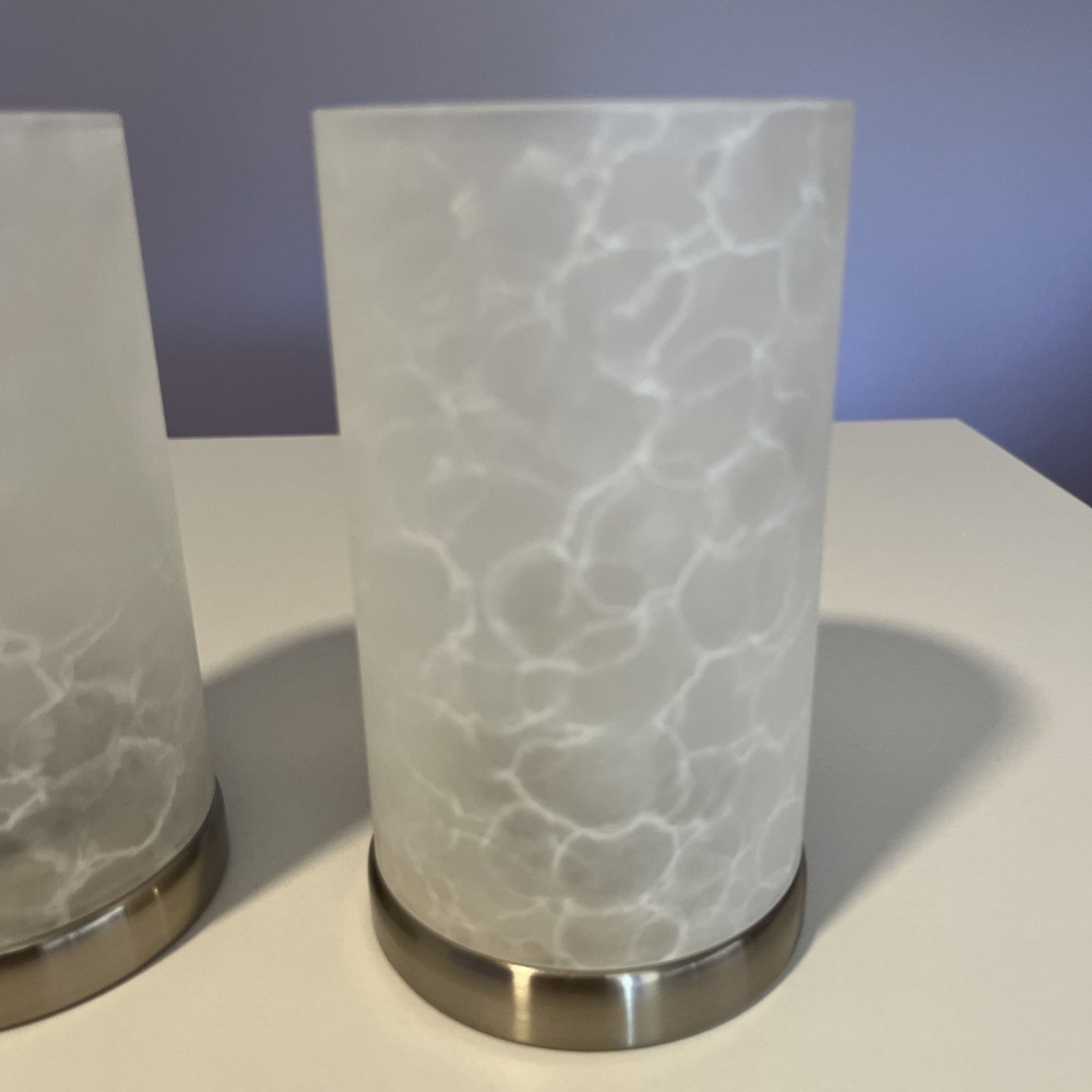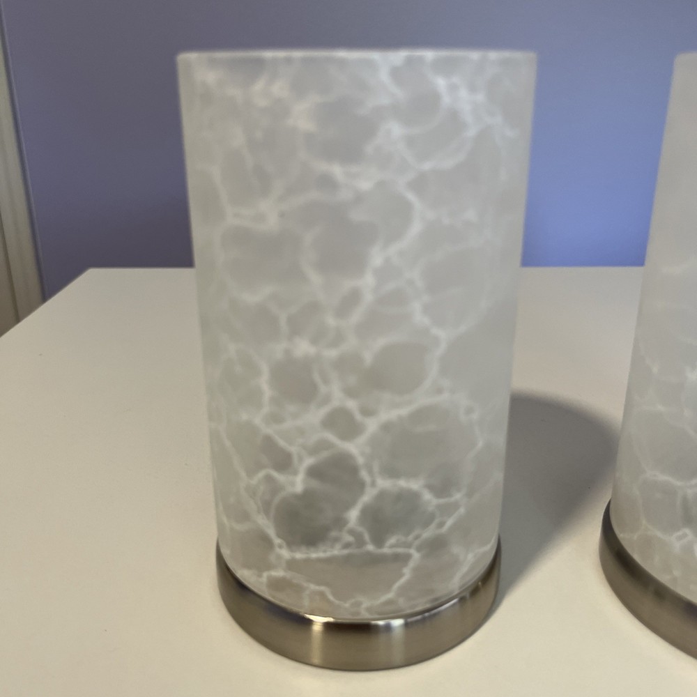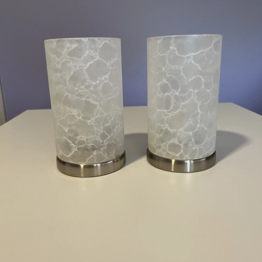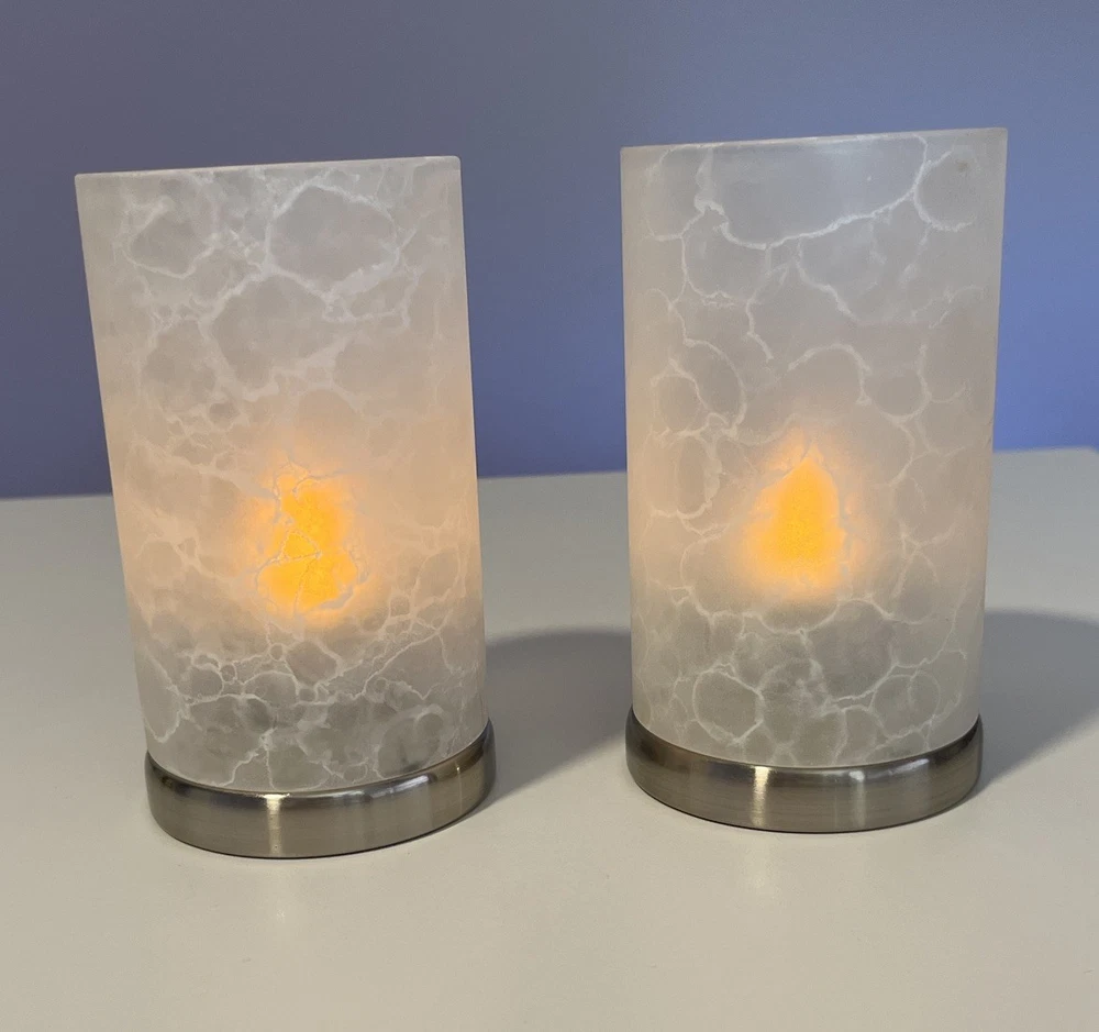 Lot Of 2 Candle Holder Marbled Glass with White and Opaque "clear" color with Silver Base, Tealight candles with new batteries are Included - Stands approximately 5 1/4" Tall and is approximately 2 3/4" diameter at top. This is a pretty set that can be used safely in any room. They can be used together, such as on a dining table, or separately as needed. Tea lights included are removable. Please review all pictures carefully as they are part of the description. Questions are welcome.