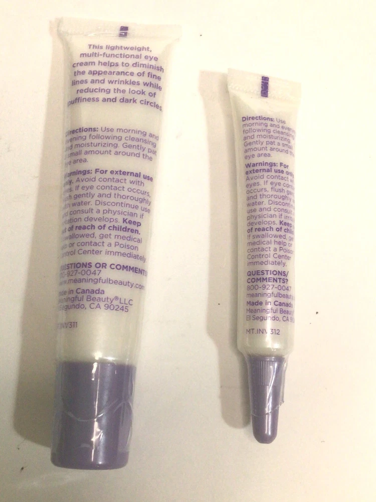 Custom Bundle: No Size: Regular Volume: 0.5 Fl Oz And 0.17 Fl Oz Department: Unisex UPC: Does not apply Product Line: MB Cindy Crawford MPN: n/a Formulation: Cream Main Purpose: Early Signs of Aging Sun Protection Factor (SPF): SPF 0 Features: Contains Antioxidants Type: Renewal Ingredients: Glycerin UVA Protection: n/a Brand: Meaningful Beauty gtin13: Does not apply Country/Region of Manufacture: United States Expiration Date: n/a Body Area: Eyes Active Ingredients: Hyaluronic Acid Skin Type: All Skin Types Period After Opening (PAO): n/a Modified Item: No