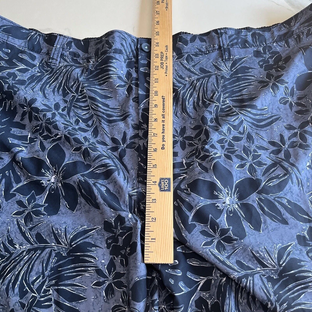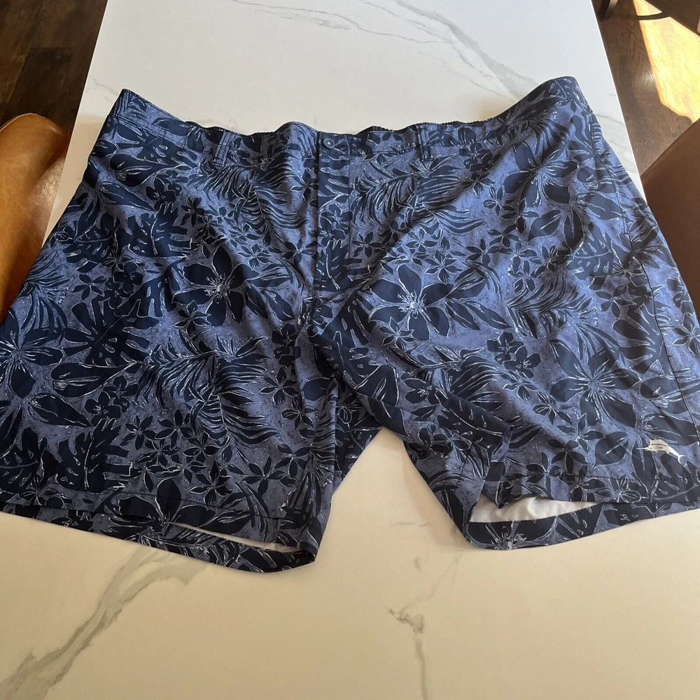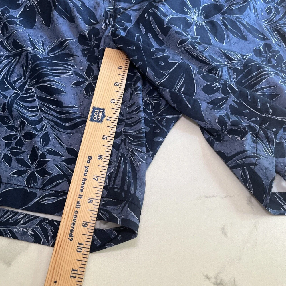 Elevate your beach look with these stylish Tommy Bahama Relax Swim Trunks. These shorts come in a solid blue color with a tropical floral pattern and are made of a blended fabric of polyester and spandex. The mesh lining provides a breathable and comfortable fit, while the elastic waist and drawstring ensure a perfect fit for any activity, whether it be surfing or just lounging by the pool. These trunks also feature a built-in brief, back pocket, and additional pockets to keep all your essentials safe. Perfect for a beach or pool day, these Tommy Bahama shorts will make you feel stylish and comfortable all day long. Excellent, preowned condition. See photos for measurements.
