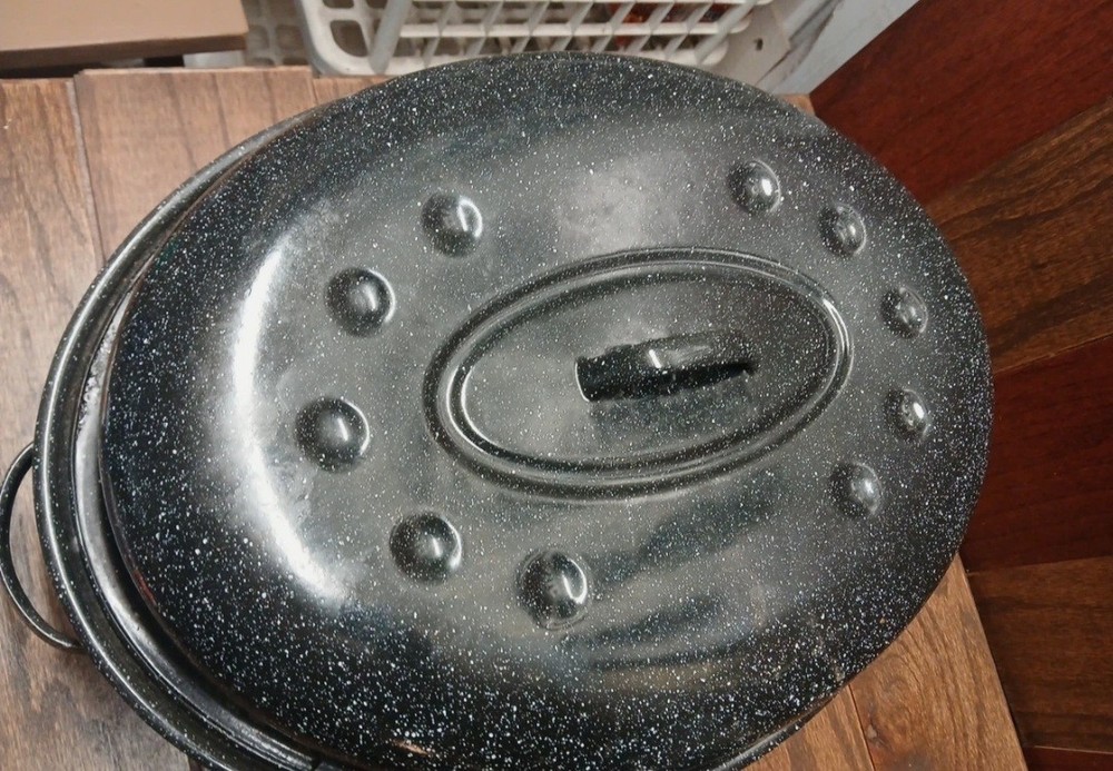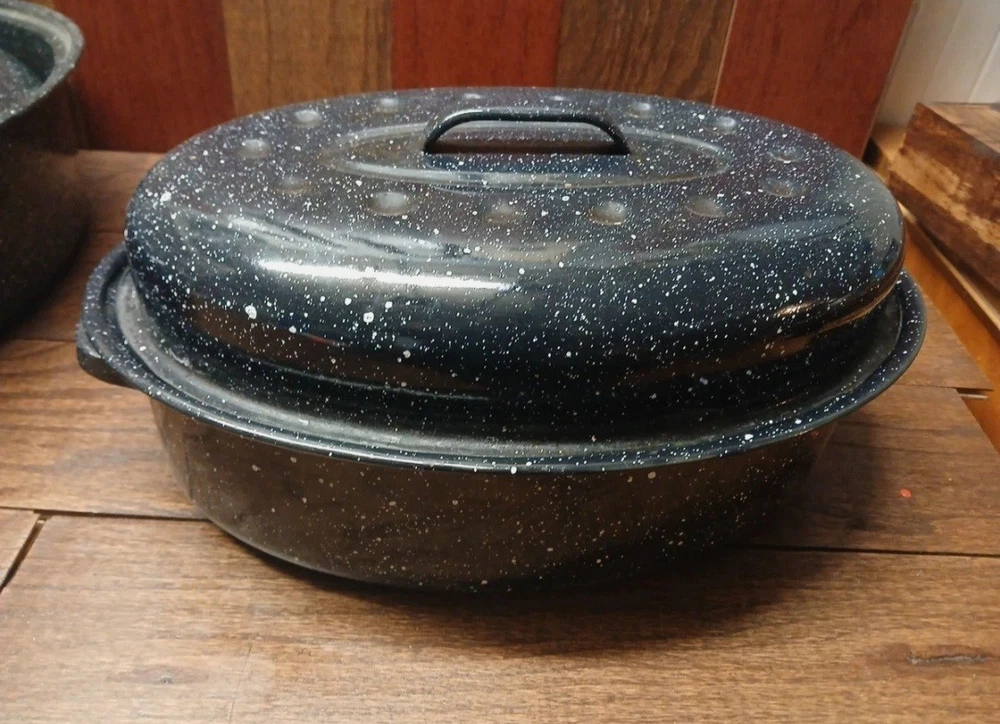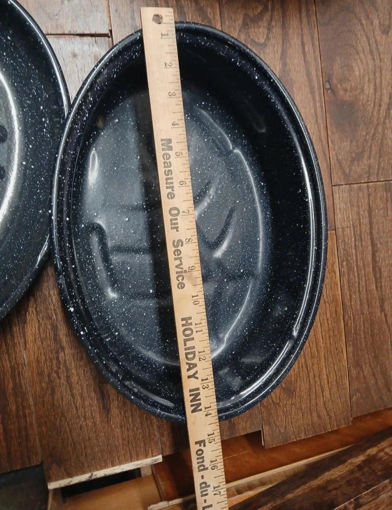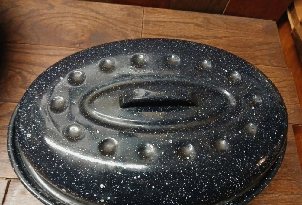 HomeLot Of 2 VNTG Black Enamel Granite Round And Oval Roasting Pan with lid 14" 18"