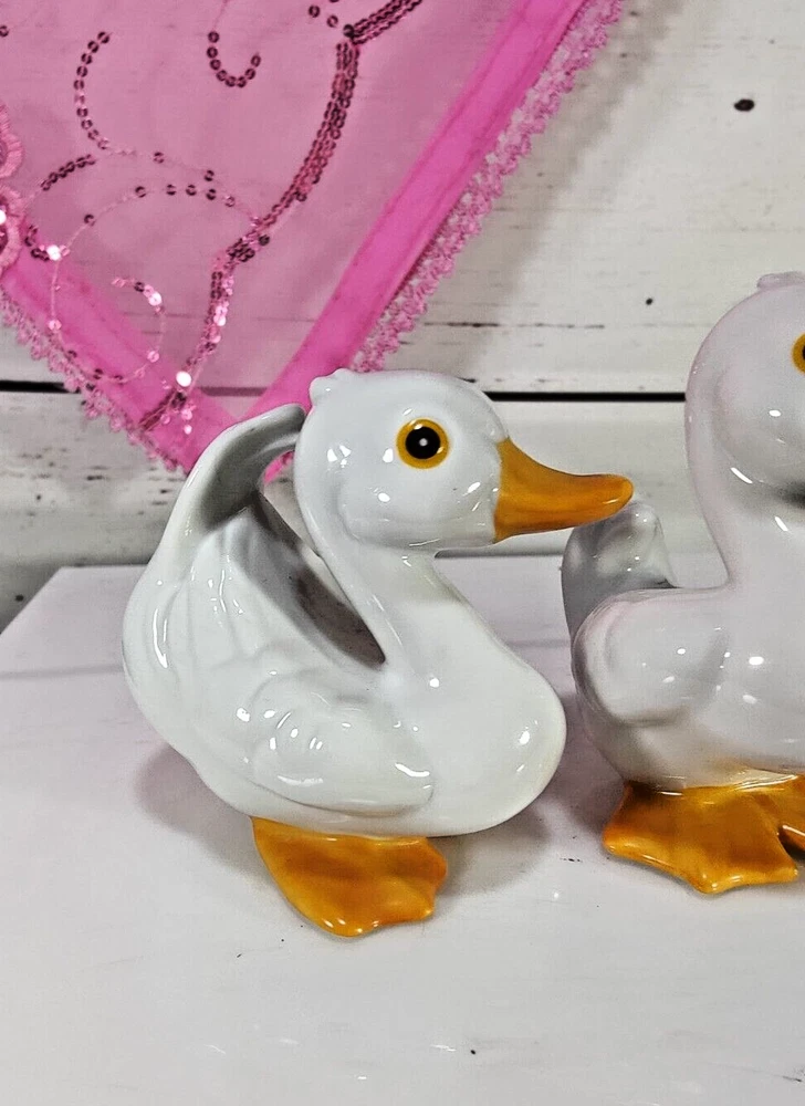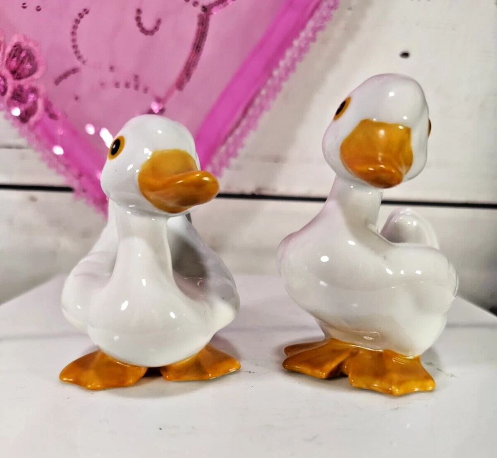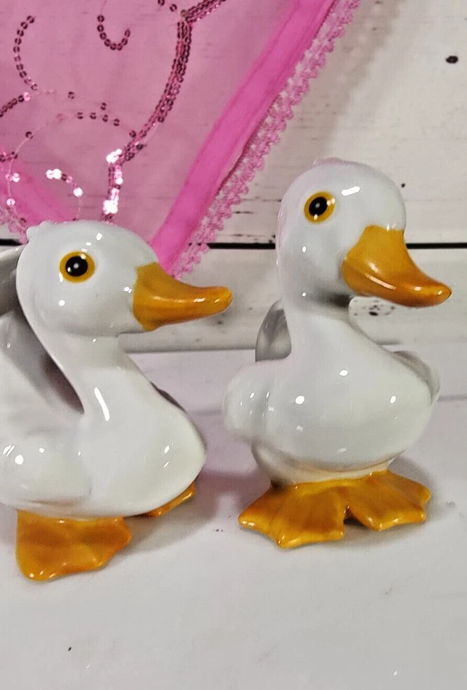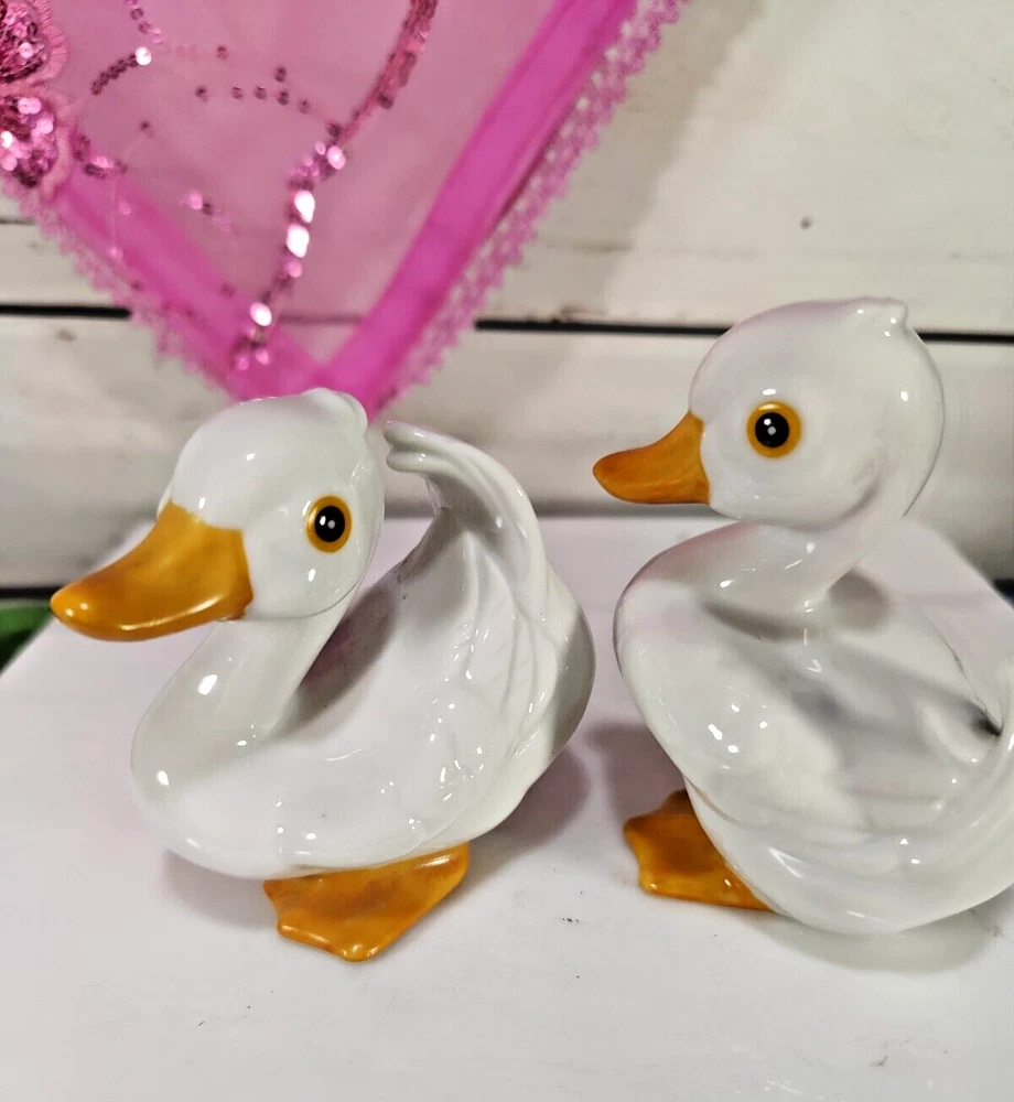 Add a touch of vintage charm to your decor with this lot of two Homco white ceramic duck figurines. These small figurines are perfect for any room and occasion, whether you're looking to decorate your living room or add to your collection of animal-themed collectibles. The glossy finish and all-over pattern make these ducks a unique addition to your decor. Measuring at 3 inches in length, these original figurines from the 1970s are not signed and come in a set of two. The brand, Homco, is known for its quality ceramic products and these duck figurines are no exception. Add a touch of whimsy and charm to your home with these adorable ducks. Please be sure to carefully examine all photos. Feel free to ask questions and to submit offers. As always, Gertie and I thank you for your business. Be sure to follow us on eBay for upcoming promotions!