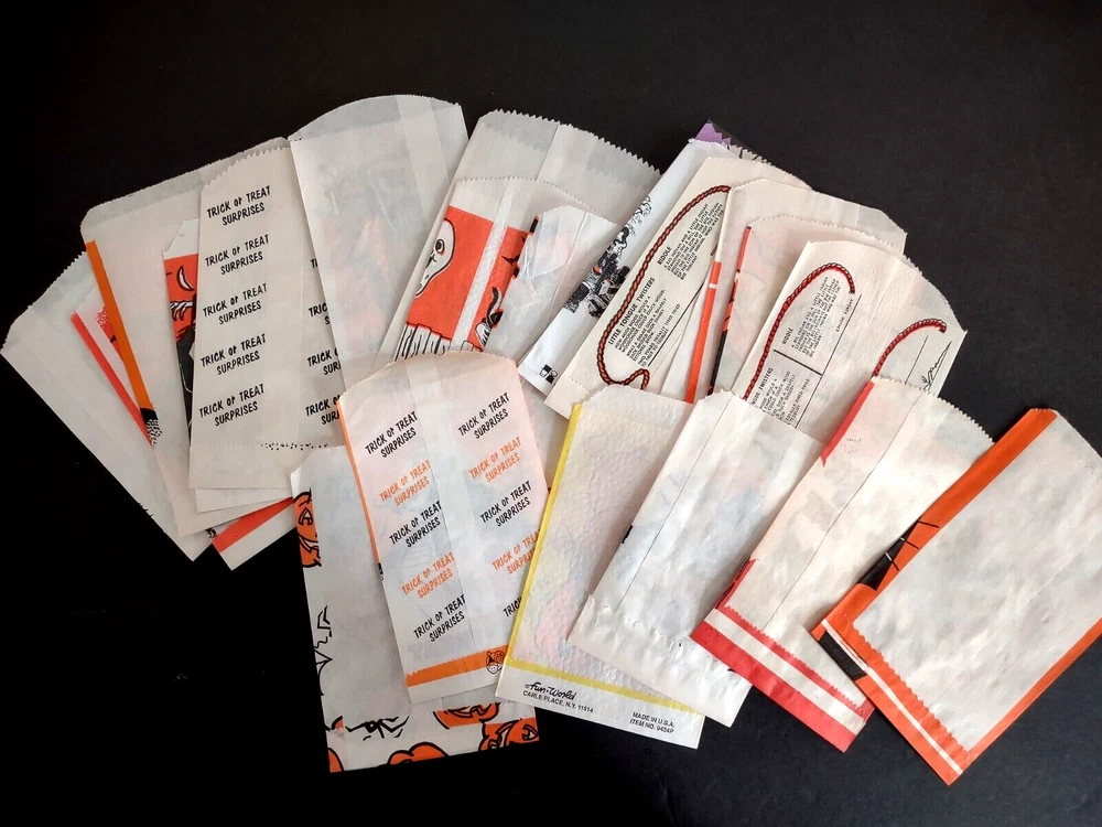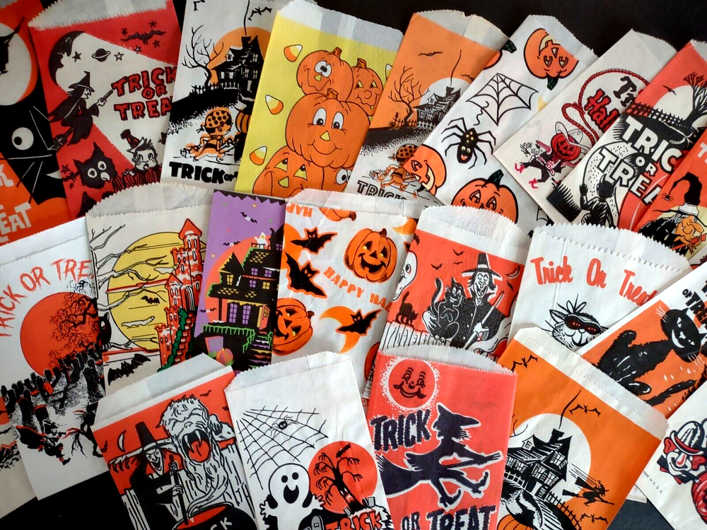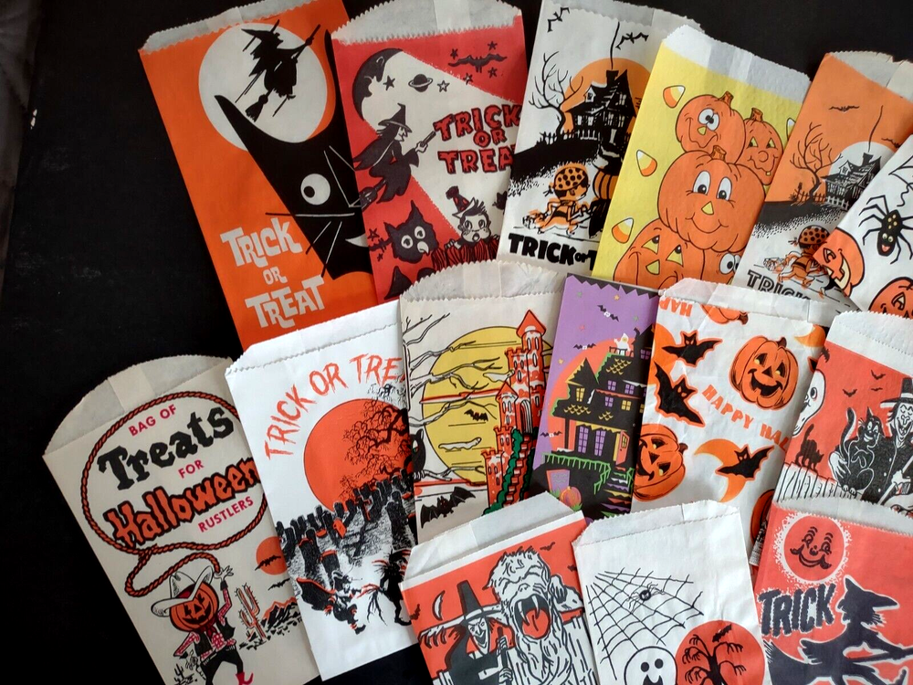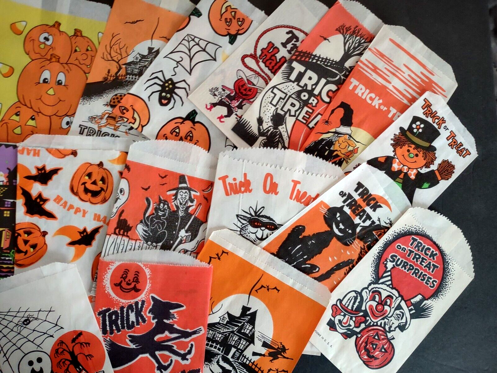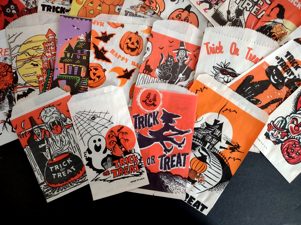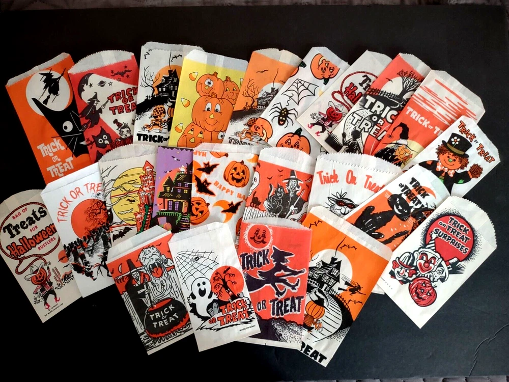 Big lot of (23) different vintage Halloween trick or treat paper or glassine bags. UNUSED old stock. Some do have wrinkles and storage wear. More vintage Halloween and holiday items for sale in our store. SHIPPING Buyer pays shipping and handling. Bundle and save by using cart and making single payment. International buyers are responsible for any import fees/taxes. Check back for more unique items. Vintage Halloween Collectibles Make Great Holiday Gifts!