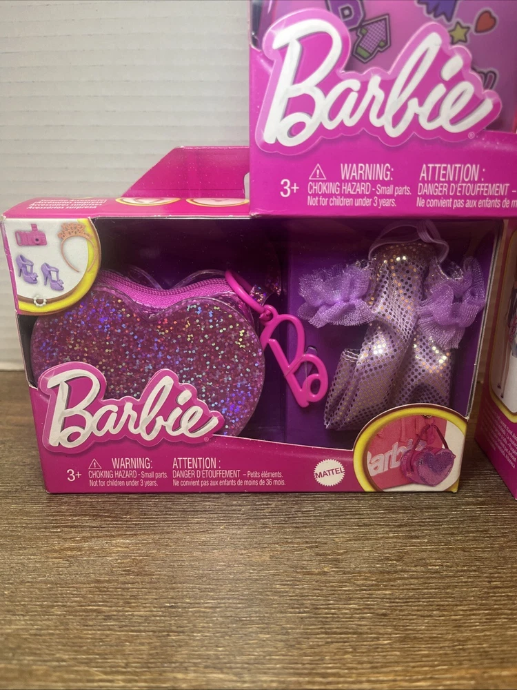 The product is a lot of three Barbie doll clothes accessory packs. Each pack includes an outfit themed accessory made of cloth material suitable for children aged 3 years and above. The Barbie brand is featured, making these sets ideal for doll playsets.
