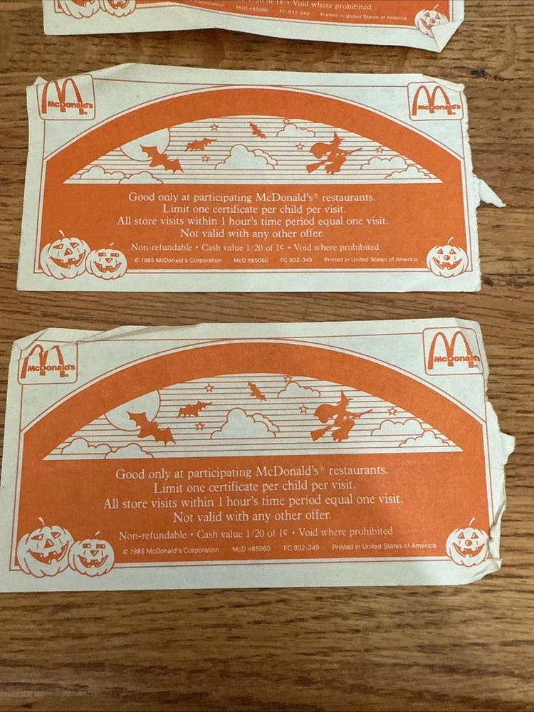 For sale is a Lot Of 3 McDonalds Halloween Gift Certificates Coupon 1985 Vintage. These are used and have folds on them. Some of the corners are rough. Please see all of the pictures for more details. Thanks for looking.