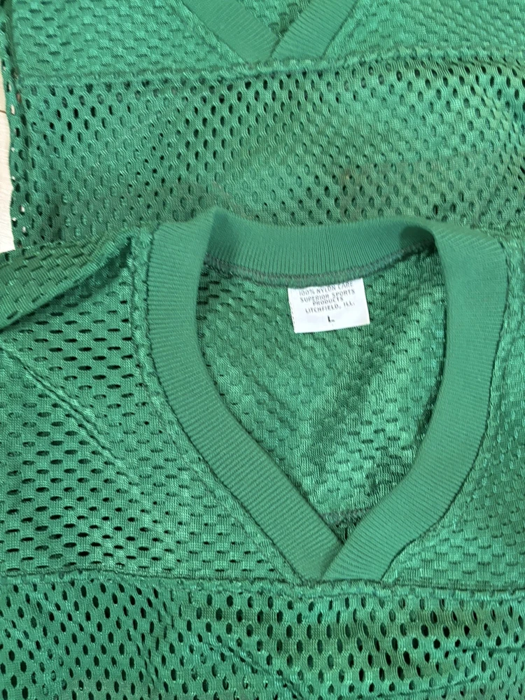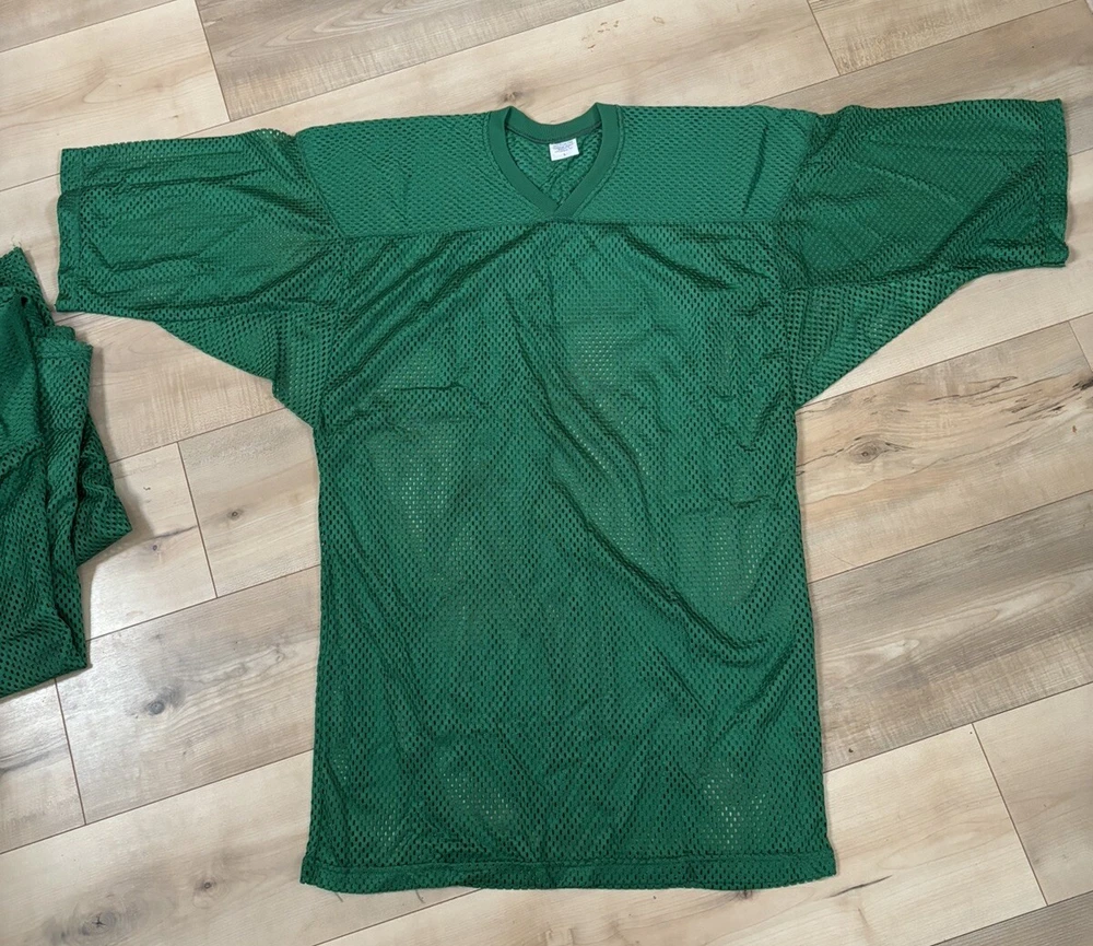 This lot includes three vintage retro men's jerseys in Kelly green color. Made of high-quality nylon material, these jerseys are perfect for collectors and fans alike. They are available in size large and feature a unique all mesh design. The jerseys are ideal for anyone looking to add a touch of vintage style to their wardrobe. With their bold and bright green color, they are sure to stand out in any collection.