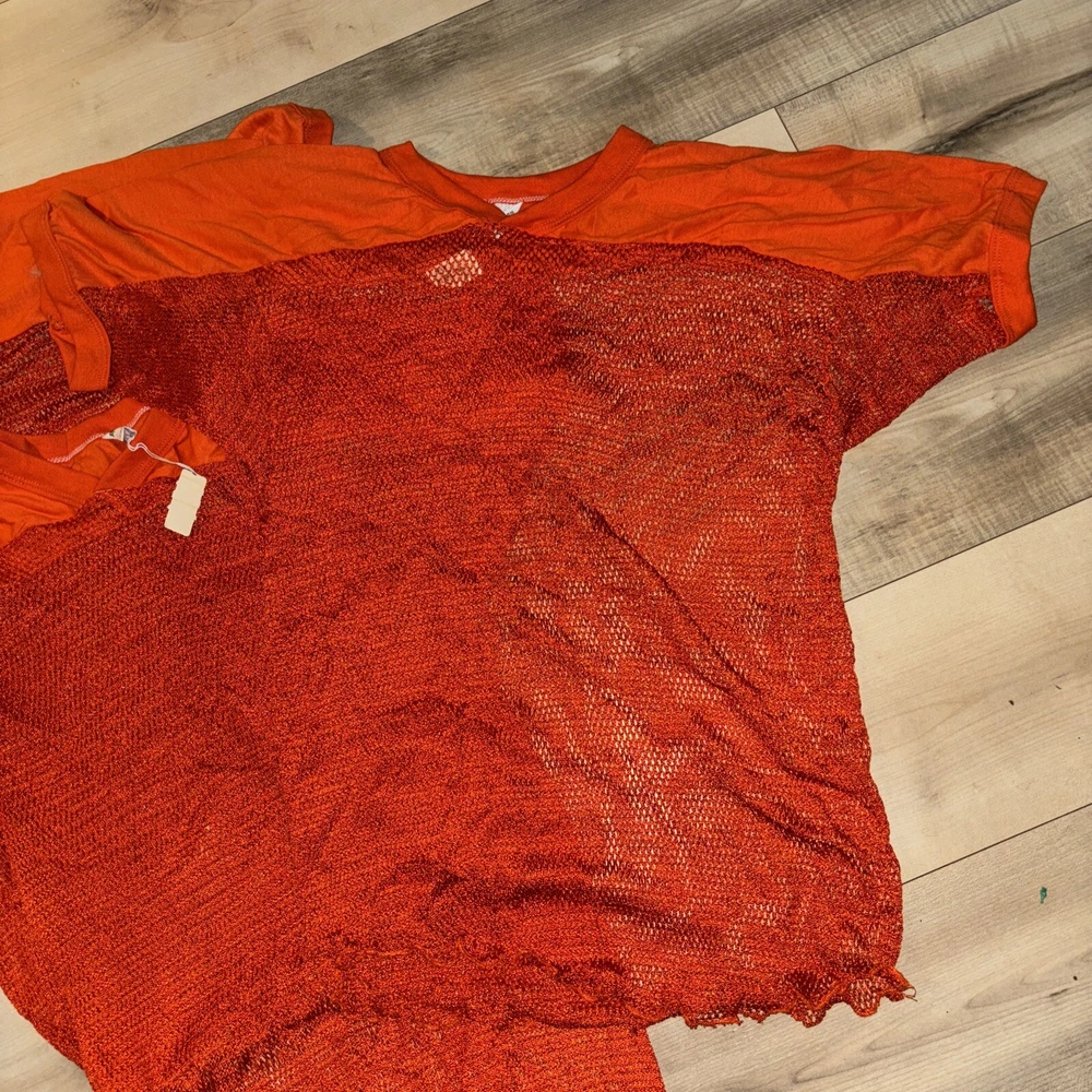 This lot includes 3 vintage Russell Athletic mesh jerseys in size small. These jerseys are perfect for anyone looking to add a retro touch to their wardrobe. Made from high-quality jersey material, these shirts are both comfortable and durable. The orange color adds a pop of color to any outfit. These shirts are perfect for casual wear or for sporting events. Don't miss out on the chance to own these unique and stylish shirts.
