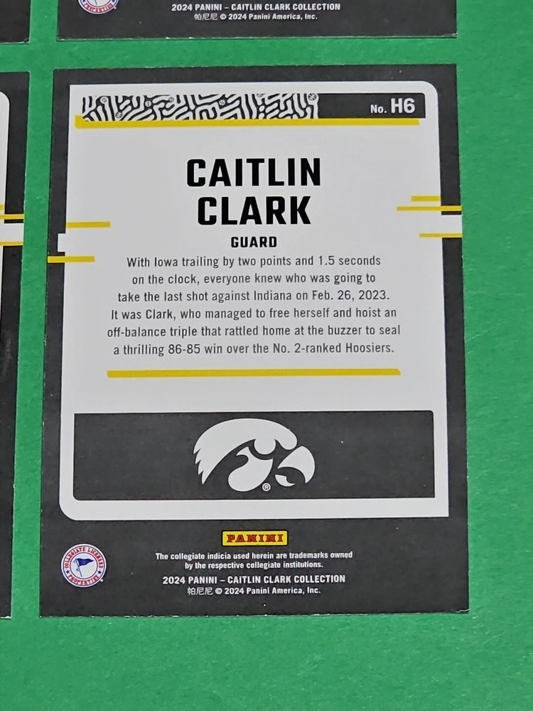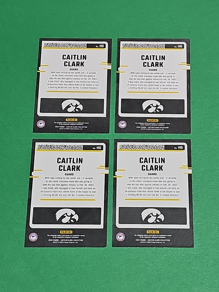 You will receive the exact cards pictured. This Lot of 4 Caitlin Clark Rookie 2024 Panini Donruss Highlights Iowa Hawkeyes Cards No. H6. Pay only $1.50 for shipping on your first cards won & 50 cents per lot of cards won in auctions up to $5.00. $5.00 is the maximum shipping you will pay, no matter how many cards you win! Please wait until you are done with all your purchases and I will send a combined shipping invoice within 24 hours. Please check out all of my other great auctions going on now! I have several Caitlin Clark Auctions going on now! Thanks for looking & good luck!!