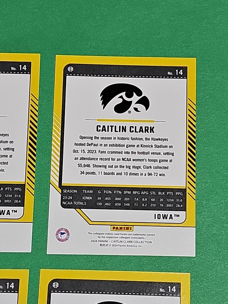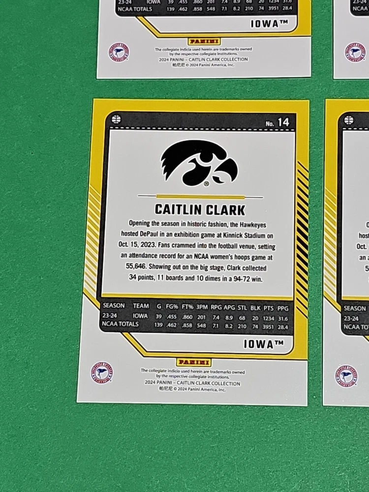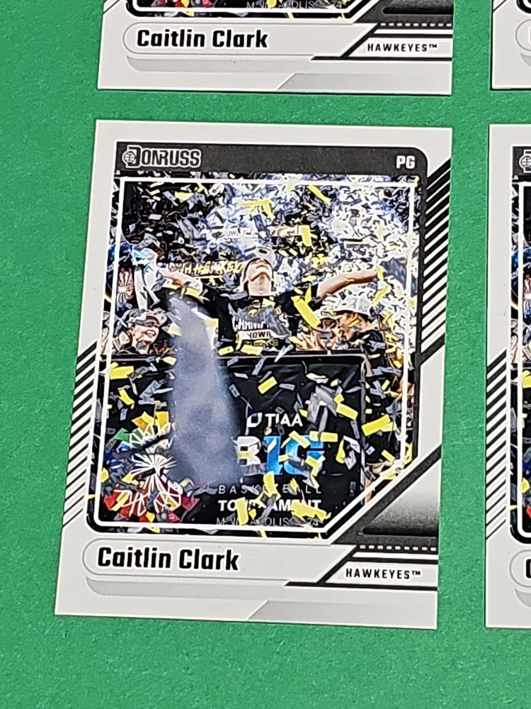 You will receive the exact cards pictured. This Lot of 4 Caitlin Clark Rookie 2024 Panini Donruss Iowa Hawkeyes Card No. 14. Pay only $1.50 for shipping on your first cards won & 50 cents per lot of cards won in auctions up to $5.00. $5.00 is the maximum shipping you will pay, no matter how many cards you win! Please wait until you are done with all your purchases and I will send a combined shipping invoice within 24 hours. Please check out all of my other great auctions going on now! I have several Caitlin Clark Auctions going on now! Thanks for looking & good luck!!