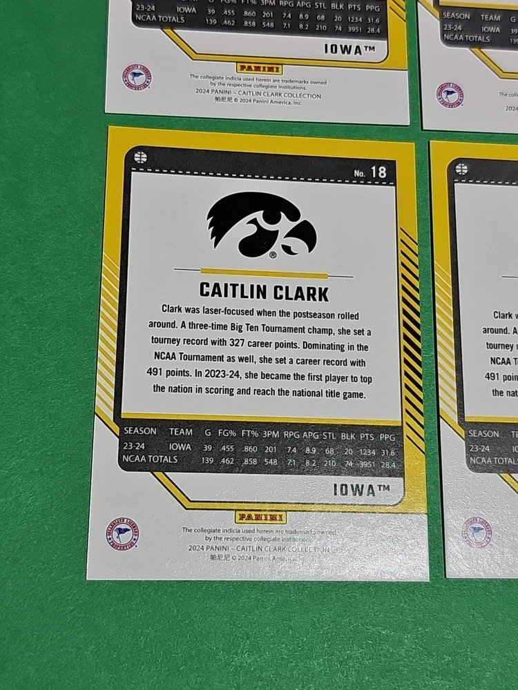 You will receive the exact cards pictured. This Lot of 4 Caitlin Clark Rookie 2024 Panini Donruss Iowa Hawkeyes Card No. 18. Pay only $1.50 for shipping on your first cards won & 50 cents per lot of cards won in auctions up to $5.00. $5.00 is the maximum shipping you will pay, no matter how many cards you win! Please wait until you are done with all your purchases and I will send a combined shipping invoice within 24 hours. Please check out all of my other great auctions going on now! I have several Caitlin Clark Auctions going on now! Thanks for looking & good luck!!