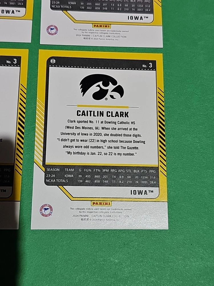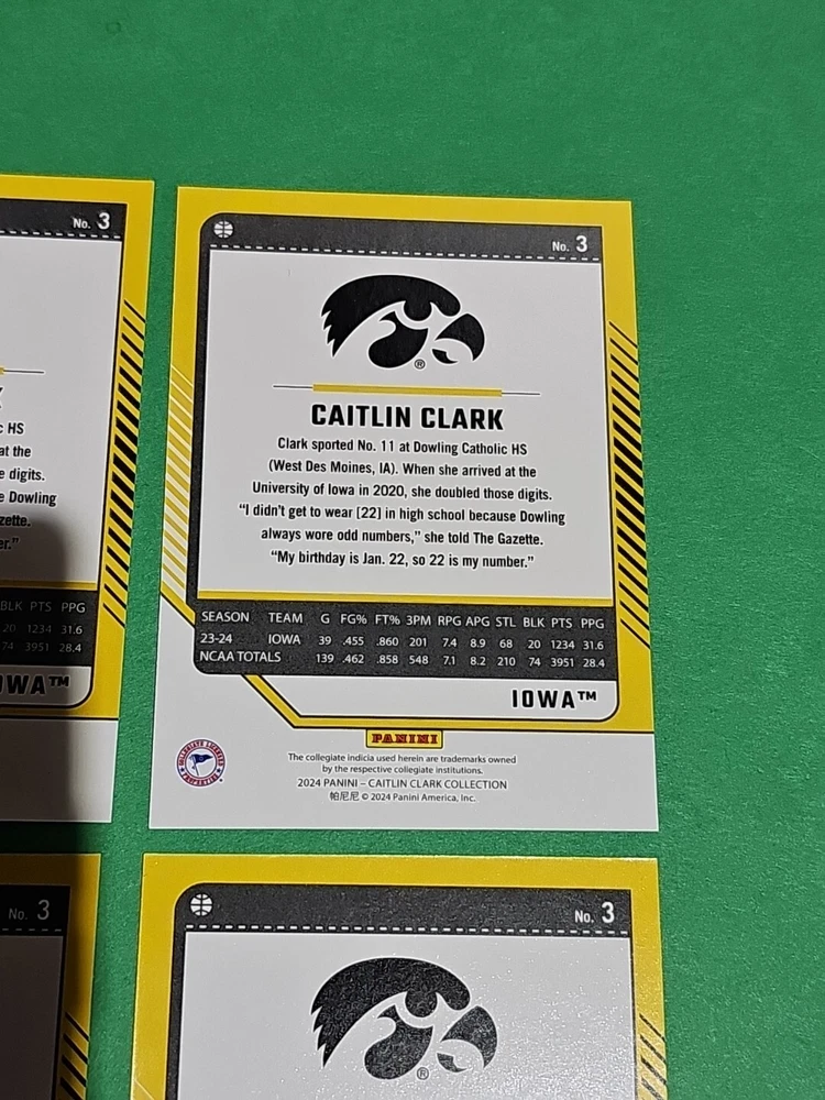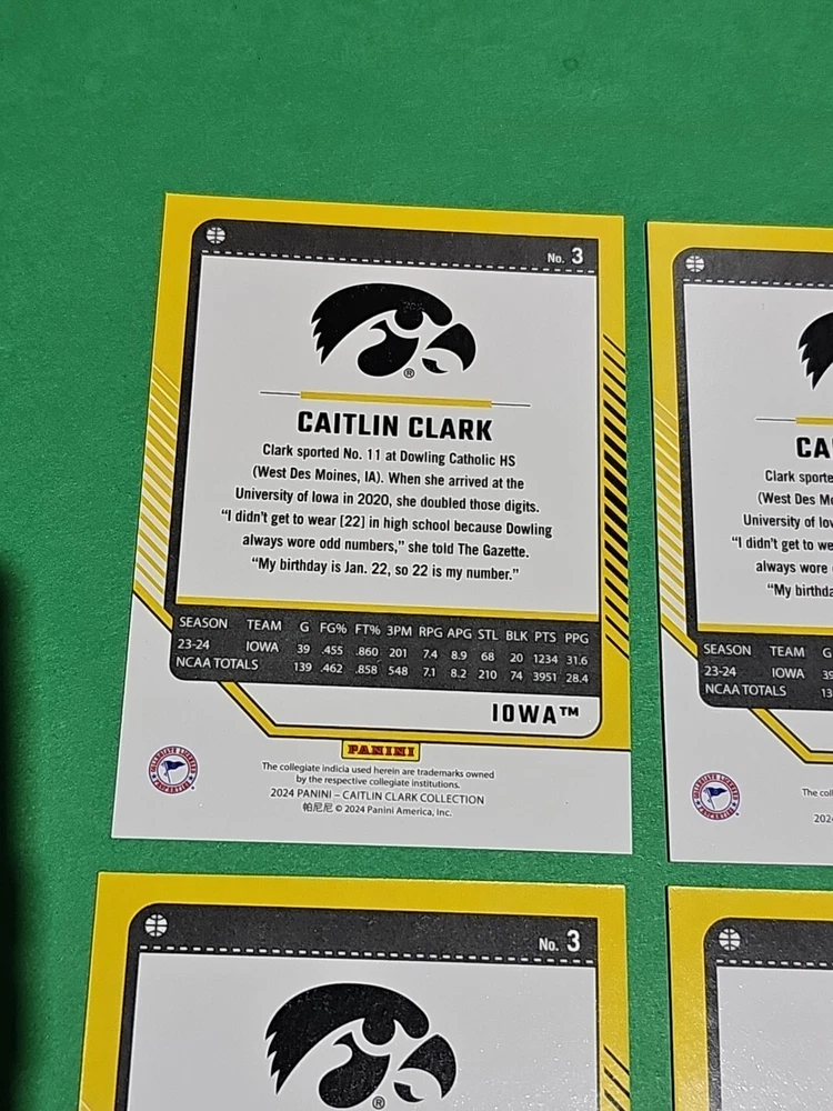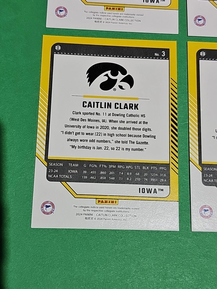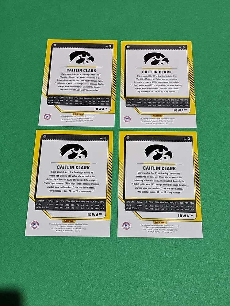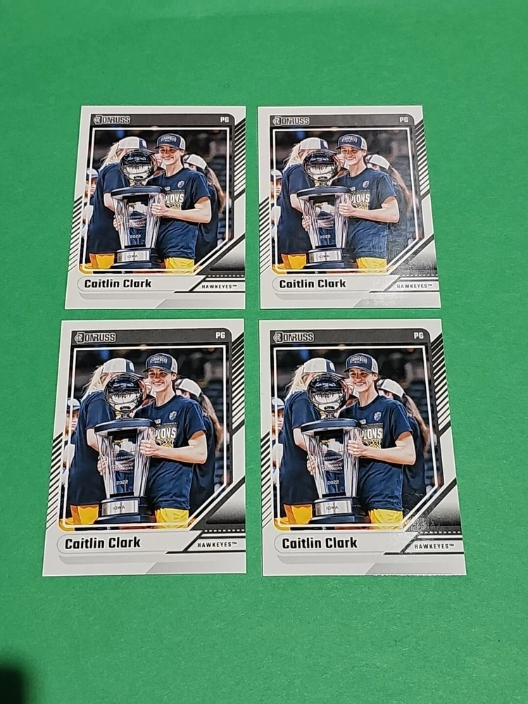 You will receive the exact cards pictured. This Lot of 4 Caitlin Clark Rookie 2024 Panini Donruss Iowa Hawkeyes Card No. 3. Pay only $1.50 for shipping on your first cards won & 50 cents per lot of cards won in auctions up to $5.00. $5.00 is the maximum shipping you will pay, no matter how many cards you win! Please wait until you are done with all your purchases and I will send a combined shipping invoice within 24 hours. Please check out all of my other great auctions going on now! I have several Caitlin Clark Auctions going on now! Thanks for looking & good luck!!