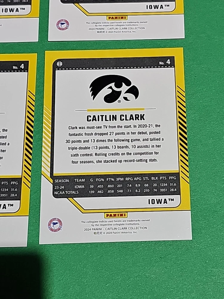 You will receive the exact cards pictured. This Lot of 4 Caitlin Clark Rookie 2024 Panini Donruss Iowa Hawkeyes Card No. 4. Pay only $1.50 for shipping on your first cards won & 50 cents per lot of cards won in auctions up to $5.00. $5.00 is the maximum shipping you will pay, no matter how many cards you win! Please wait until you are done with all your purchases and I will send a combined shipping invoice within 24 hours. Please check out all of my other great auctions going on now! I have several Caitlin Clark Auctions going on now! Thanks for looking & good luck!!