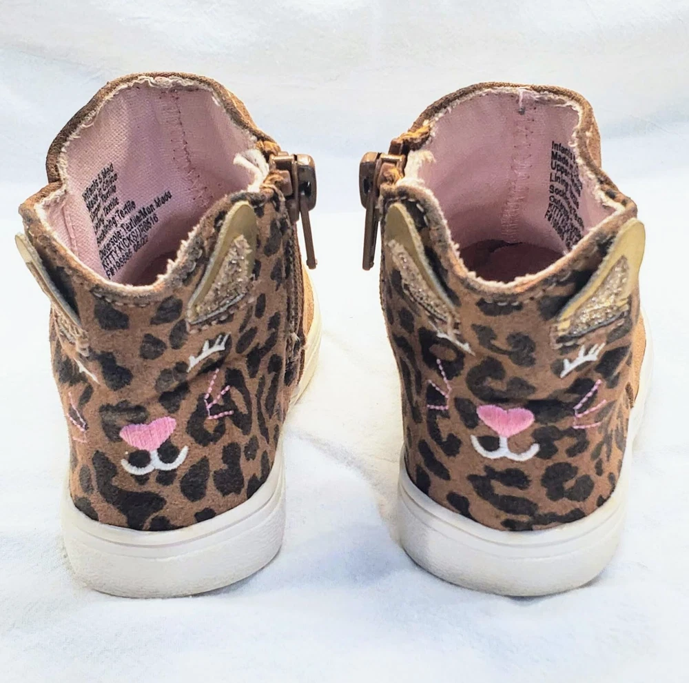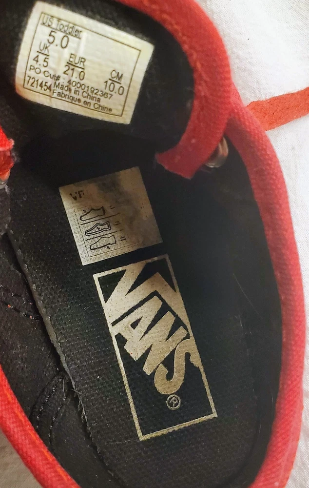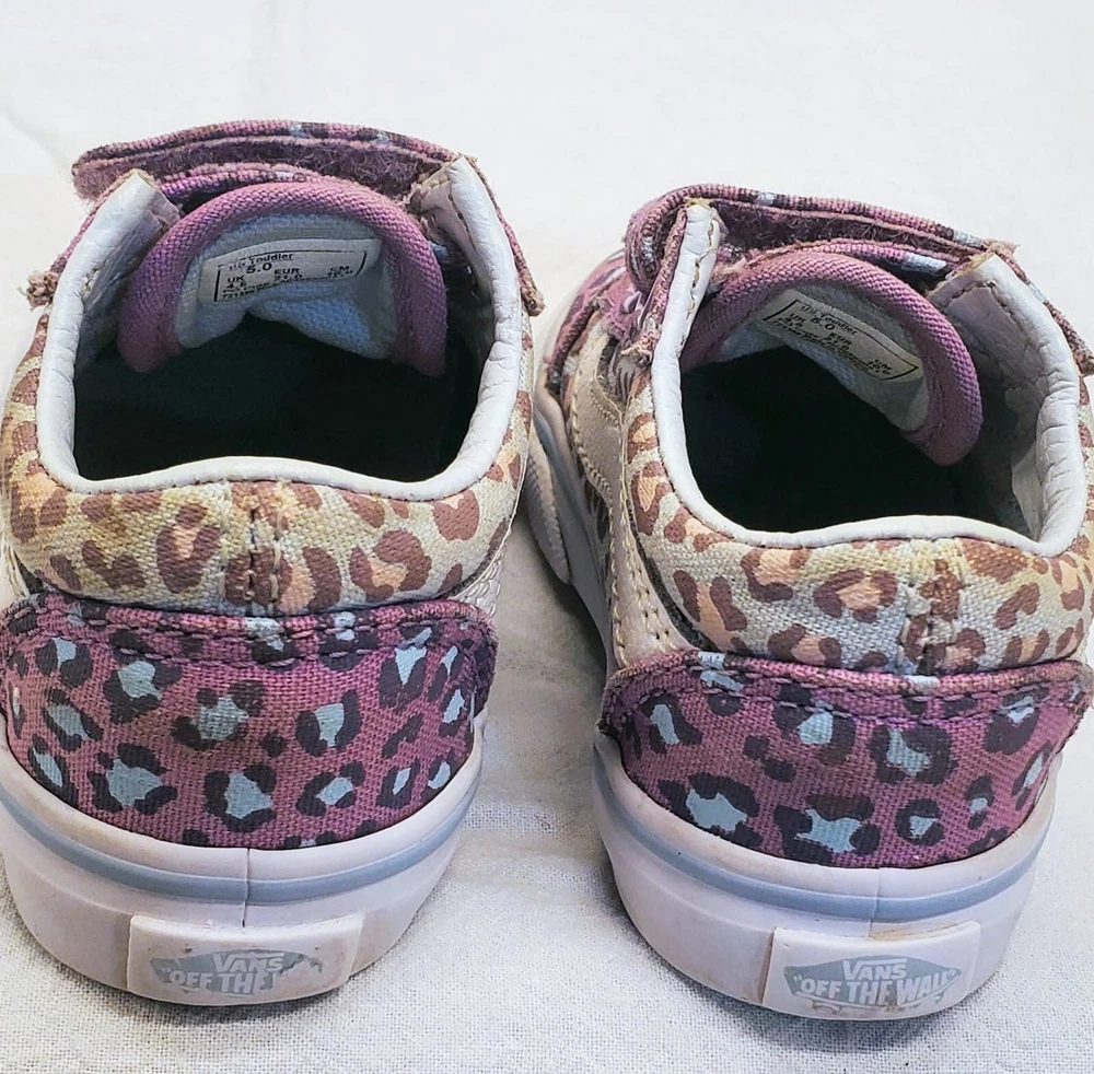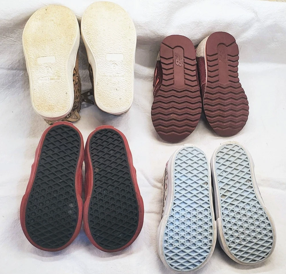 This lot includes 3 pairs of toddler shoes & a pair of boots in size 5 including popular brands as follows: 2 pair of Vans Off The Wall shoes, Self Esteem Boots, and New Balance sneakers. The Vans Off the Wall are a pair of lavender and blue animal print, with hook and loop closure. The other Vans are Off the Wall in solid red with classic red ties. The New Balance are cranberry and gray suede with coral accents, with hook and loop closure. The dessert style boots are tan and animal print zip booties with embroidered cat face on the back, this style is called Kitty Kicks. These are all in gently used condition with little visible wear. Please check all photos, as these shoes have lots of life left! This lot of athletic sneakers are perfect for little ones who want to stay stylish and comfortable.