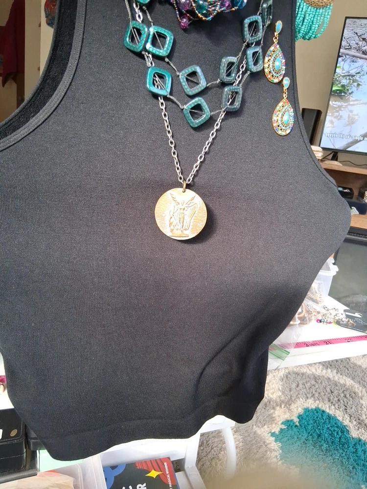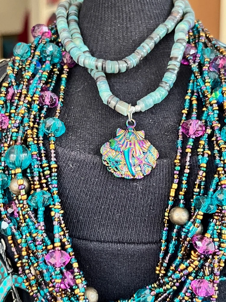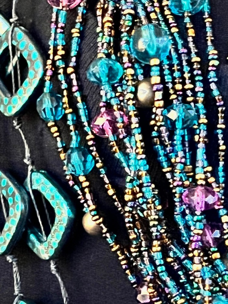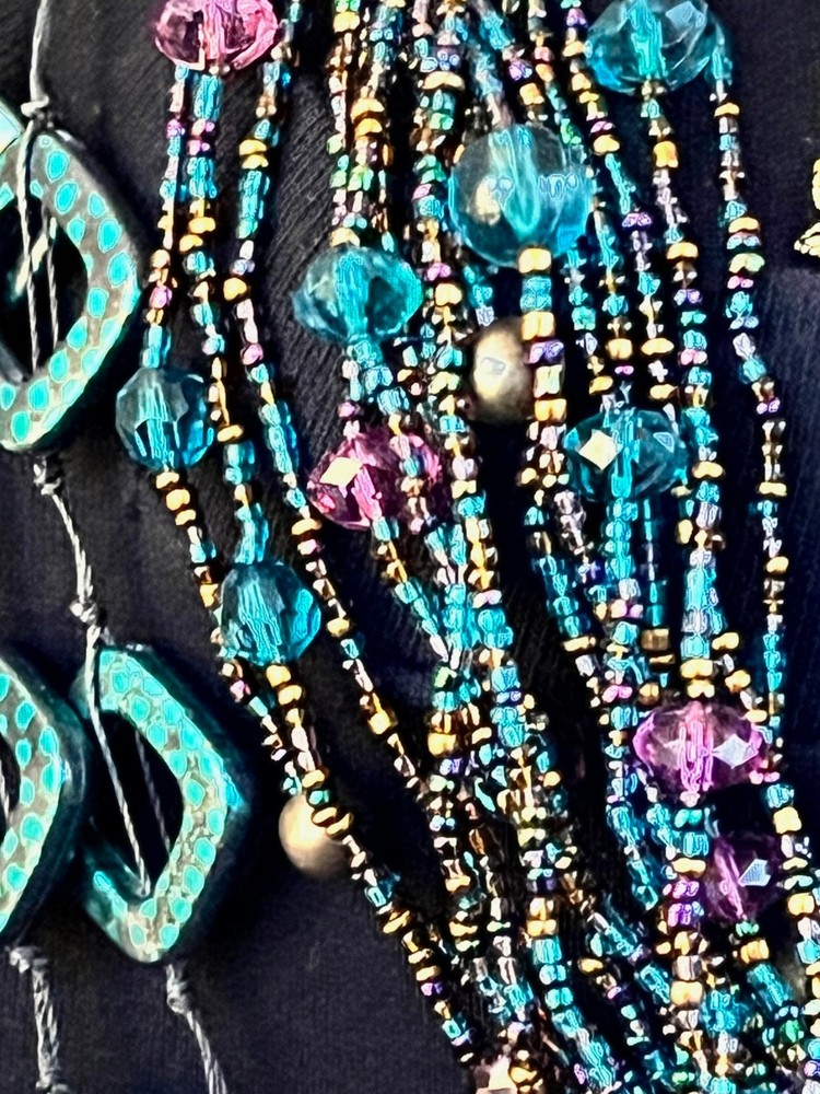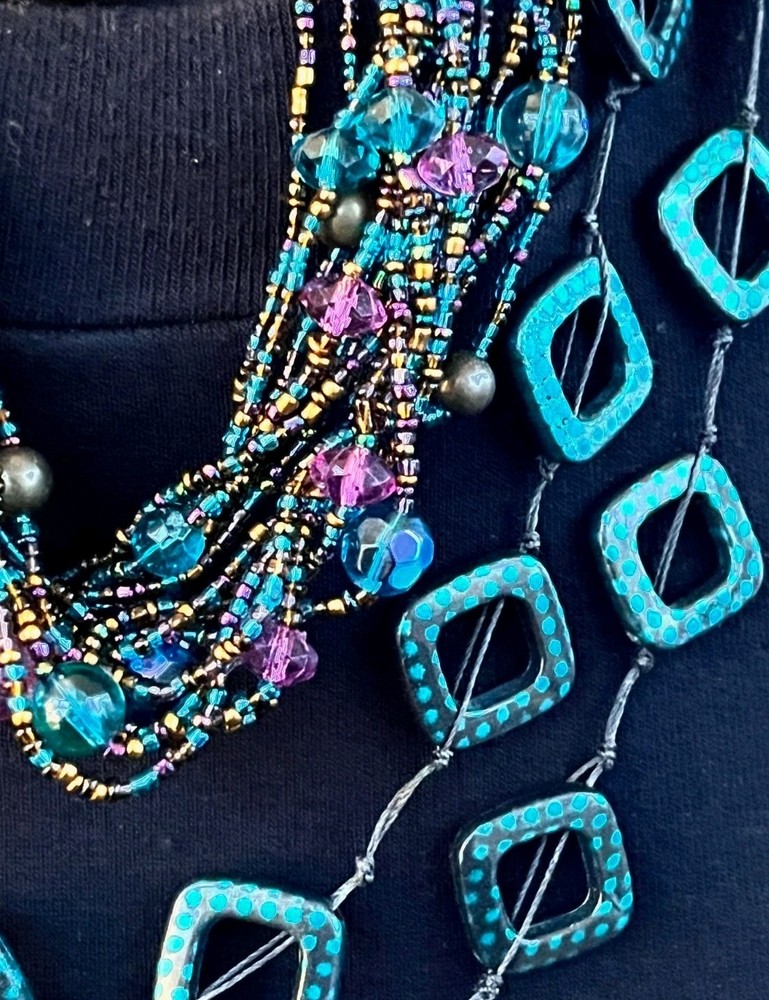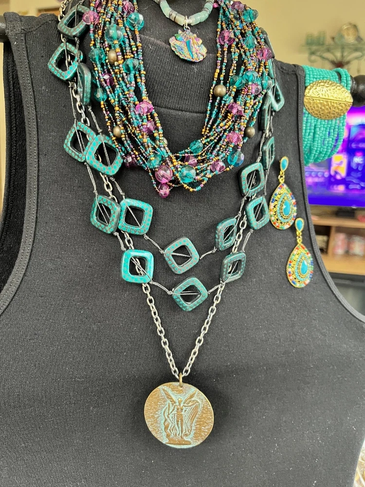 This lot includes 4 gorgeous necklaces, 1 pr earrings, and a 13 strand bracelet in shades of teal blues. The photos barely show the teal shaded background of fairy reversible amulet. The vintage-inspired pieces feature a mix of materials like shell, glass, plastic, acrylic, and crystal, with a beachy, bohemian, and ethnic theme. The set is reversible and includes a pendant, perfect for adding a touch of glam to any outfit. If you choose to auto-pay beyond one week, please contact me ahead of time. Please check your eBay messages for updates 💕 *Any wear, oxidation or discoloration (for example near/on clasps) is comparable with the age and pre-loved nature of the pieces I list. **Items may need a gentle wipe down. ***I price fairly based on market comparables when available. ****Please pay promptly. I hold for 2 days unless otherwise arranged, but not beyond 1 week. If paying with Auto Pay, please eBay message me if u need more than 1 week out. *****I'd like this experience to be fun. 💕Good luck! Live Generously 💕