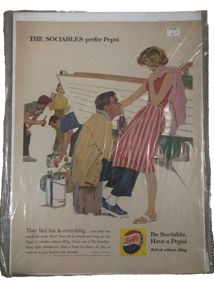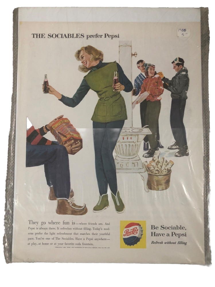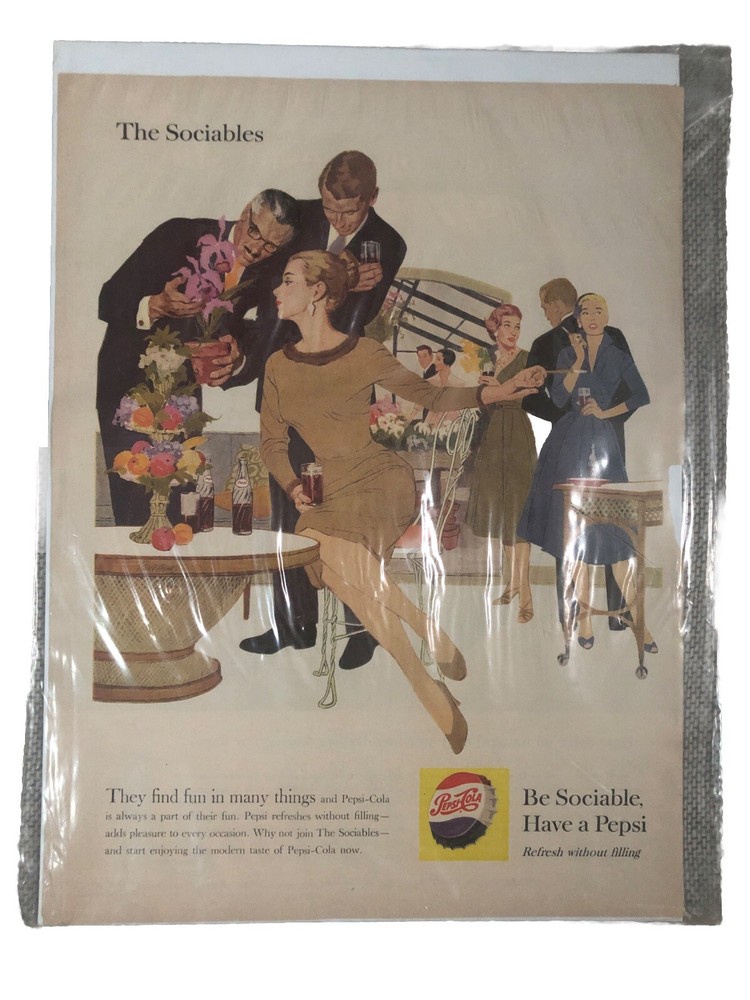 Explore a vintage collection with this lot of 6 original Pepsi-Cola print ads from the 1950s. These authentic advertisements showcase the classic branding and vibrant illustrations that have made Pepsi a household name for generations. Each piece offers a unique glimpse into the past, featuring the iconic Pepsi logo and script in a multi-colored palette that captures the essence of the era. Ideal for collectors and enthusiasts of retro Americana, these ads are an original production, not reproductions, ensuring you own a true piece of Pepsi history. The Sociables series encapsulates the soda theme with timeless appeal, making it a standout addition to any advertising collection or a nostalgic decor enhancement for your home or office.