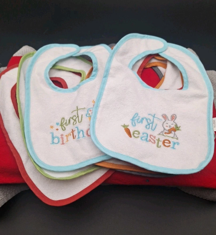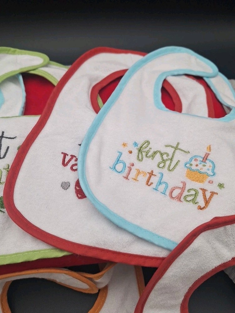 This lot of 7 cute baby bibs features a holiday and celebration-themed design, perfect for adding some festive charm to mealtime. Made of soft cotton material, these bibs have a Velcro closure for easy on and off. The bibs showcase various holiday characters and motifs, making them a fun and functional addition to your baby's feeding routine. Ideal for capturing drool and spills during mealtime, these bibs are sure to bring joy to both parents and little ones during special occasions.