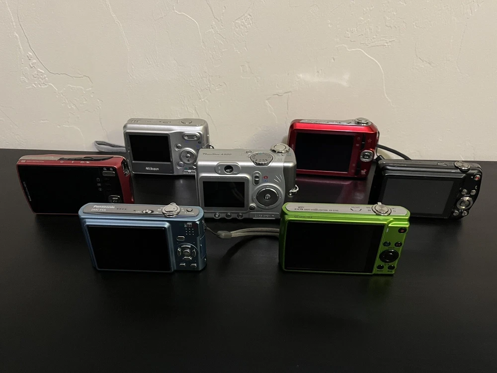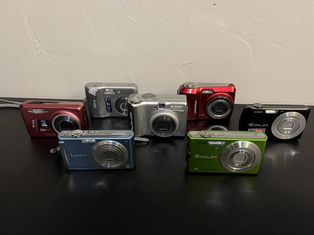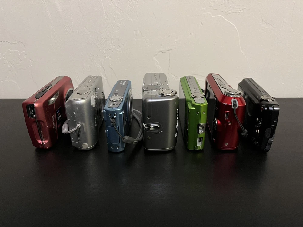 Lot Of 7 Digital Cameras: Canon, Nikon, Kodak, Lumix, & Casio - ALL SHOULD WORK! 3 of the cameras that take AA batteries have been tested recently and work well. Of the other 4, 2 have batteries, 2 don't. The other 4 have not been tested in a while but worked perfectly fine last time they were used. I would be very surprised if the other cameras and if multiple of them end up having issues I would be happy to accept a return. The Canon camera comes with some cords a camera bag and some manuals. Camera condition varies. See photos for condition. Feel free to message me with any questions!