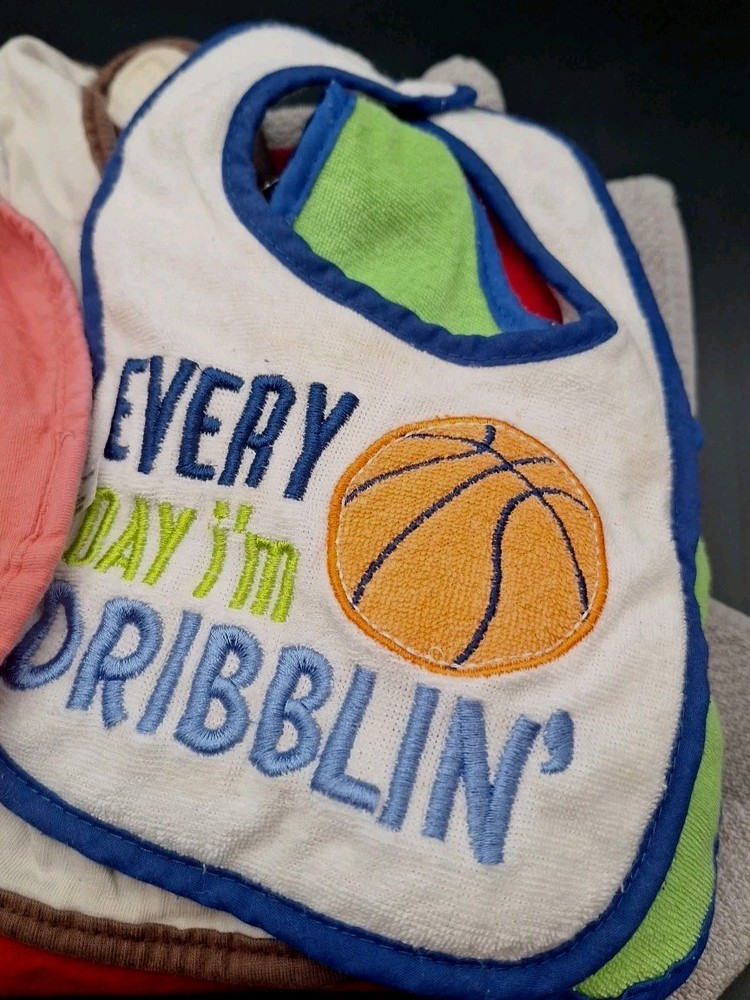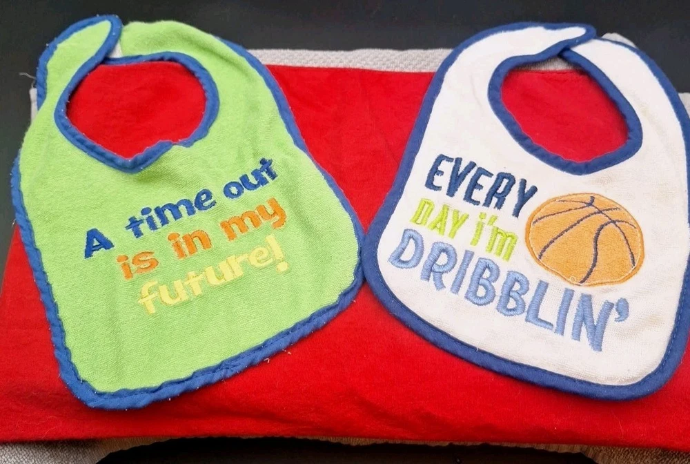 This bundle includes 8 baby-toddler bibs for boys and girls, featuring fun sayings themed for mealtime. Made of cotton with a holiday theme, these drool bibs have convenient velcro closure and snap closure for easy use. Personalization is not available, but the bibs are designed with a festive spirit for celebrations.